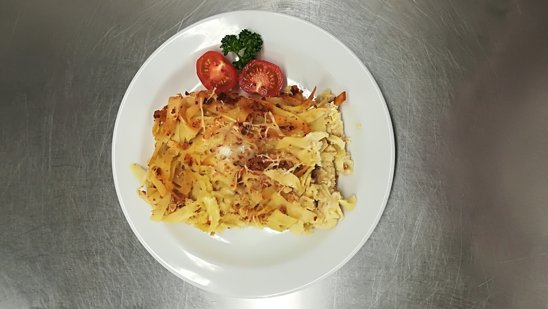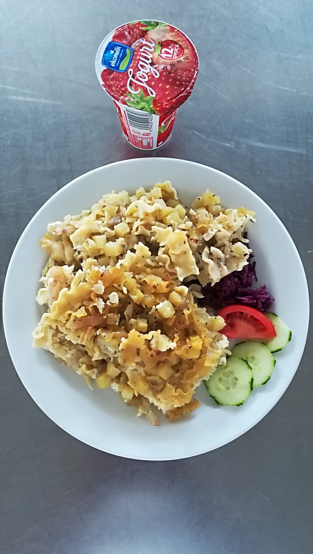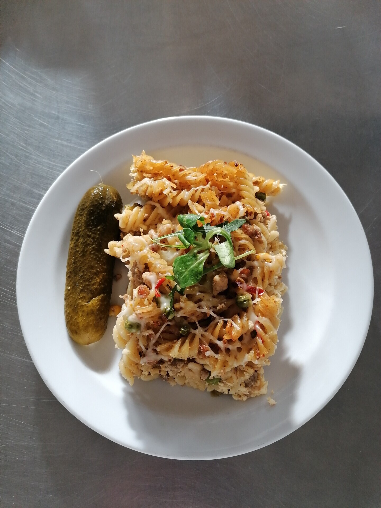 Zapečené těstoviny s vepřovým masem, zeleninou a sýrem, sterilovaná okurka