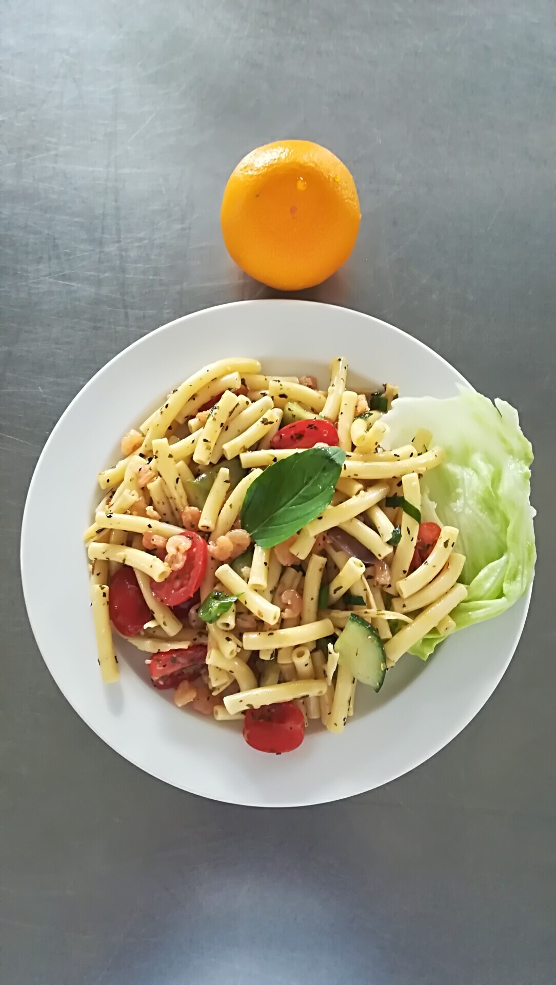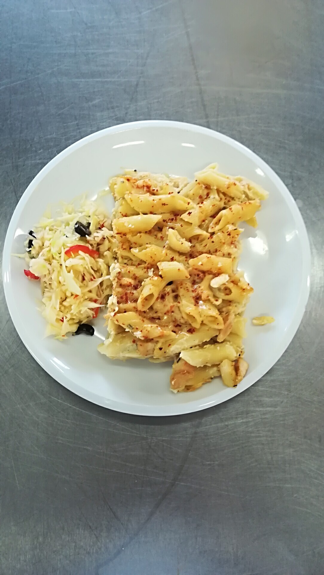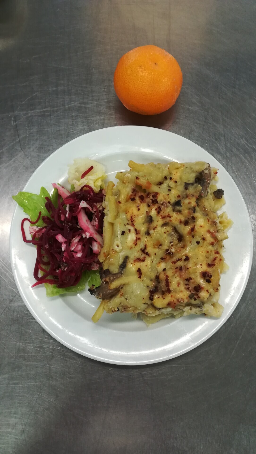 Zapečené těstoviny s vepřovým masem, zeleninou a sýrem, sterilovaná okurka