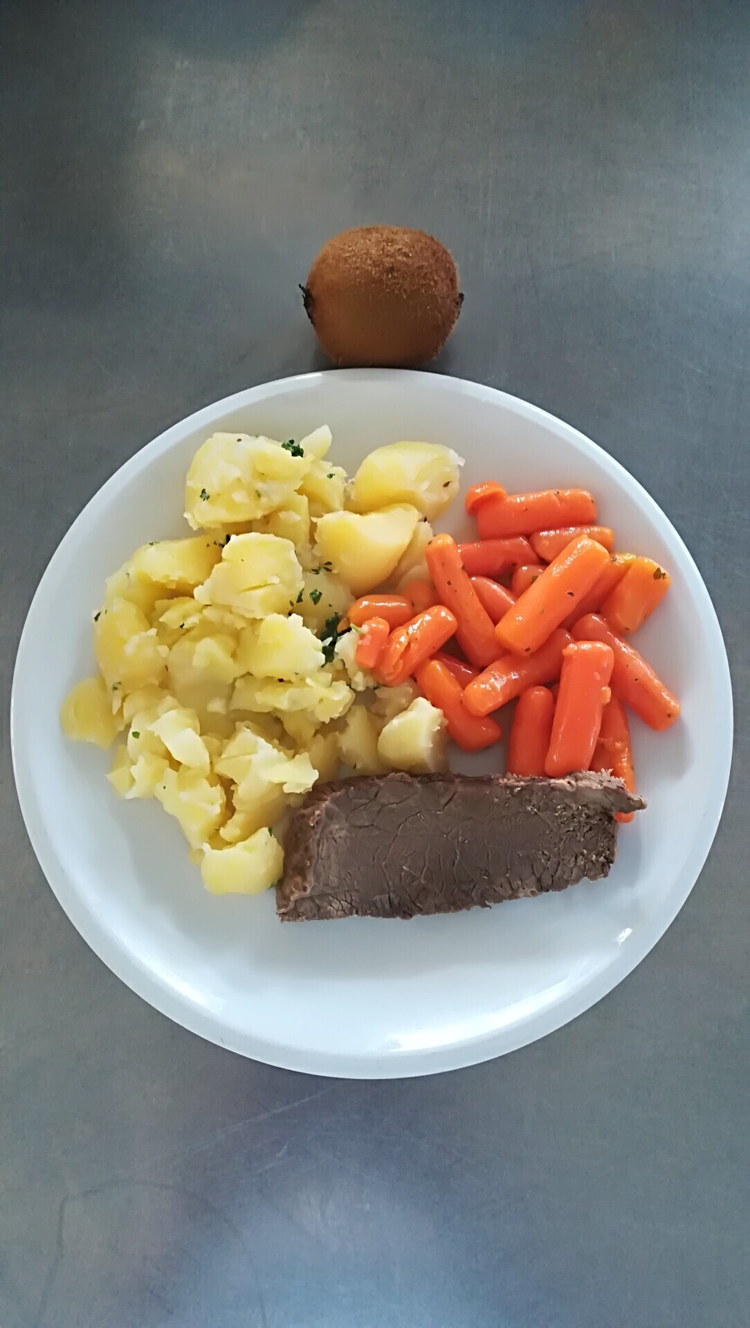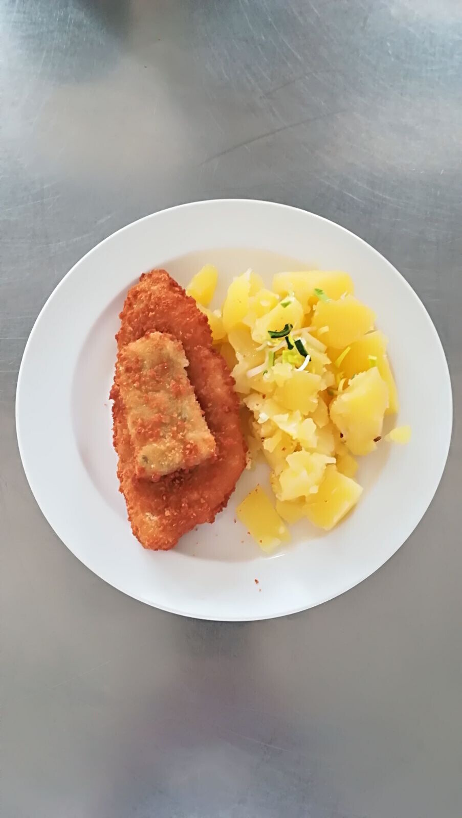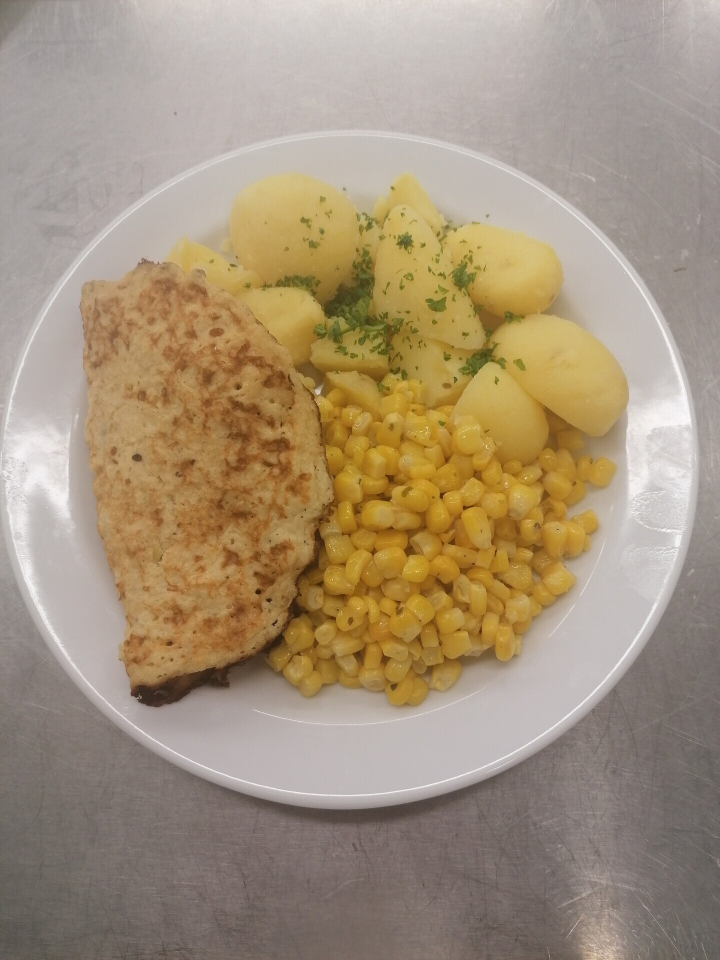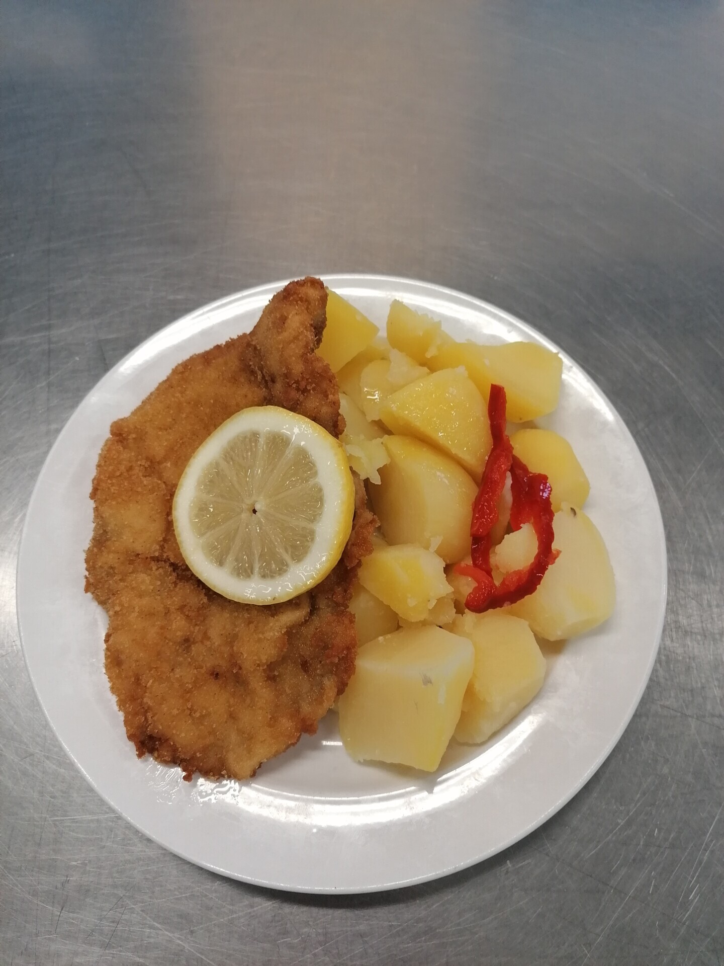 Vepřový plátek, dušená mrkev, vařený brambor