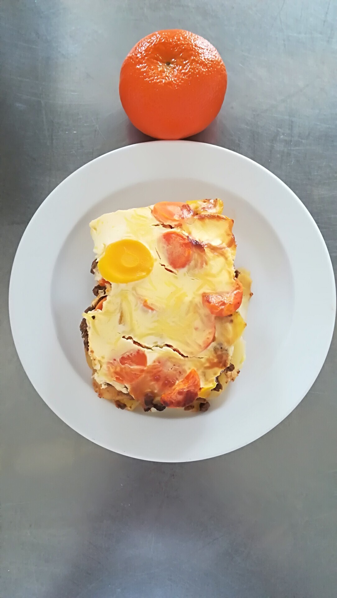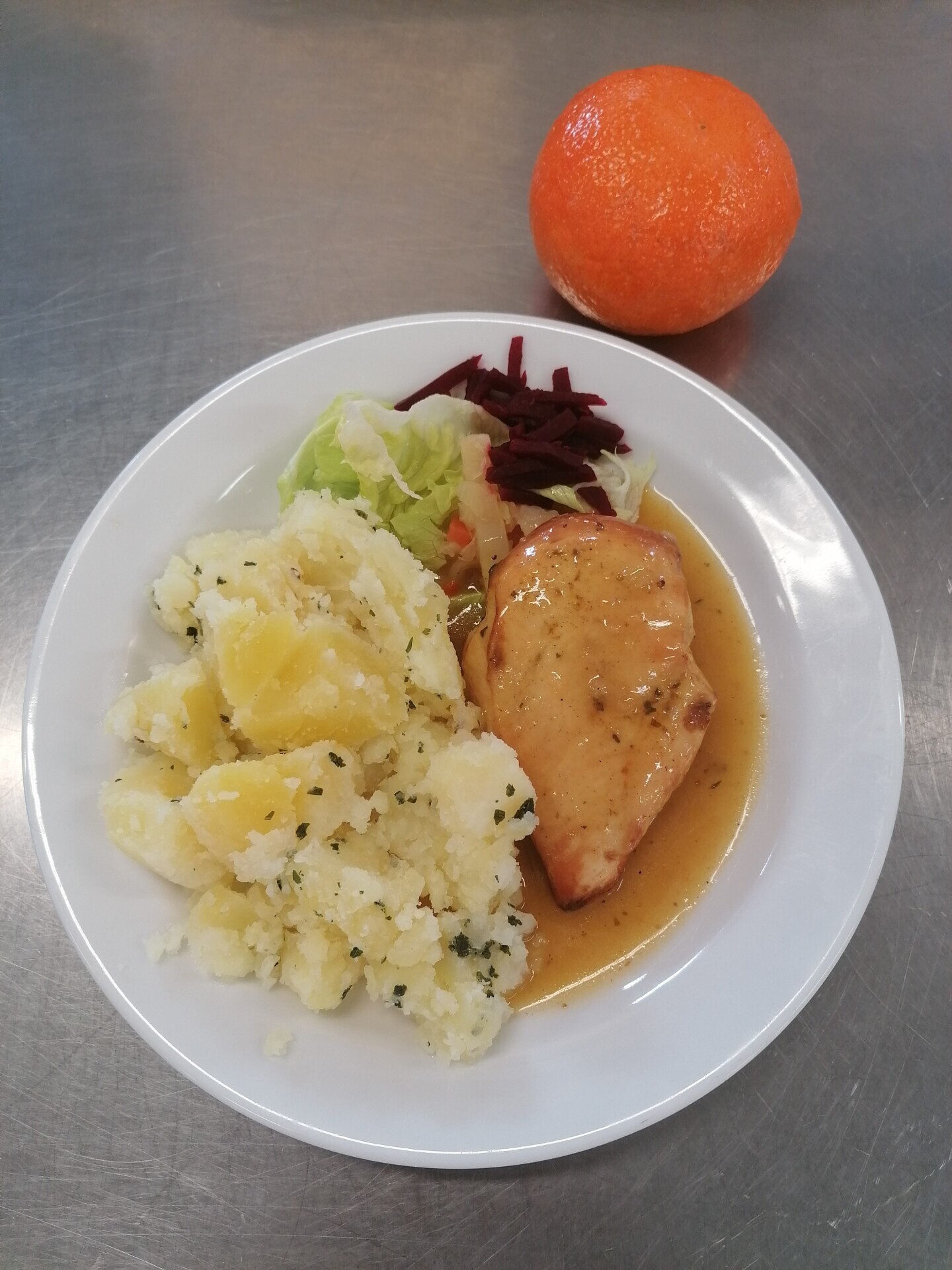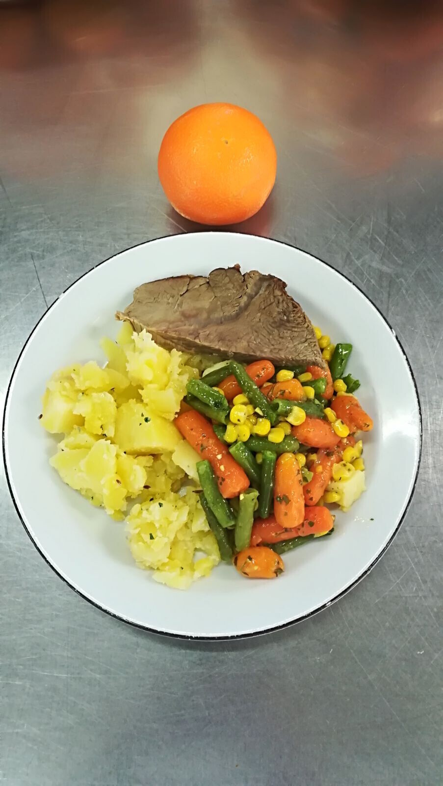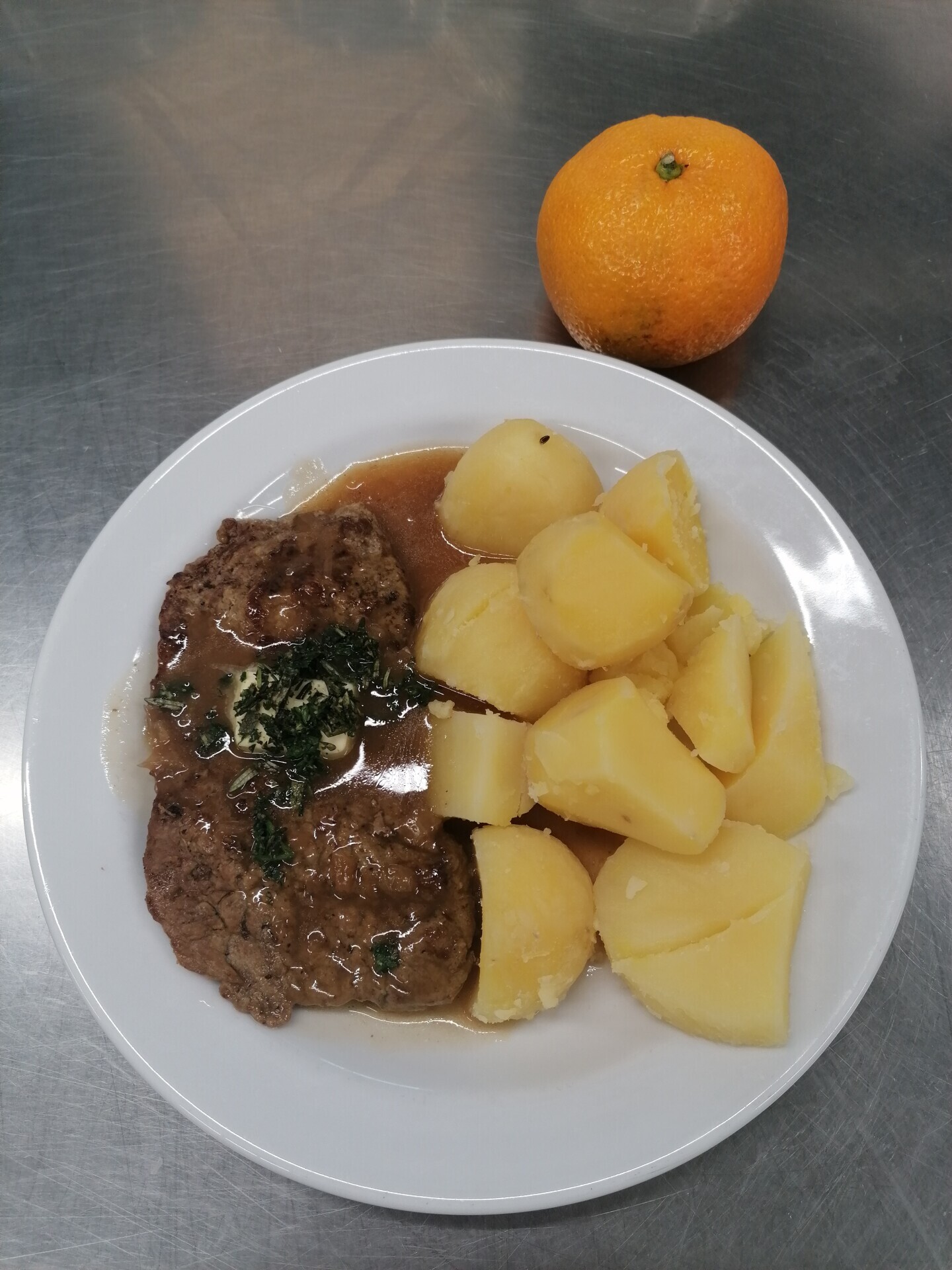 Vepřový plátek, dušená mrkev, vařený brambor