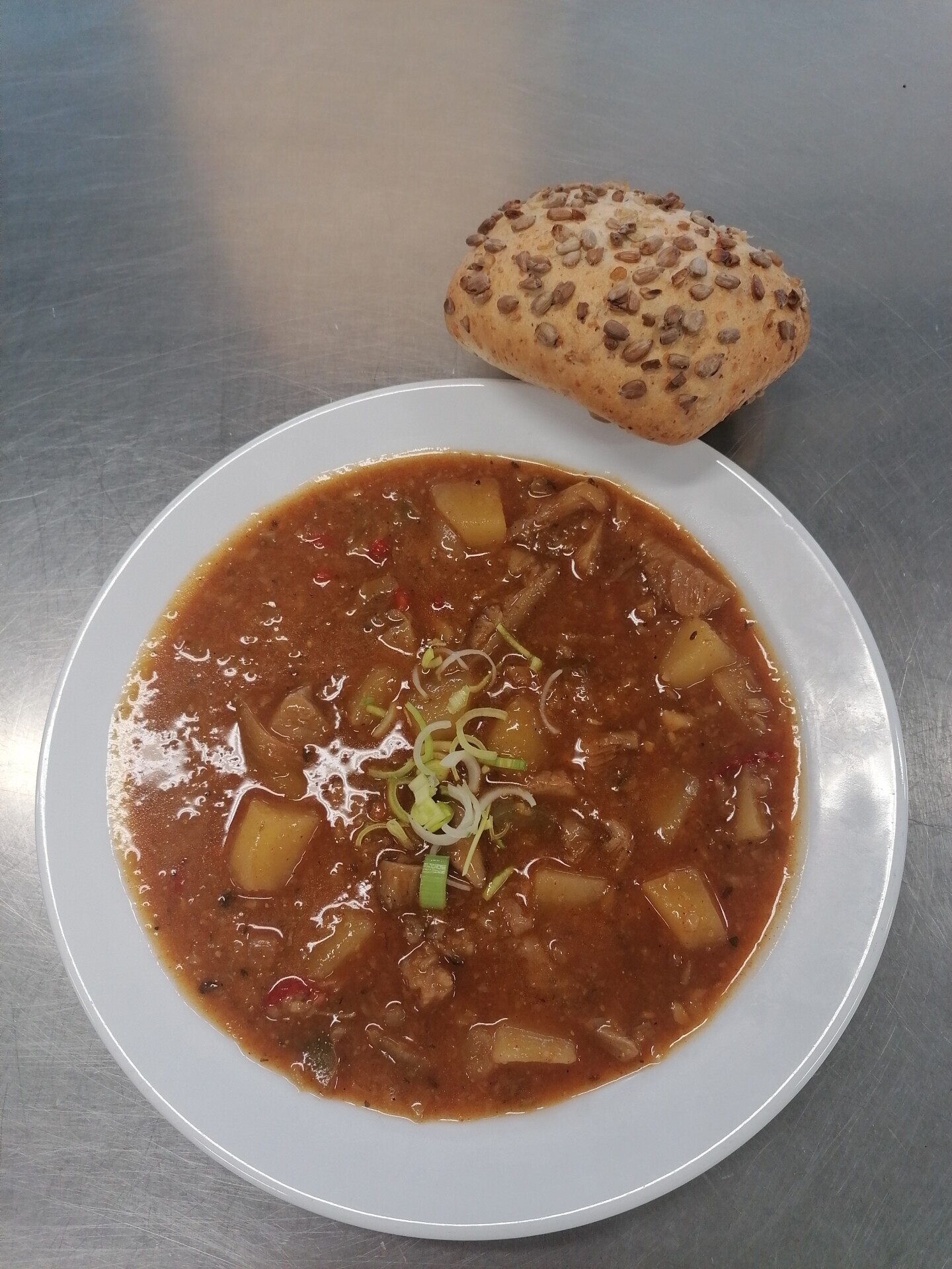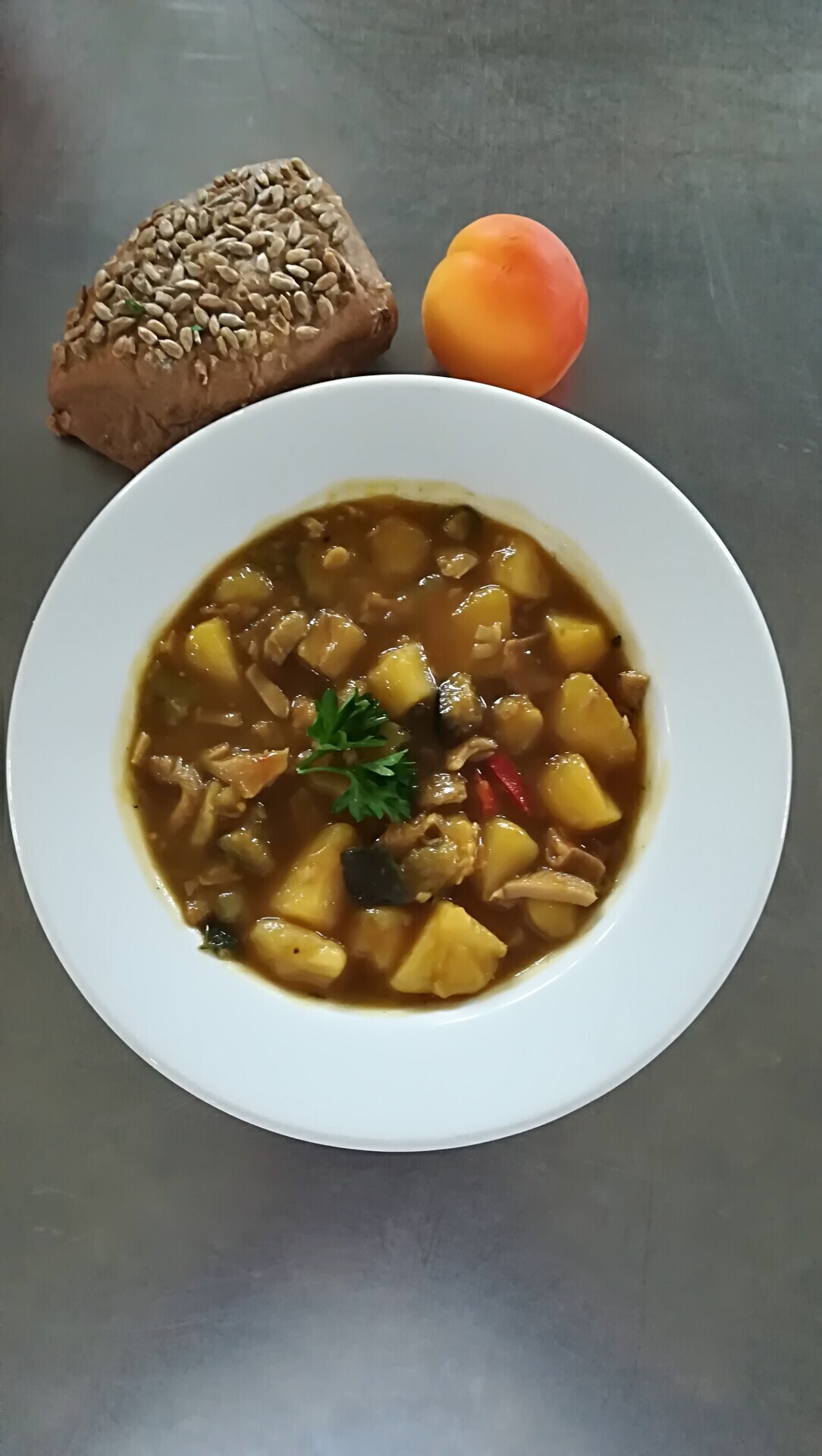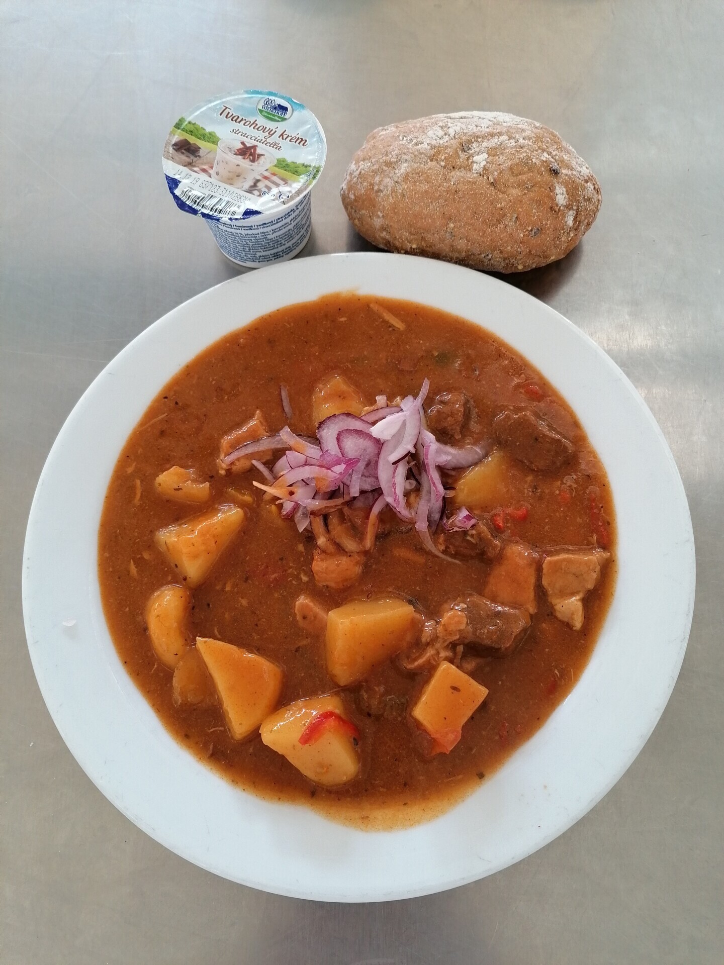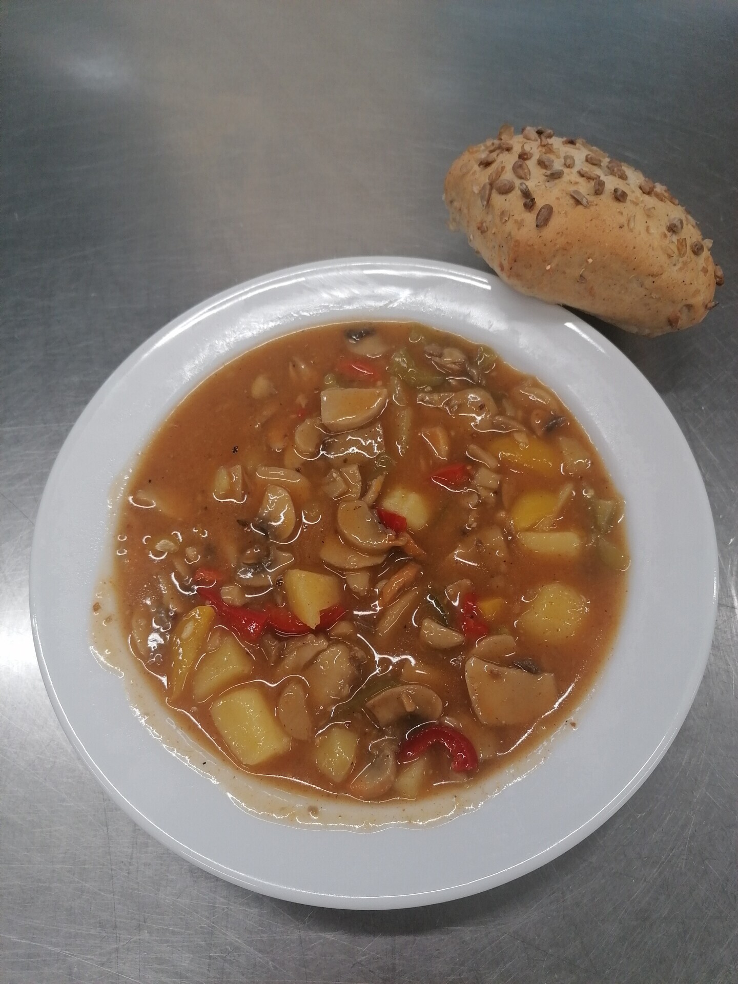 Žampionový guláš (žampiony, brambory, paprika), pečivo