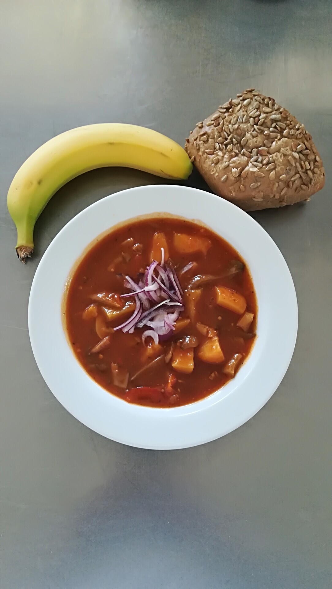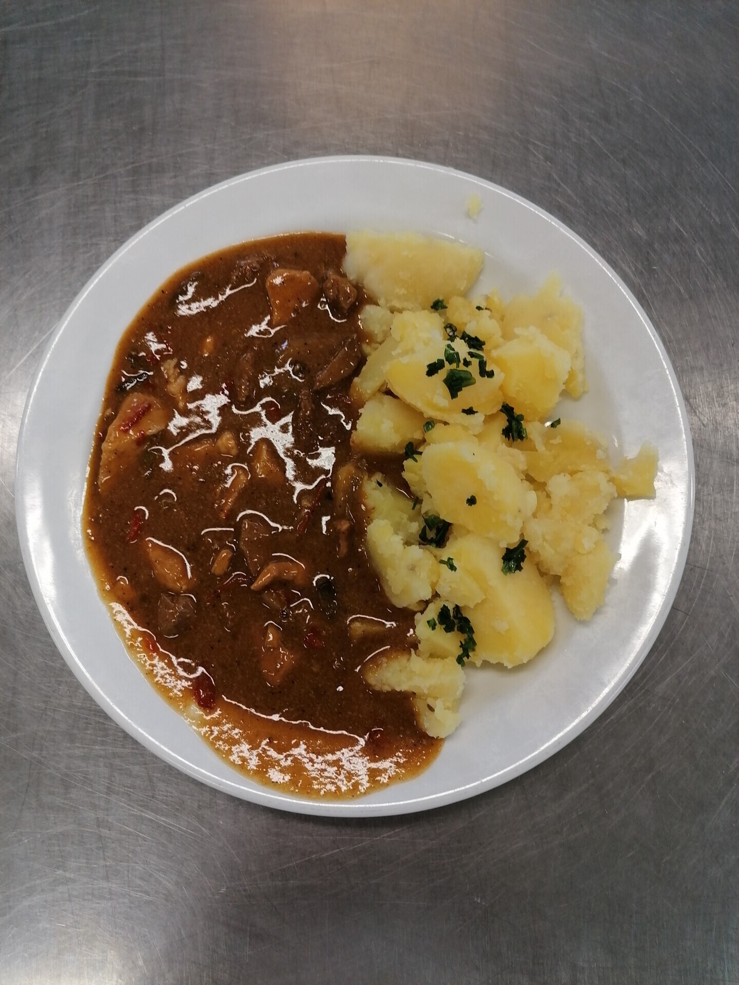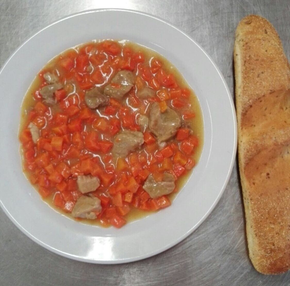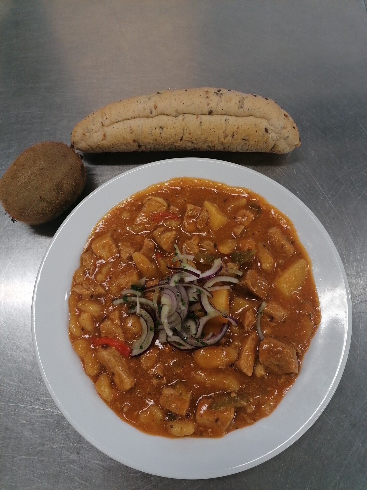 Žampionový guláš (žampiony, brambory, paprika), pečivo