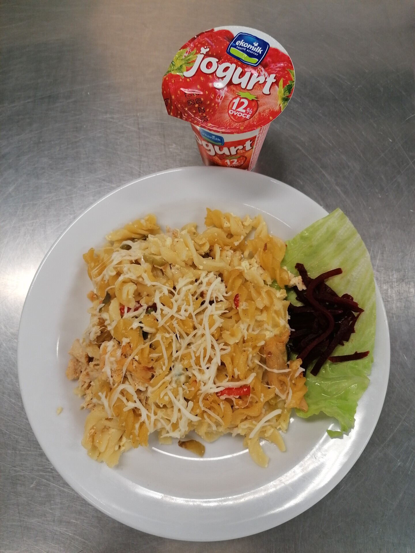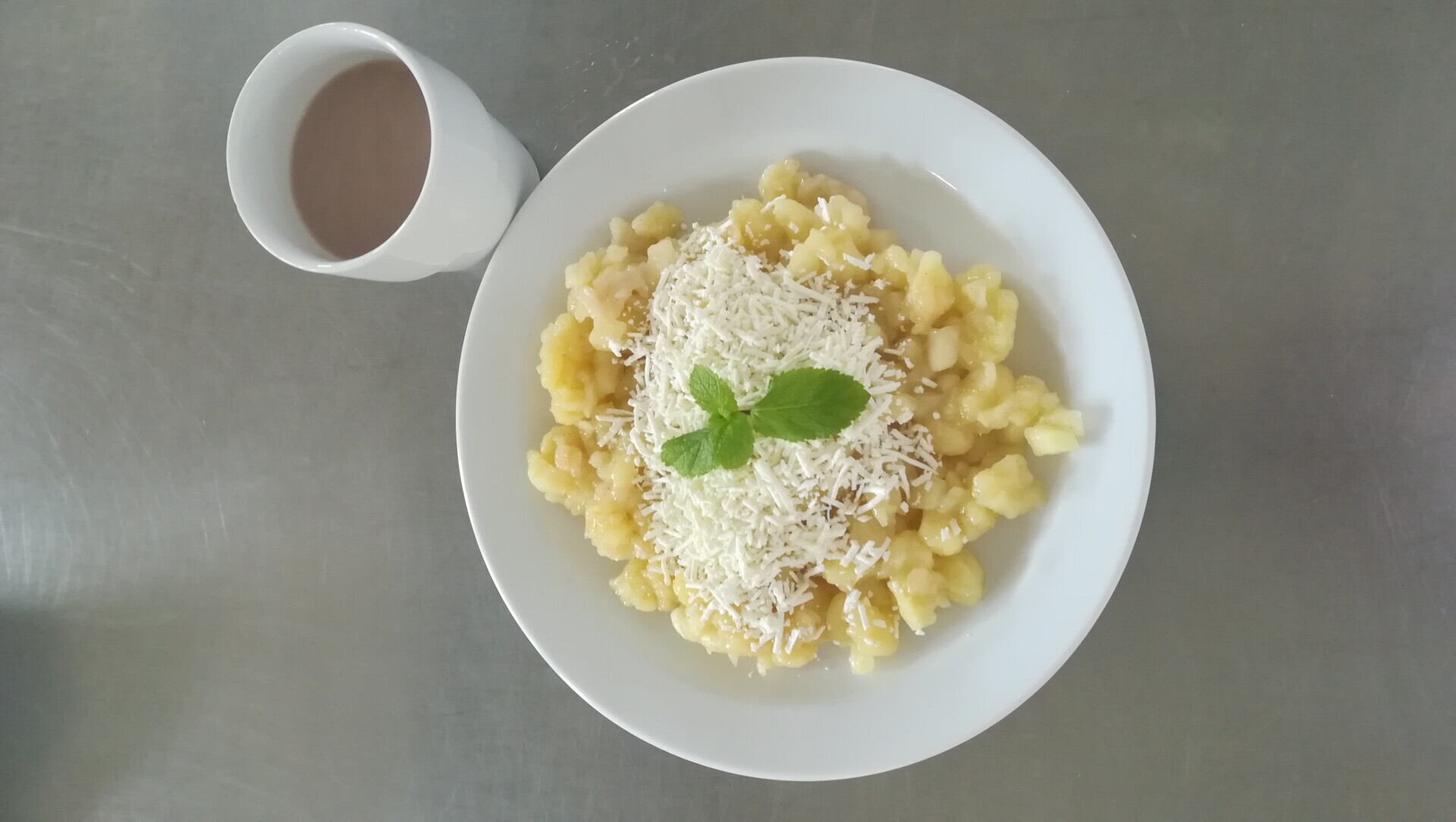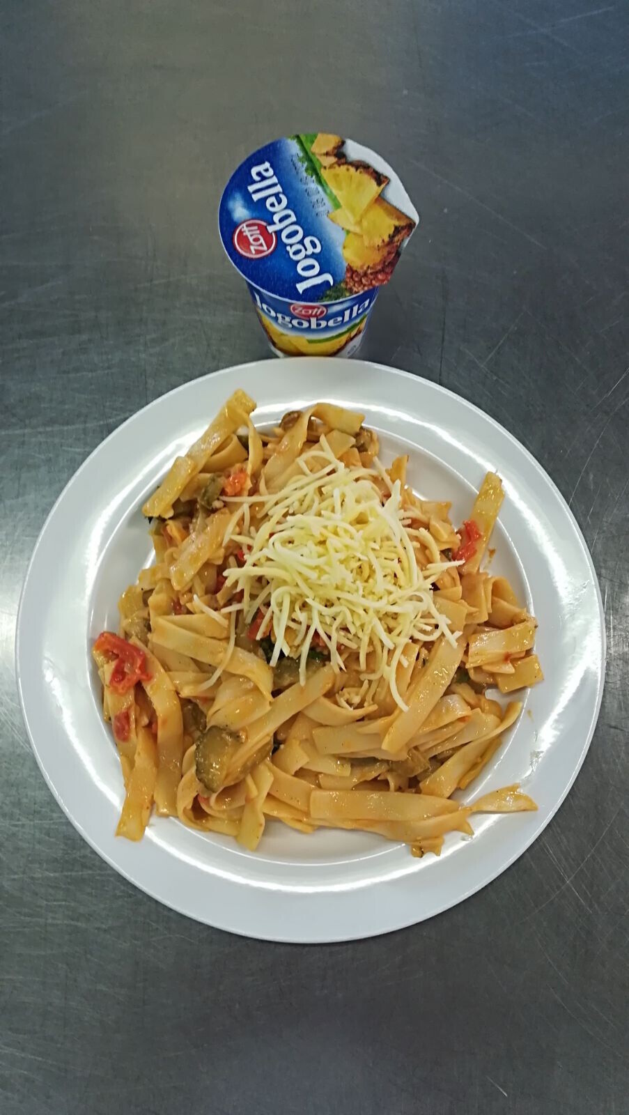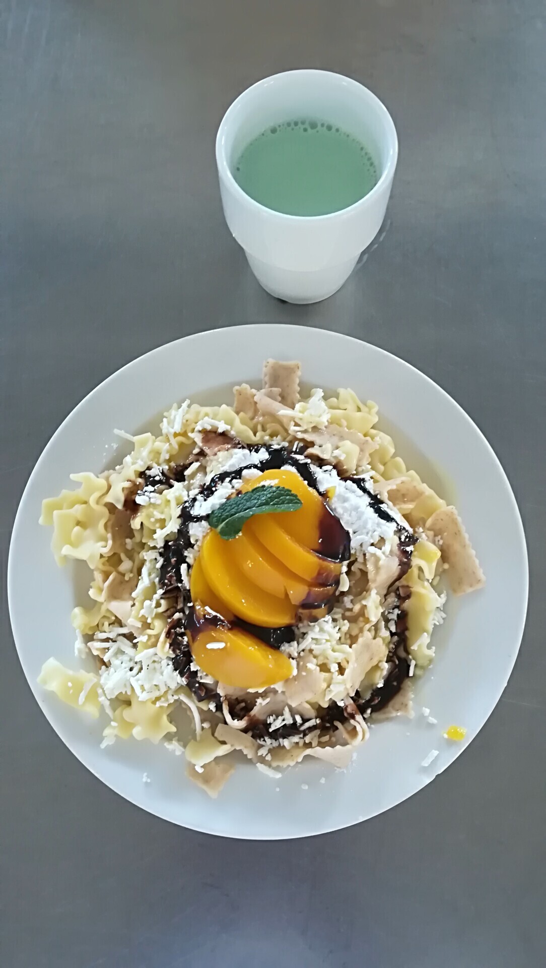 Duo těstoviny s tvarohem a broskví, ochucené mléko
