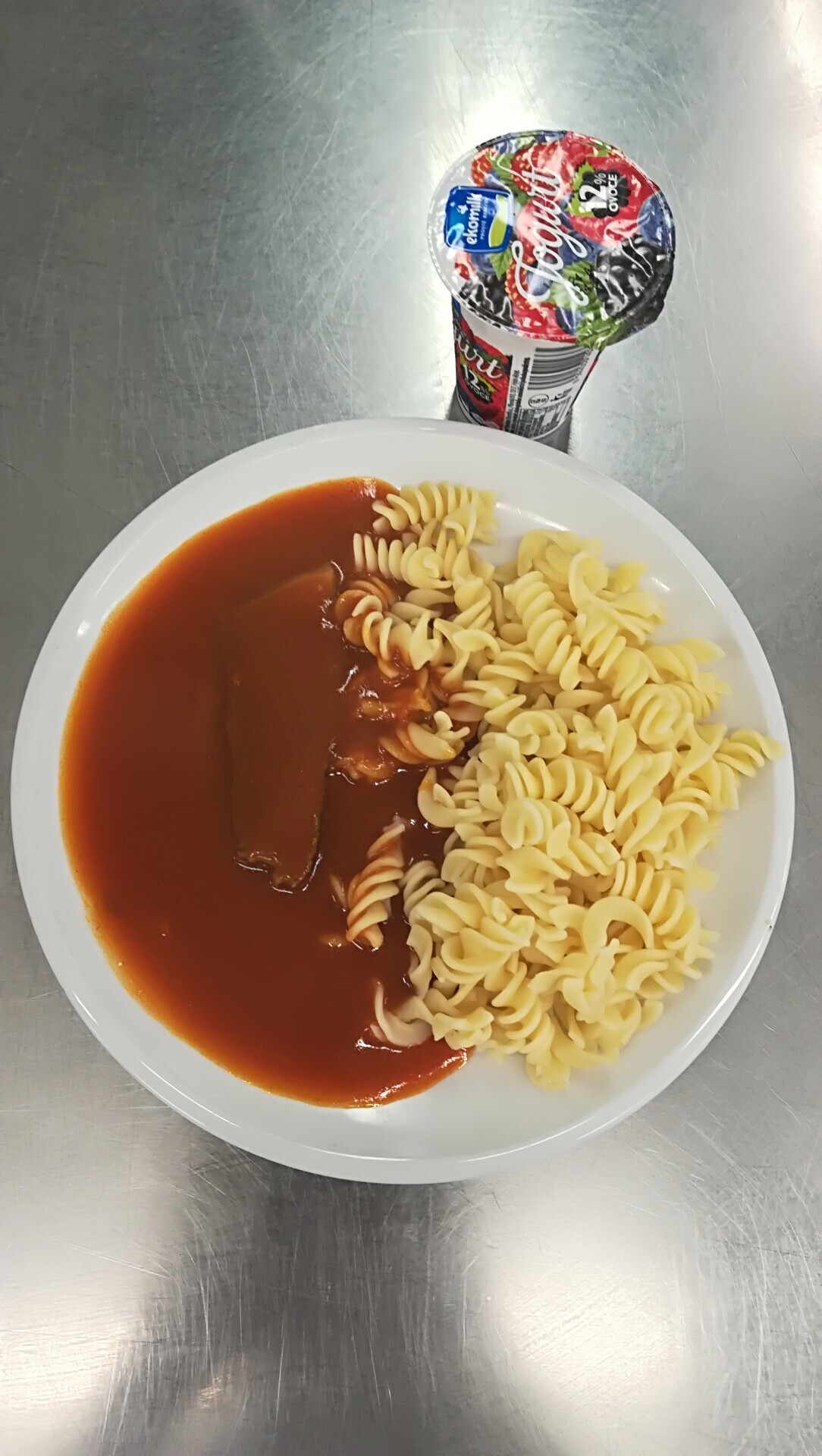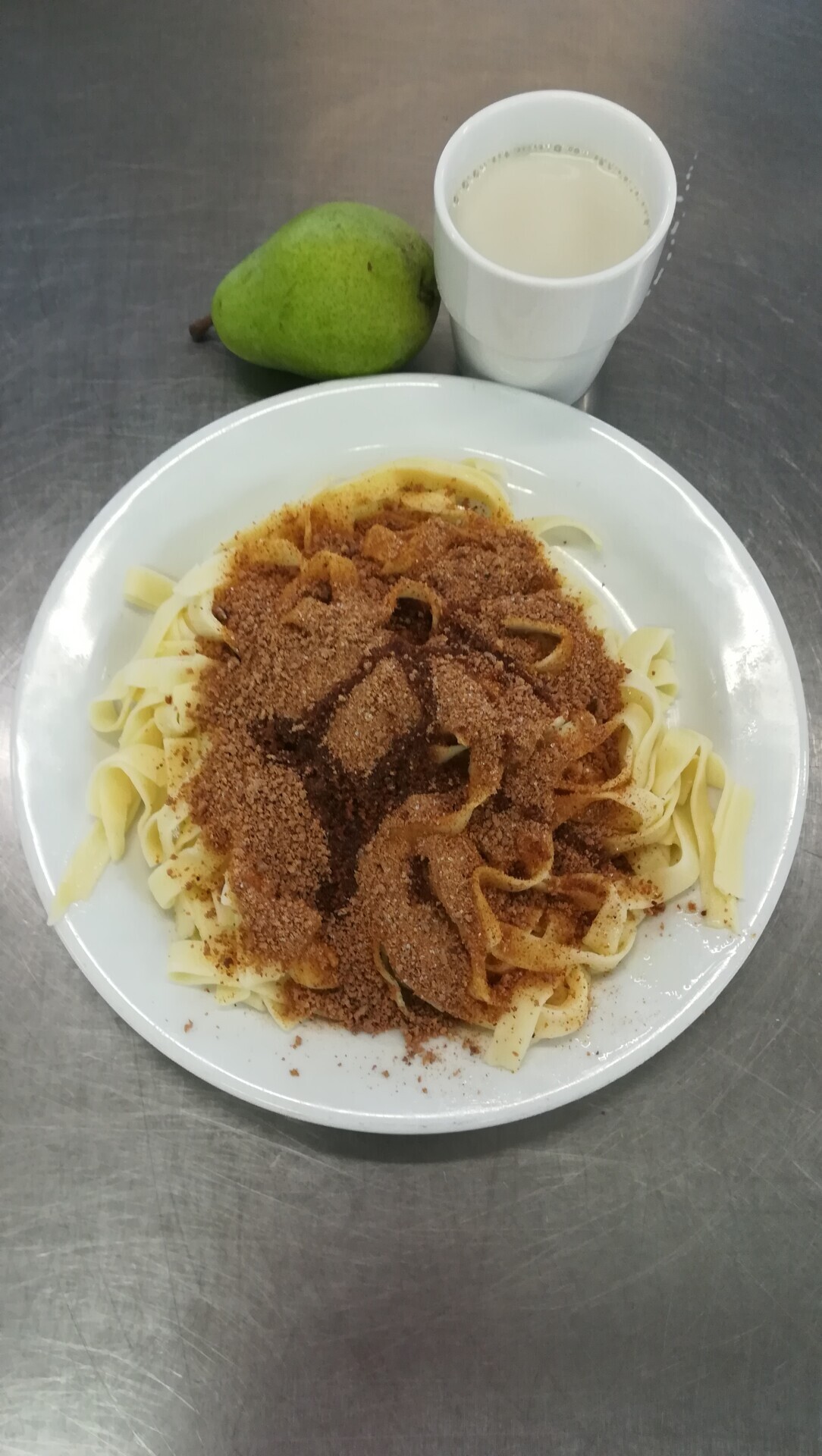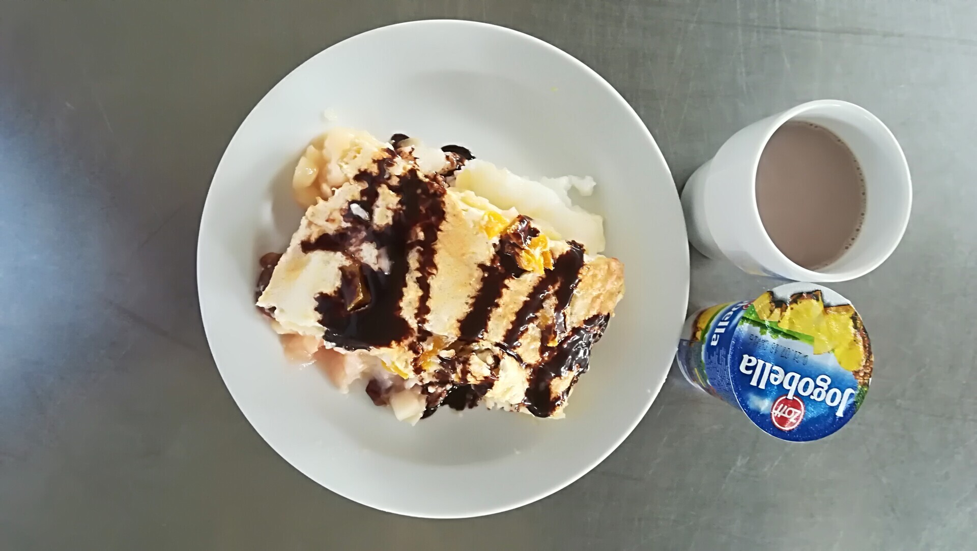 Duo těstoviny s tvarohem a broskví, ochucené mléko