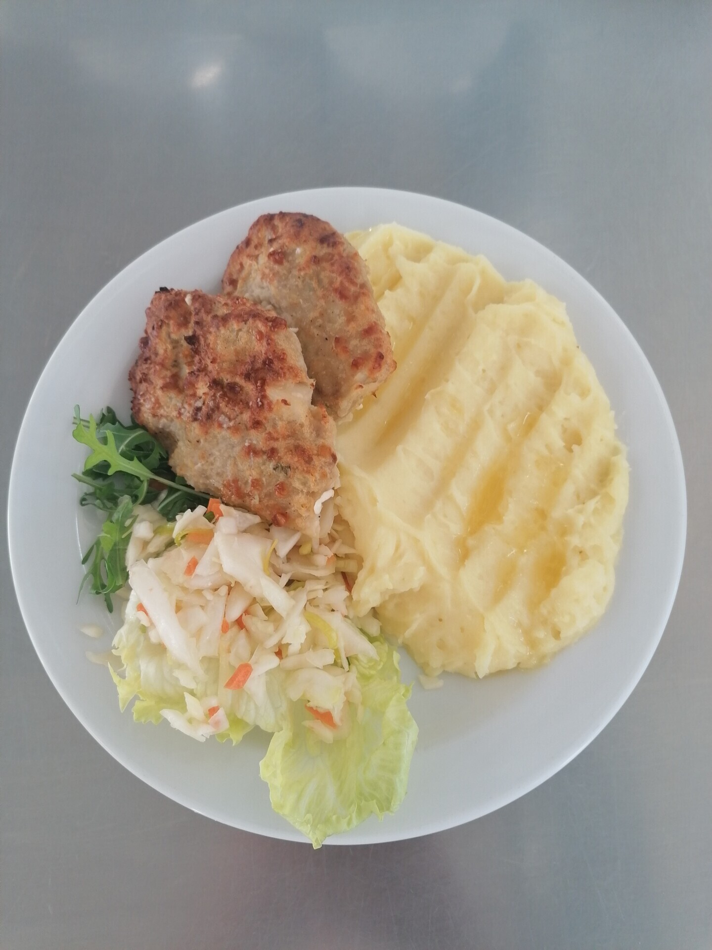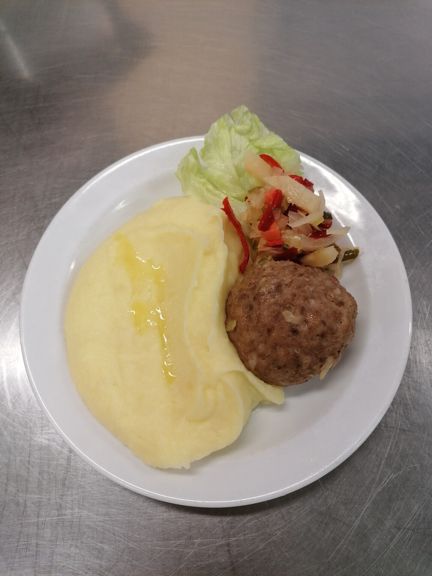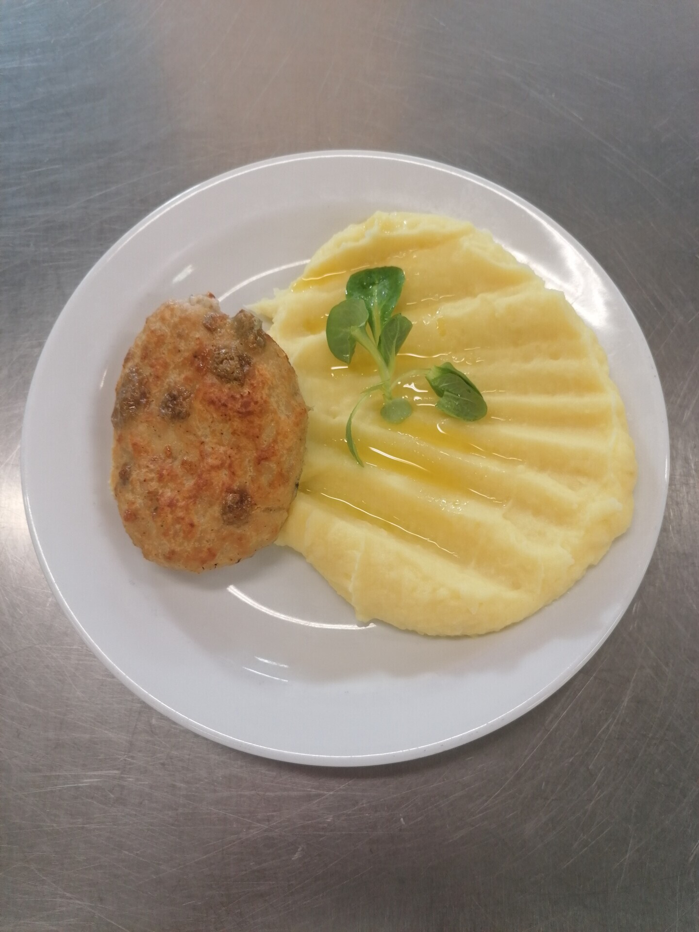Biftek z mletého masa se sýrem, bramborová kaše