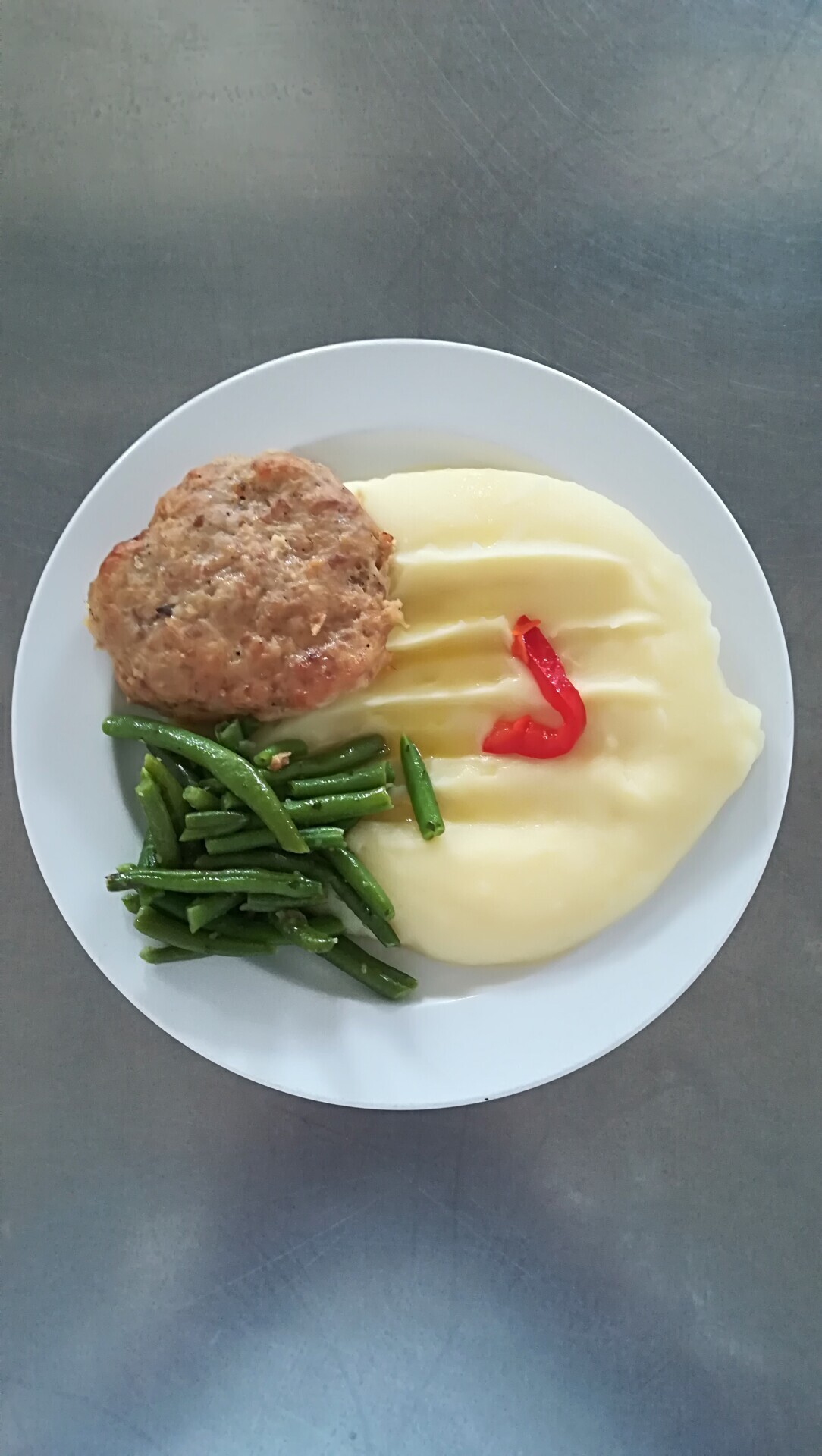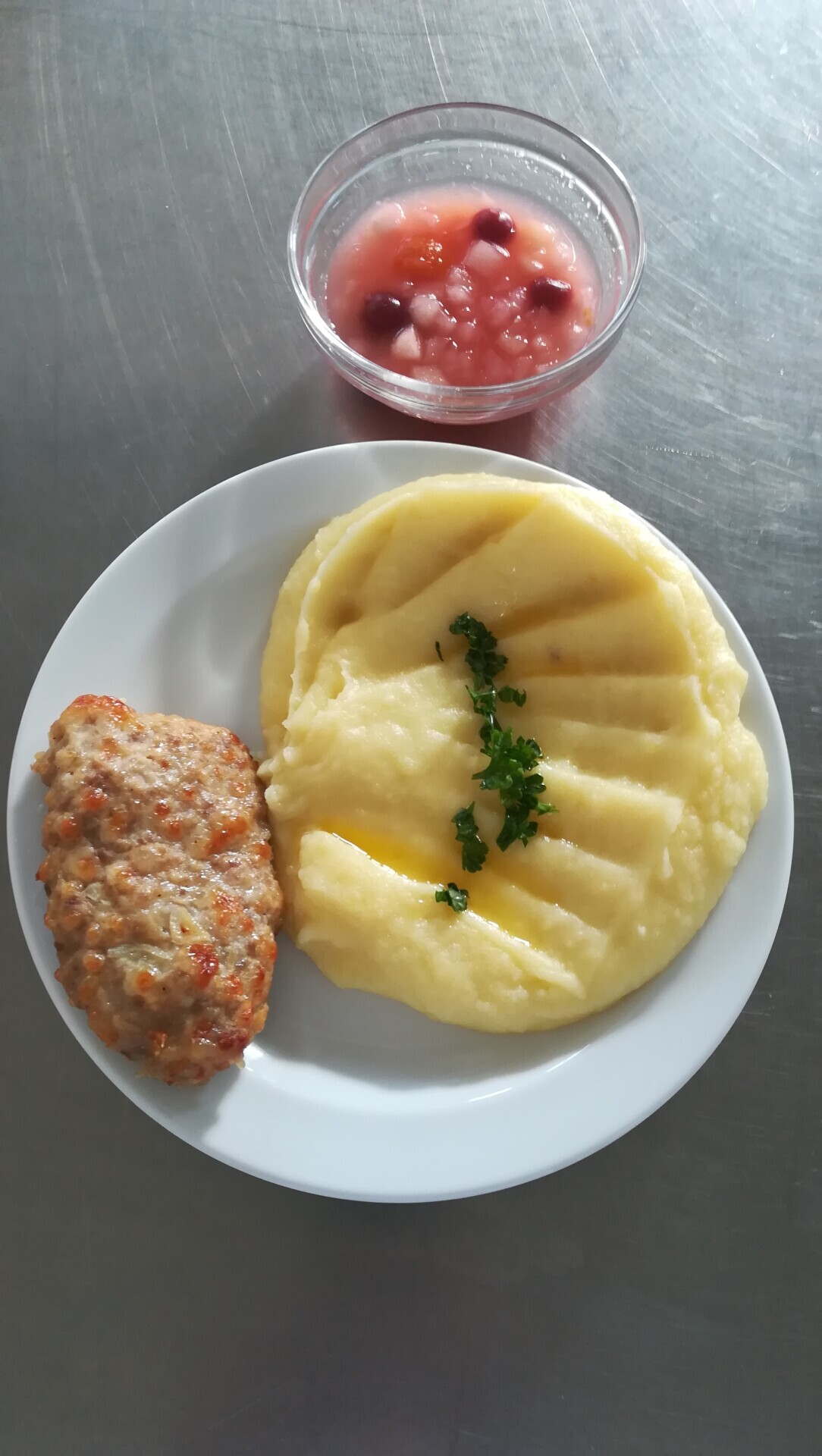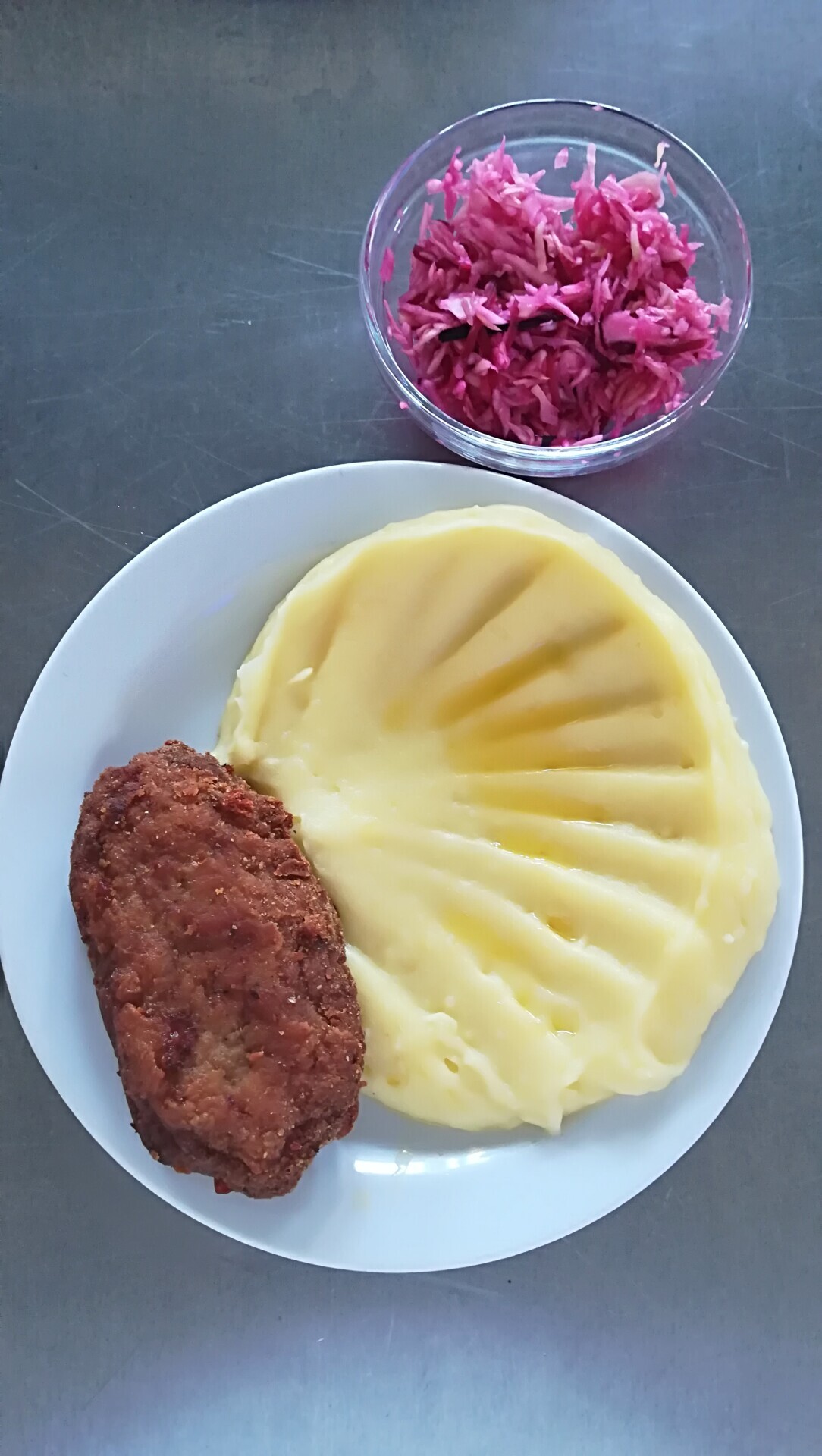 Biftek z mletého masa se sýrem, bramborová kaše