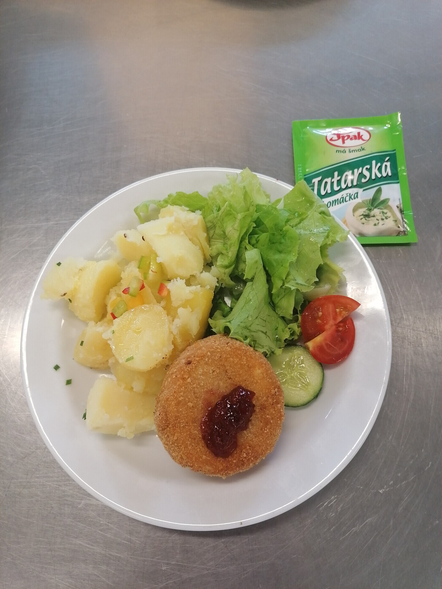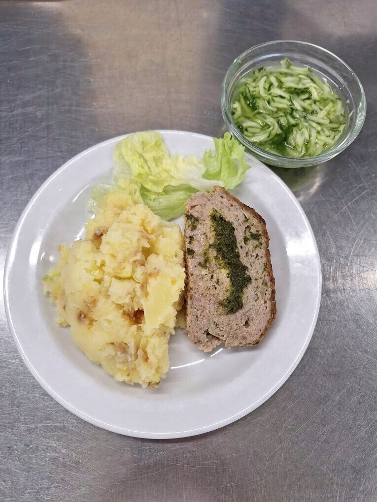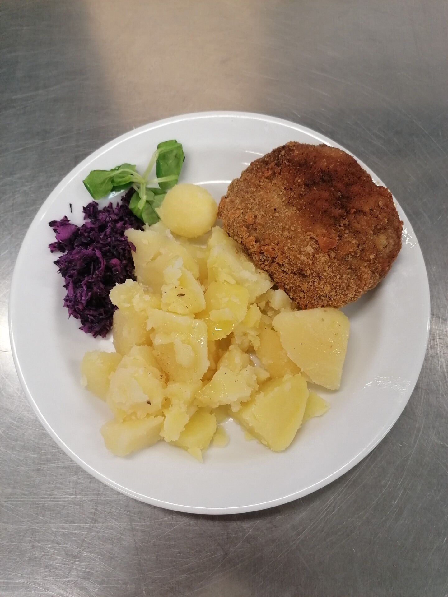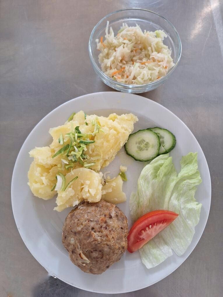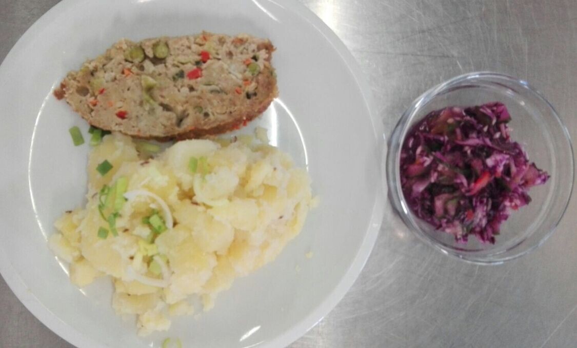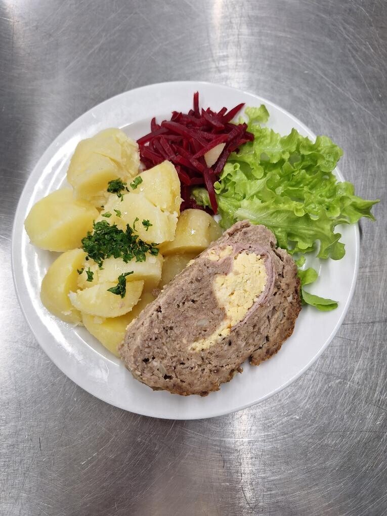 Zahradnická sekaná se sojovým masem, vařený brambor, zeleninový salát