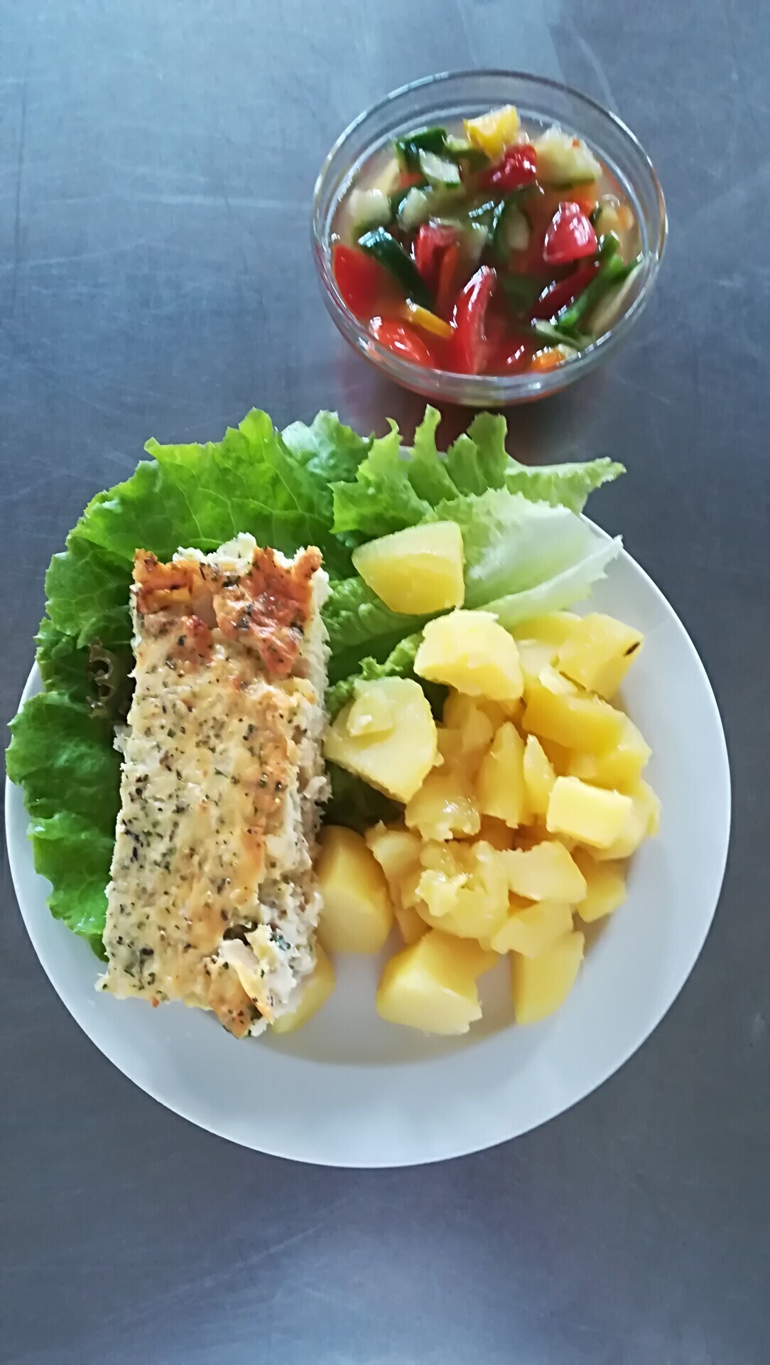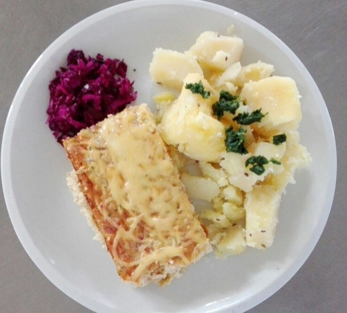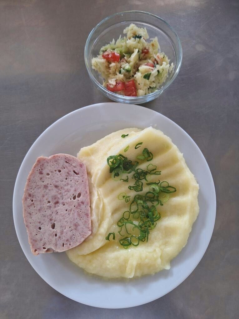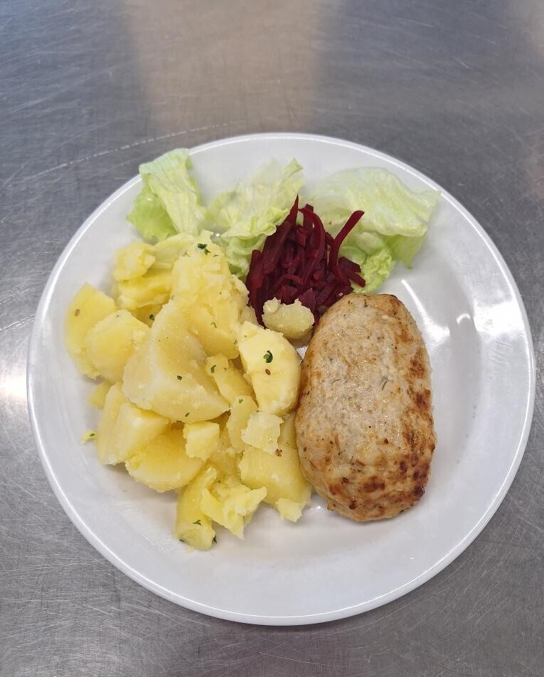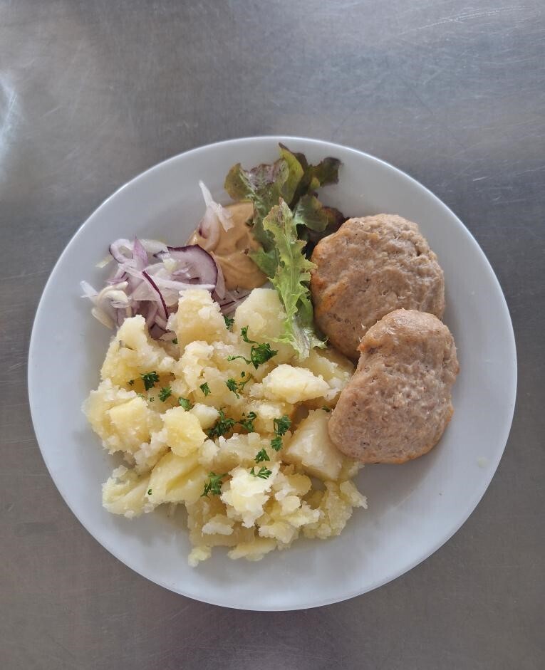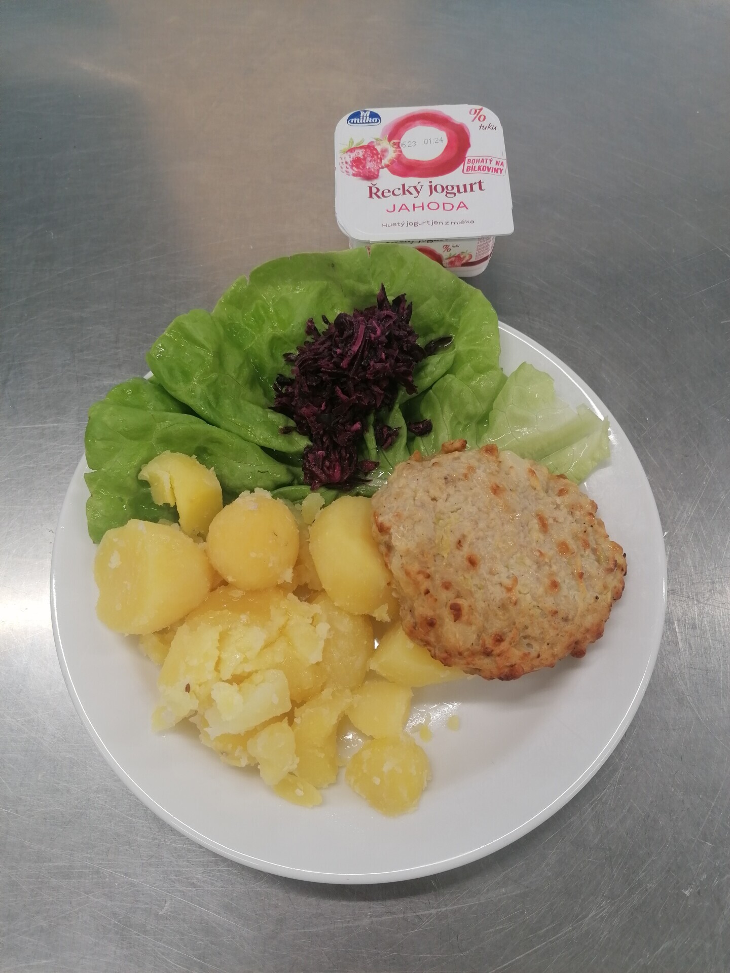 Zahradnická sekaná se sojovým masem, vařený brambor, zeleninový salát