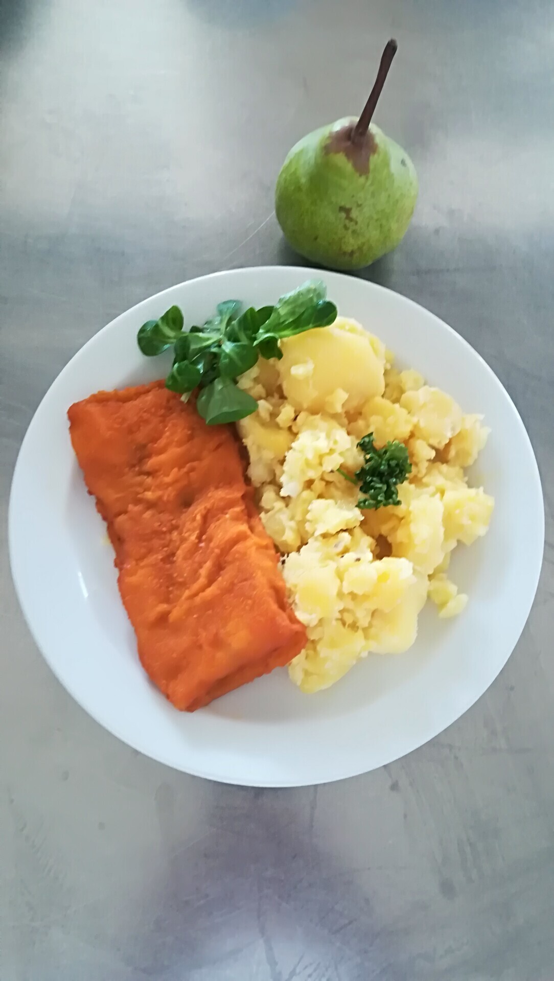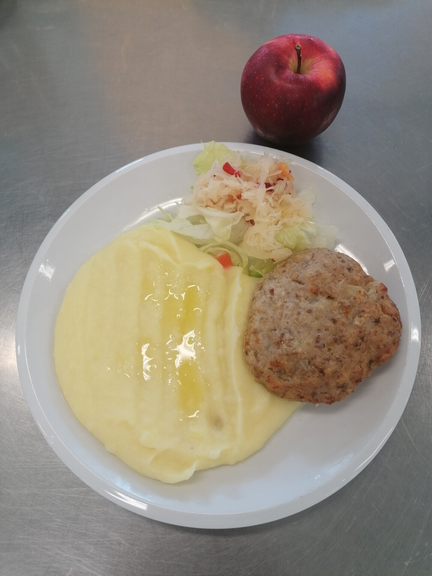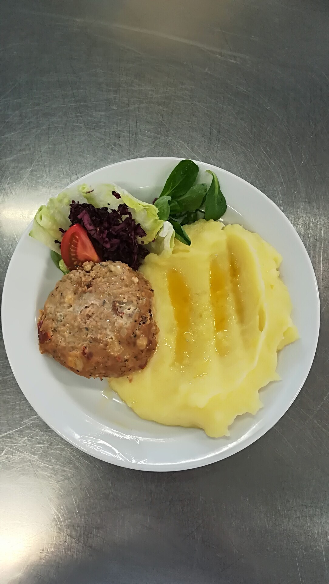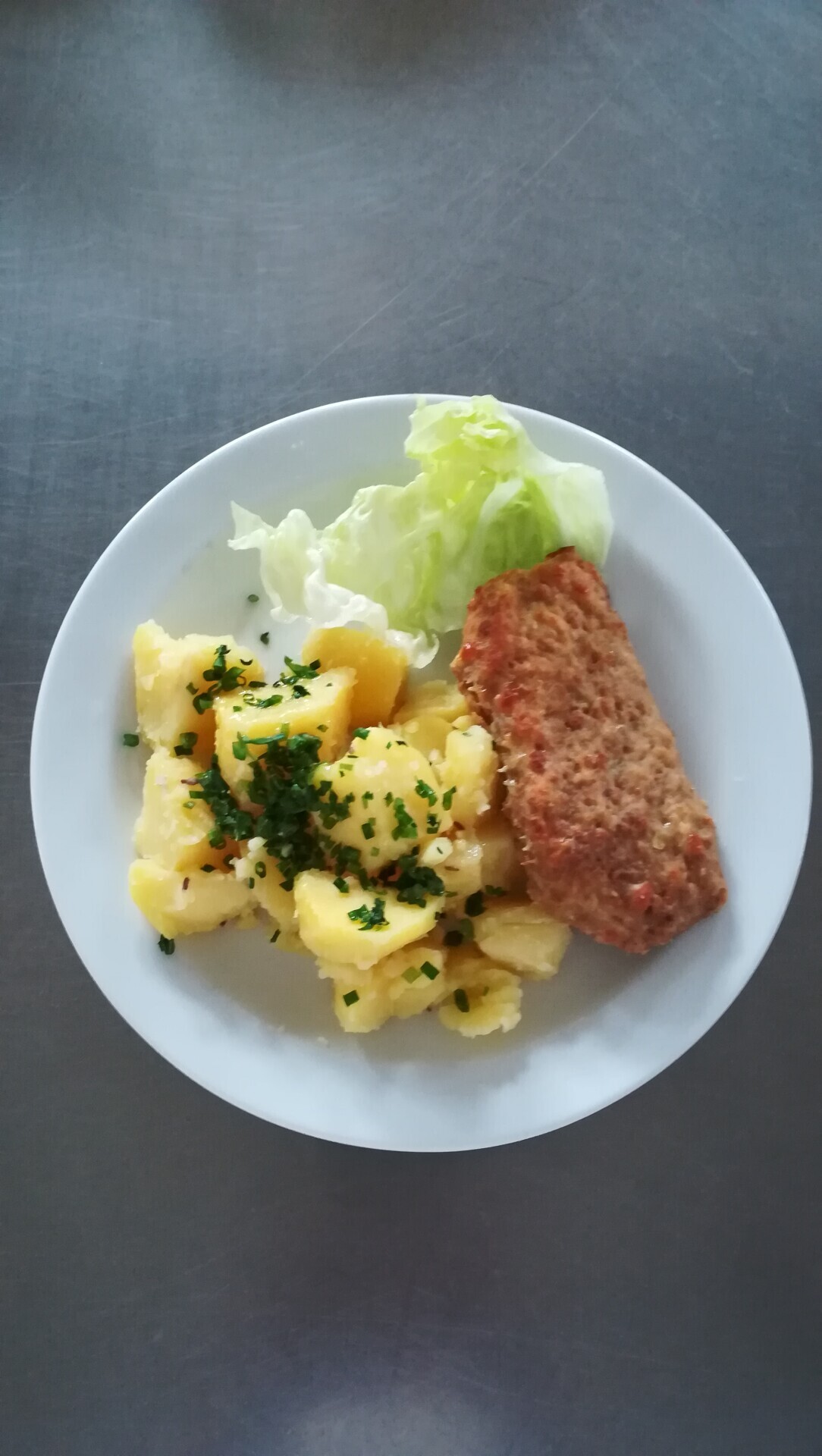 Zahradnická sekaná se sojovým masem, vařený brambor, zeleninový salát