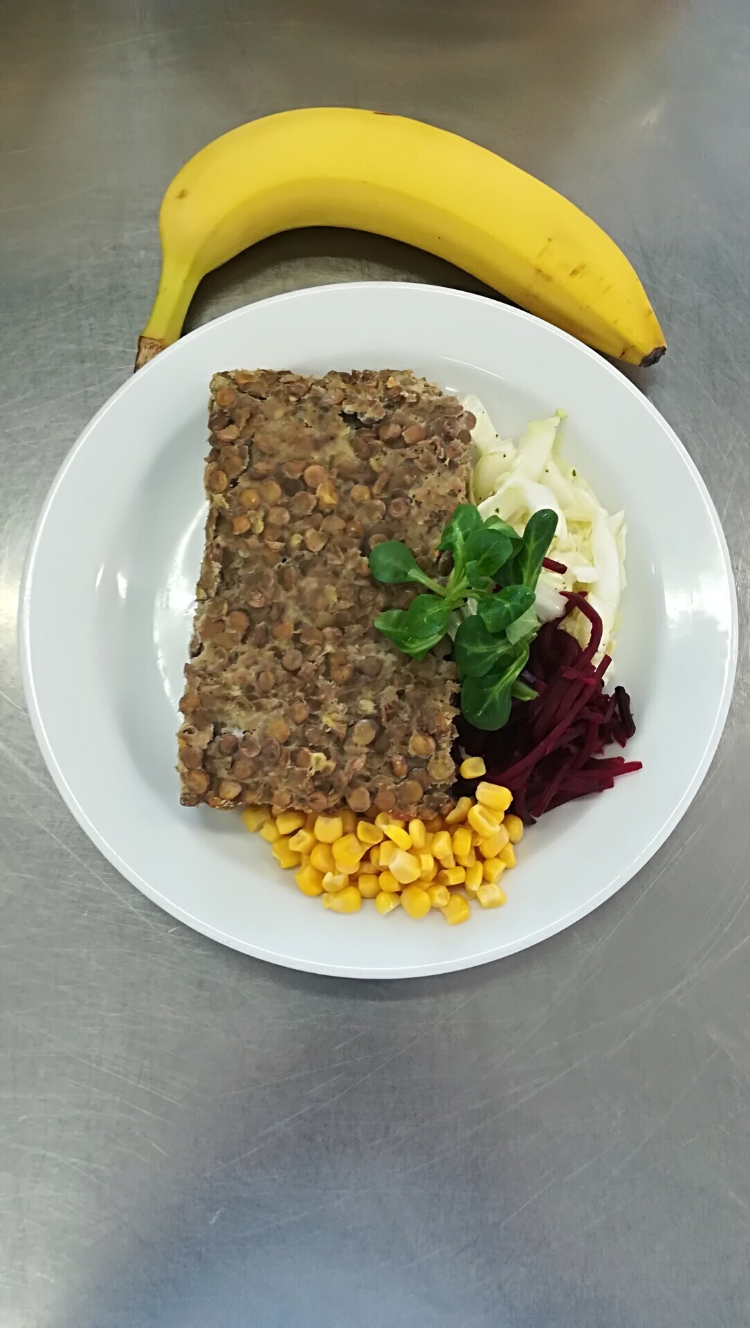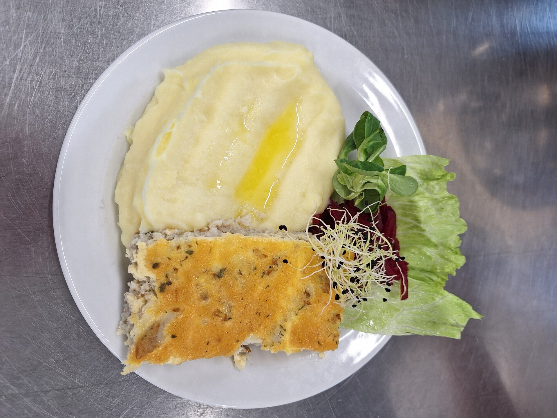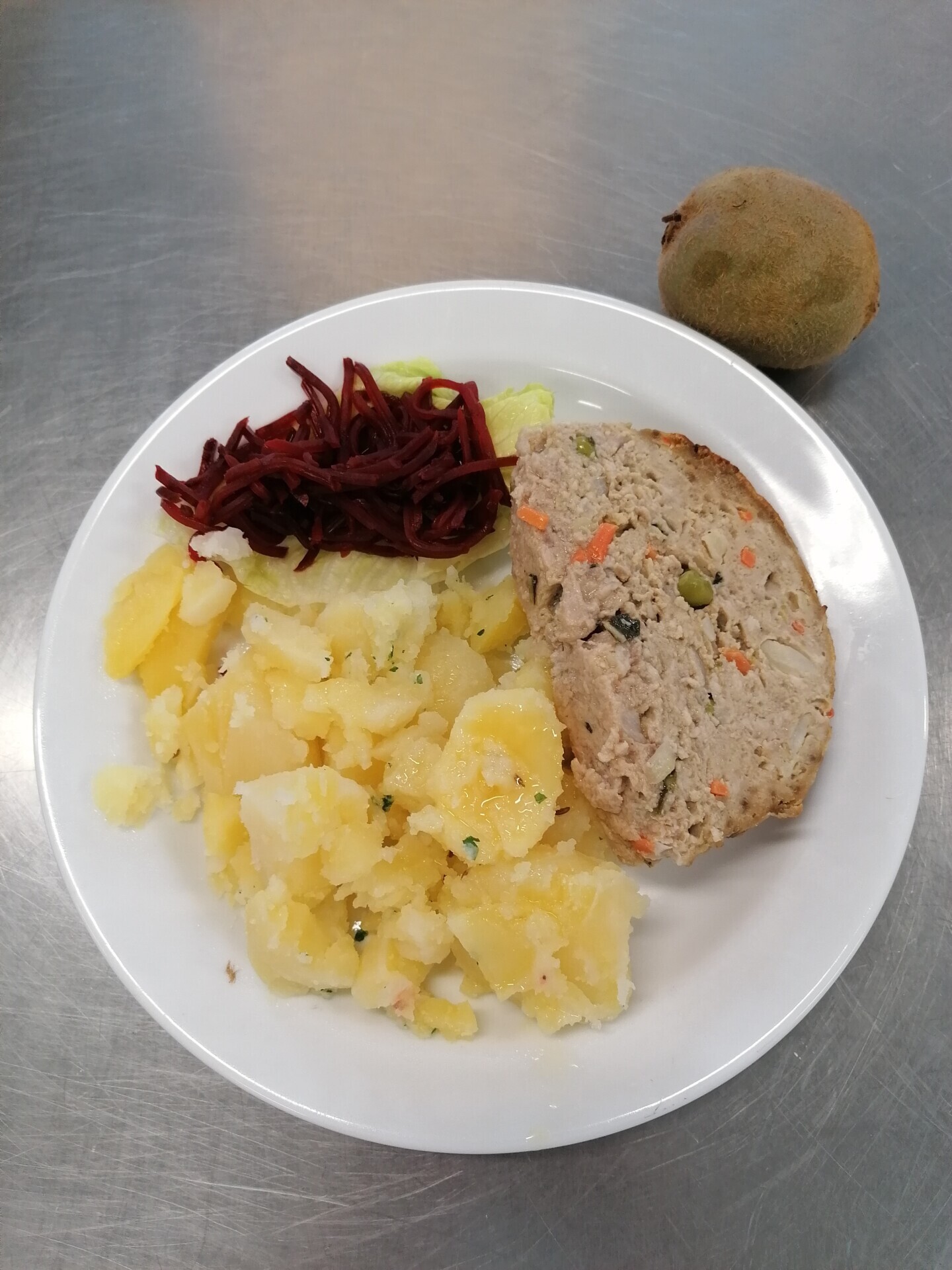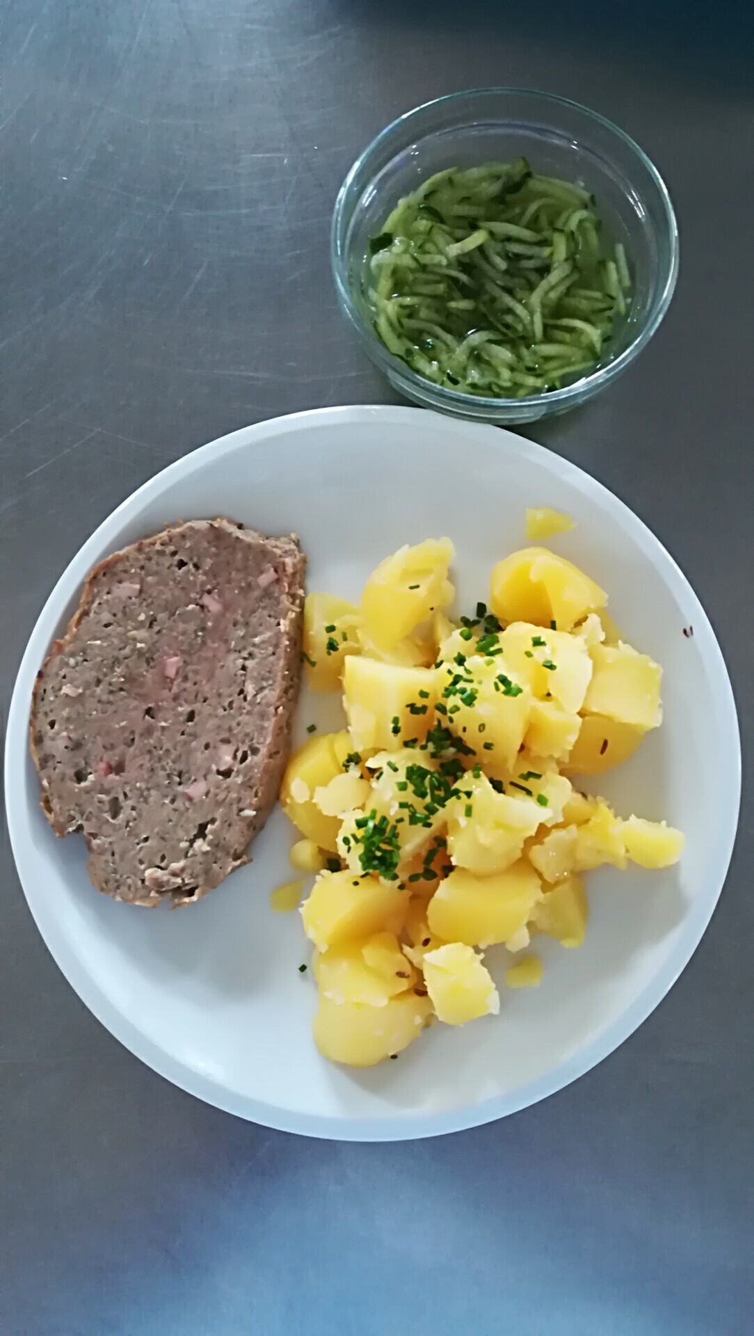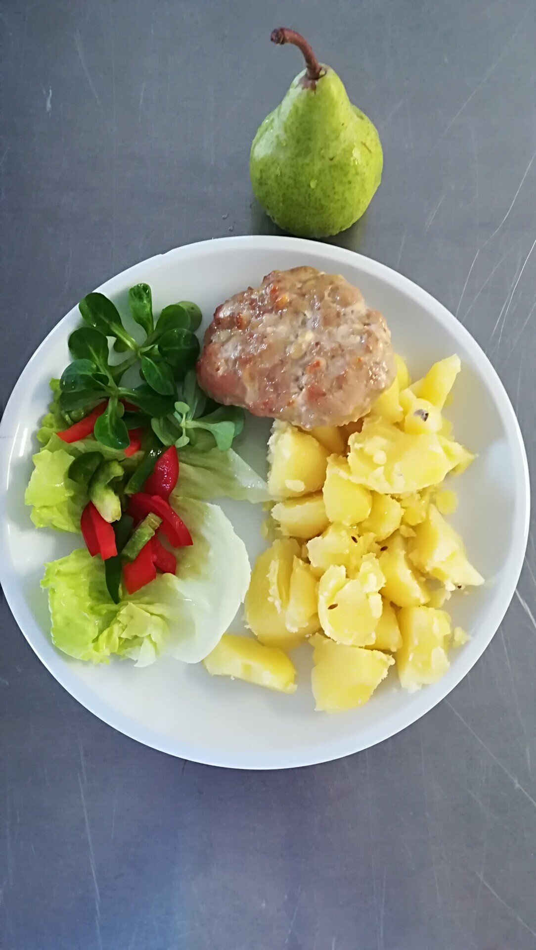 Zahradnická sekaná se sojovým masem, vařený brambor, zeleninový salát