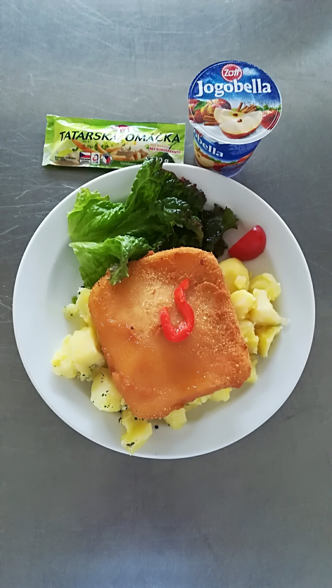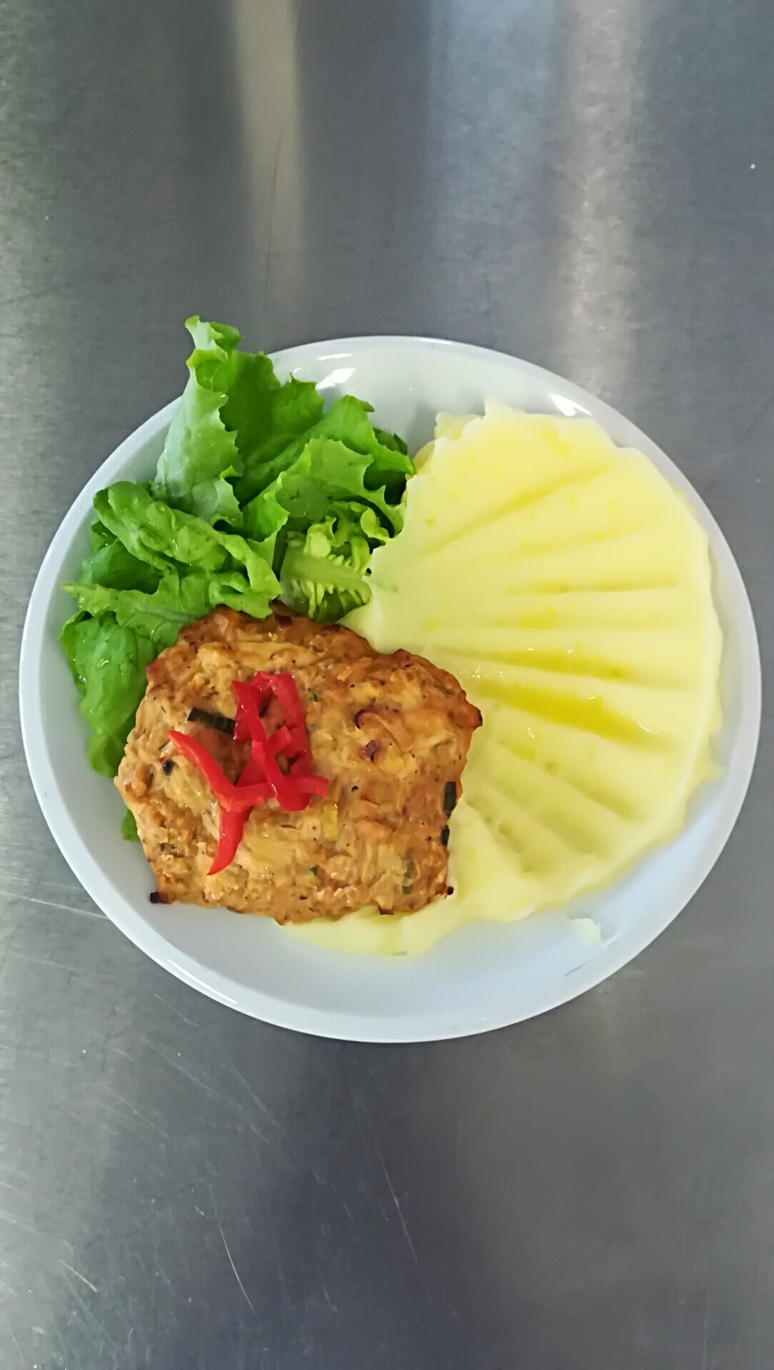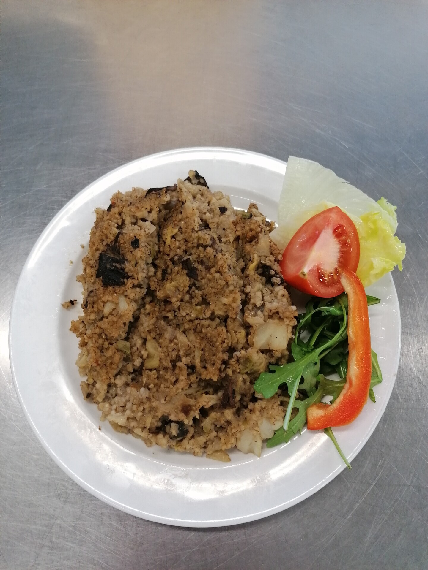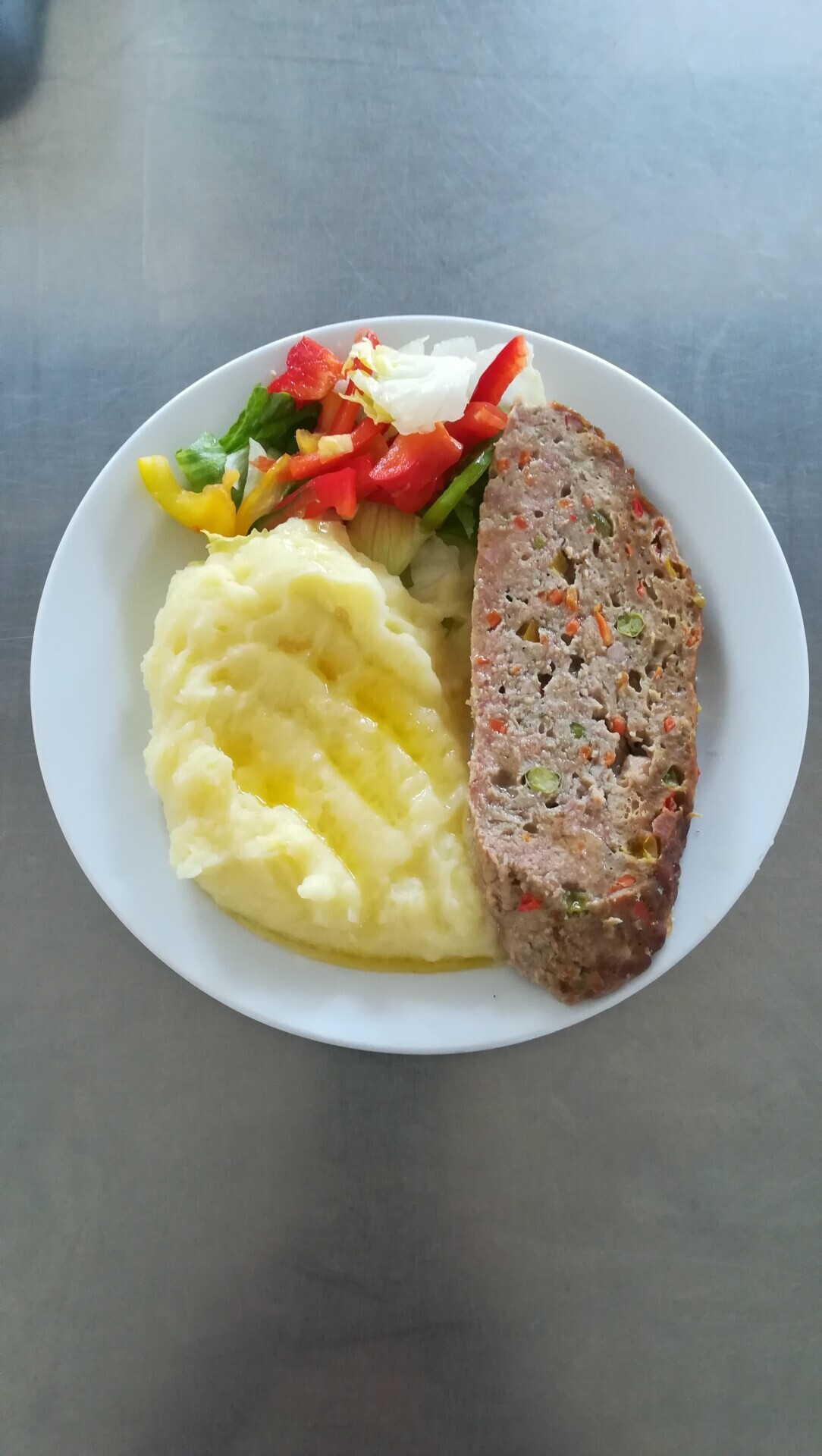 Zahradnická sekaná se sojovým masem, vařený brambor, zeleninový salát