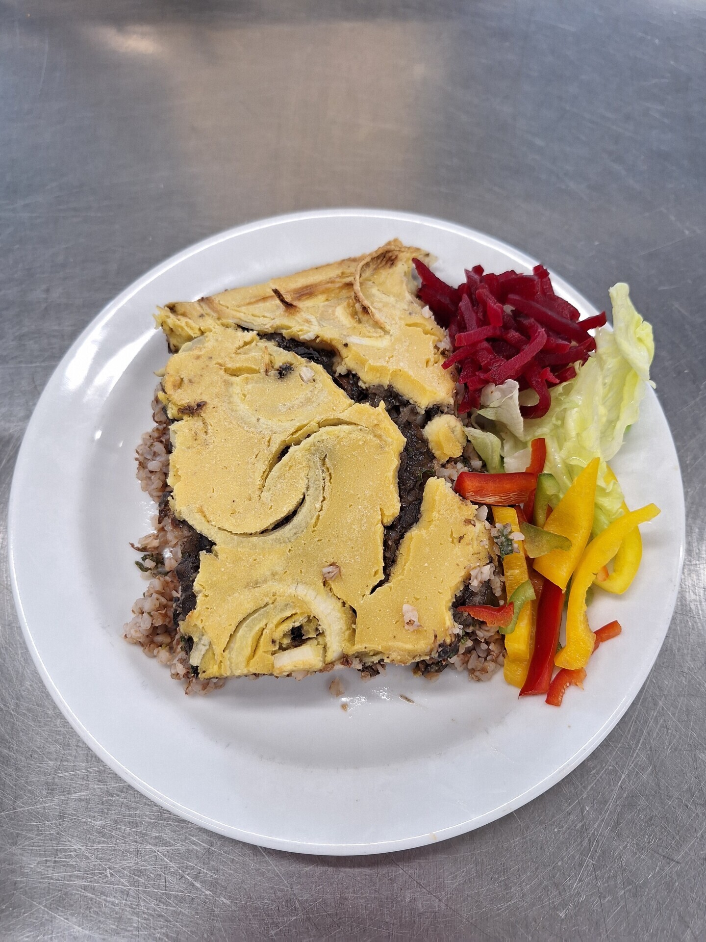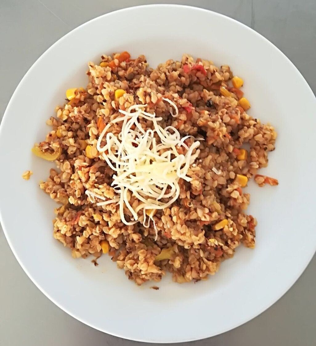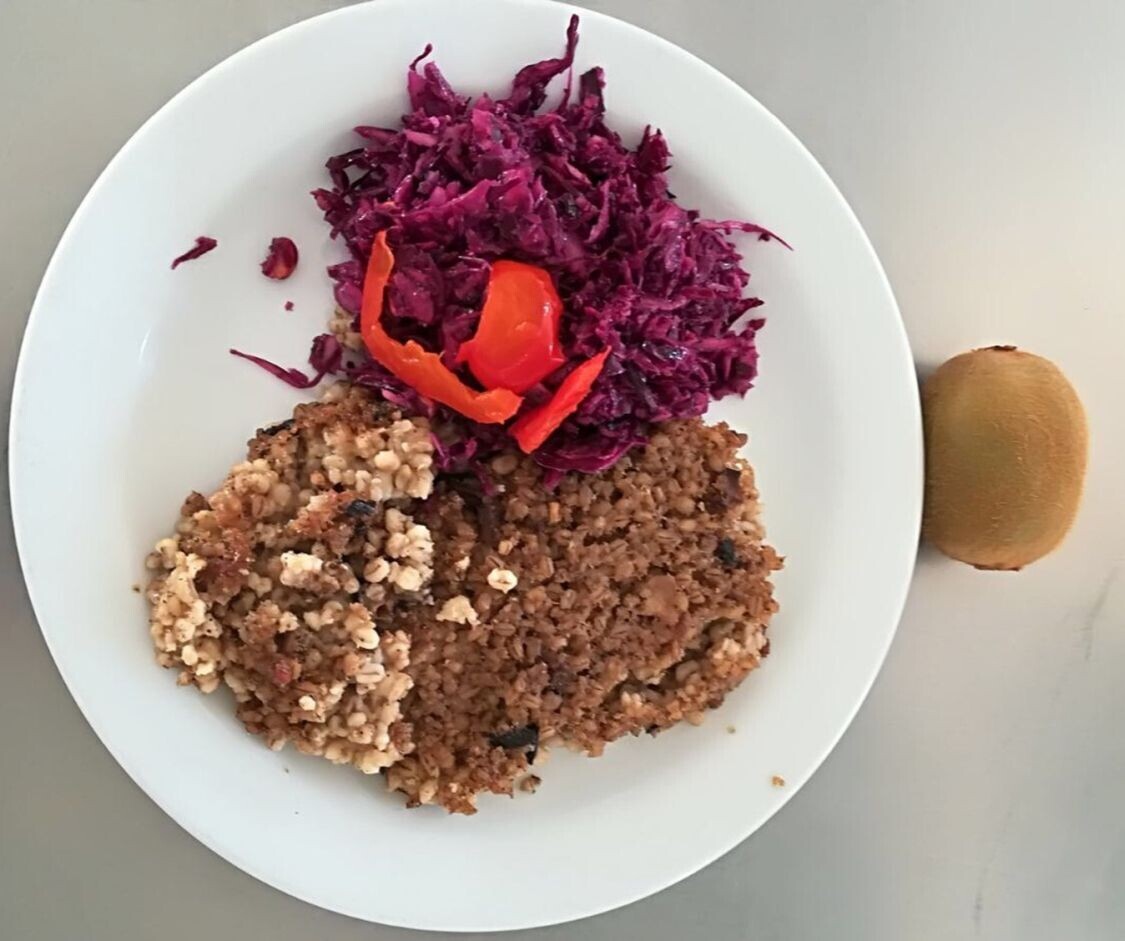 Zapečená pohanka s hlívou (uzené tofu, mrkev, rajčata), kysané zelí