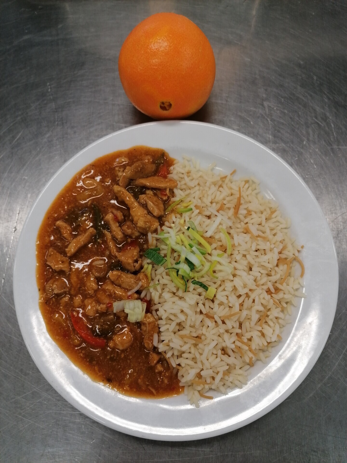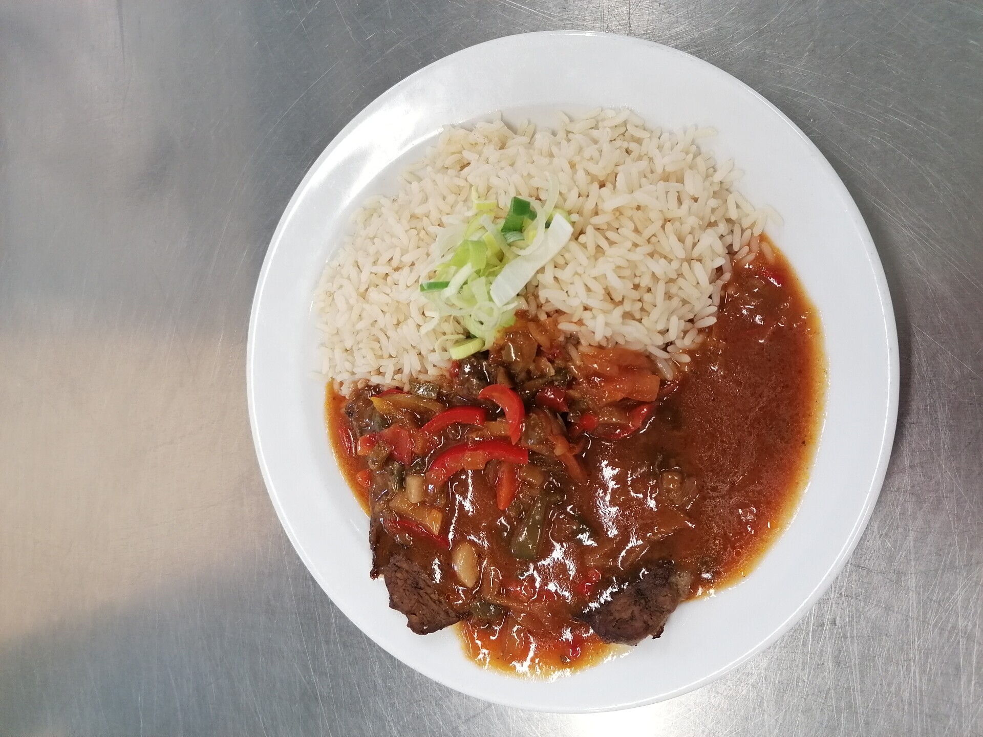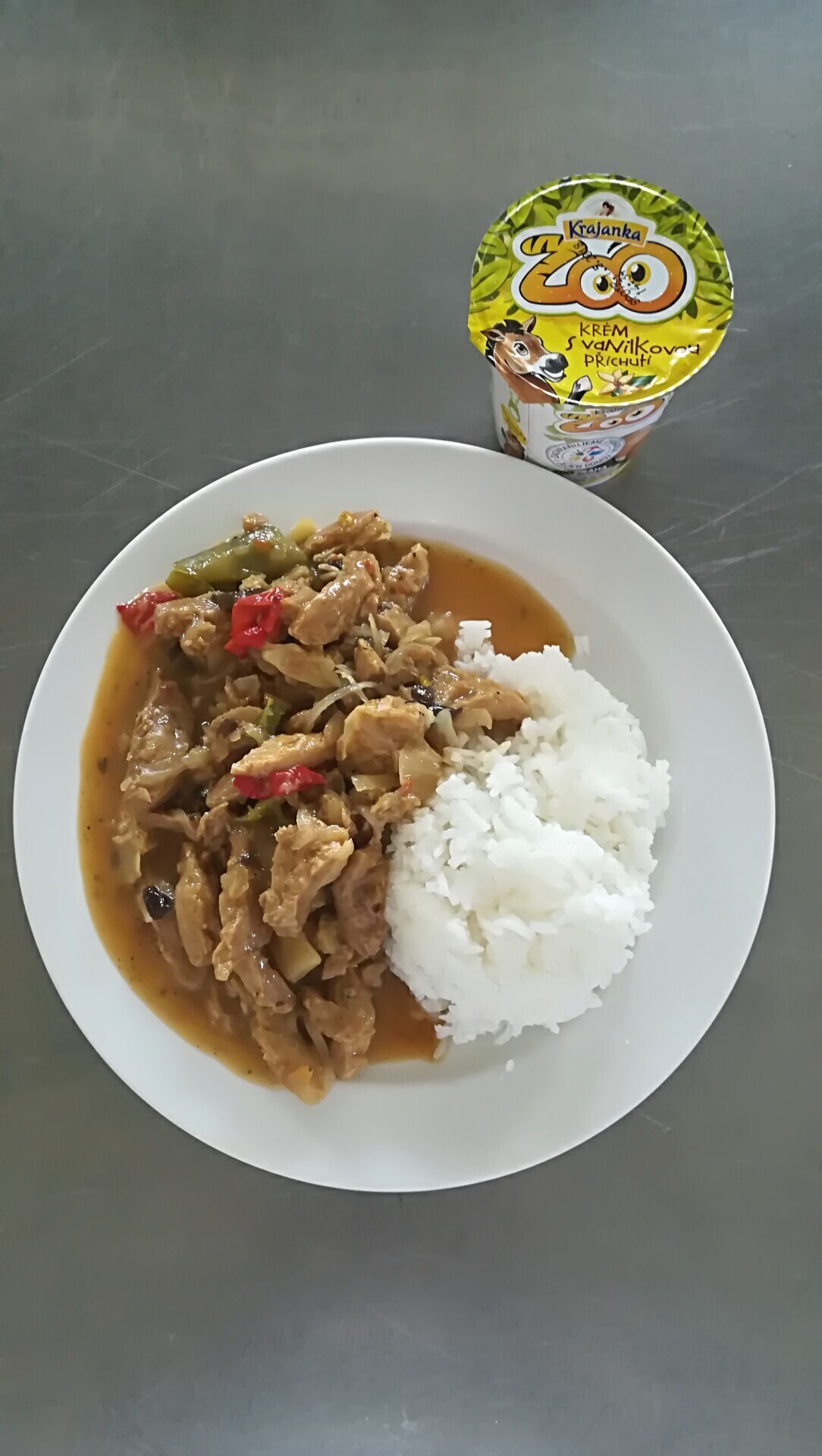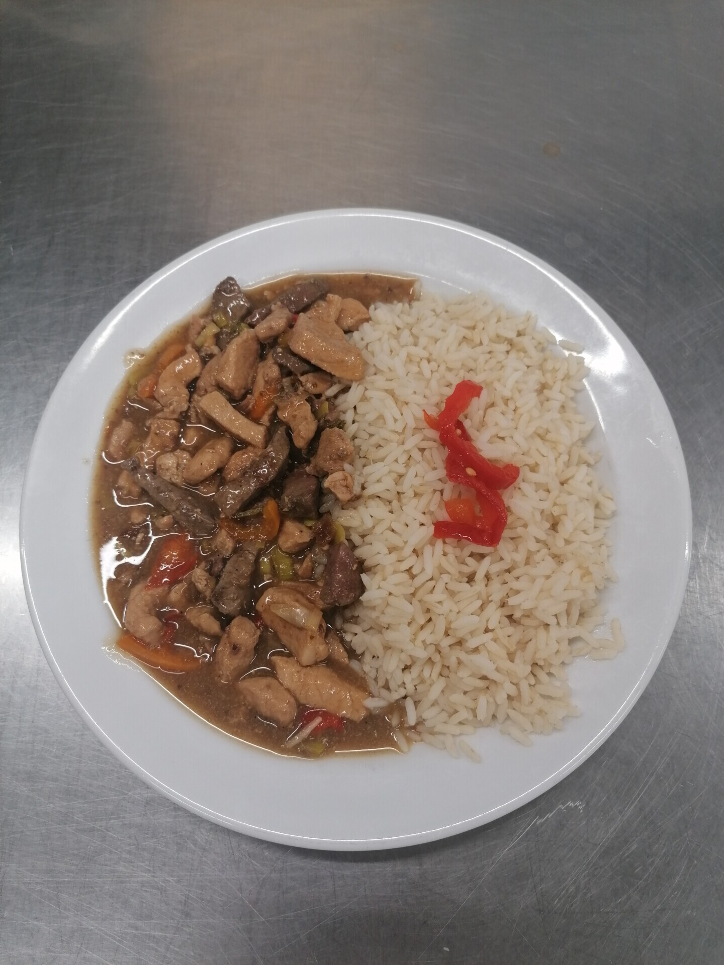 Vepřové nudličky na paprikách, dušená rýže
