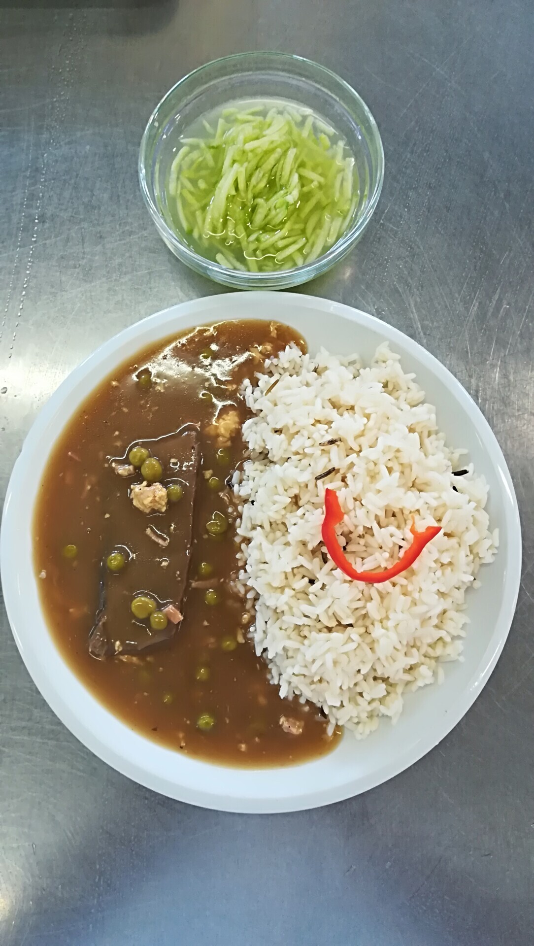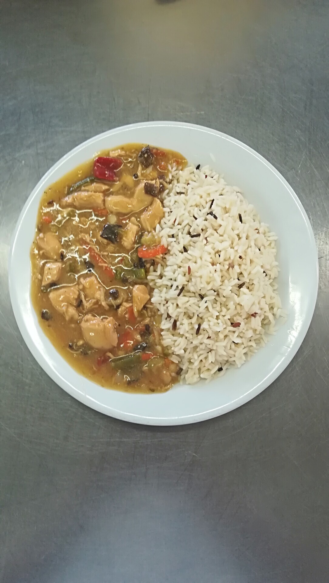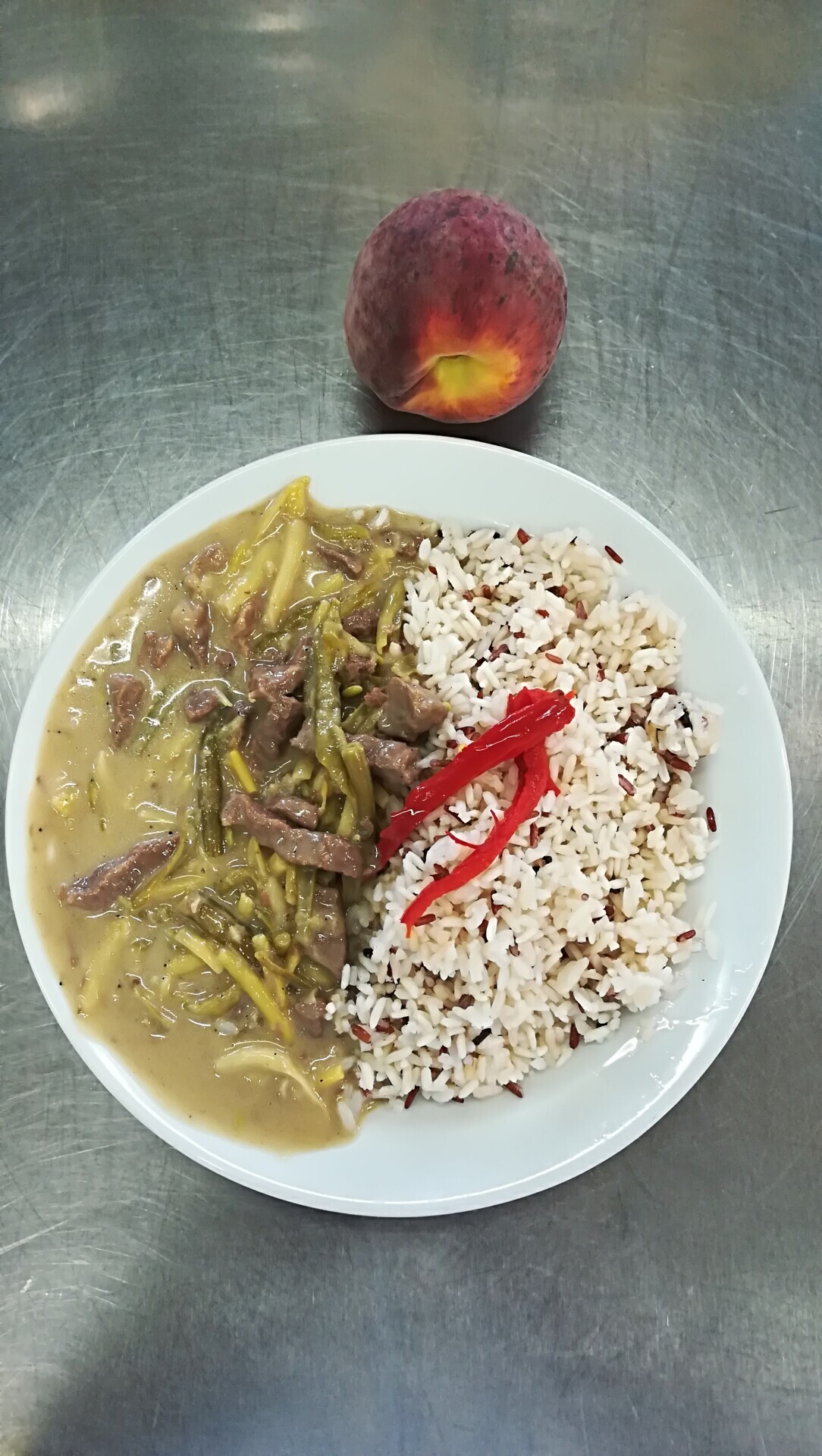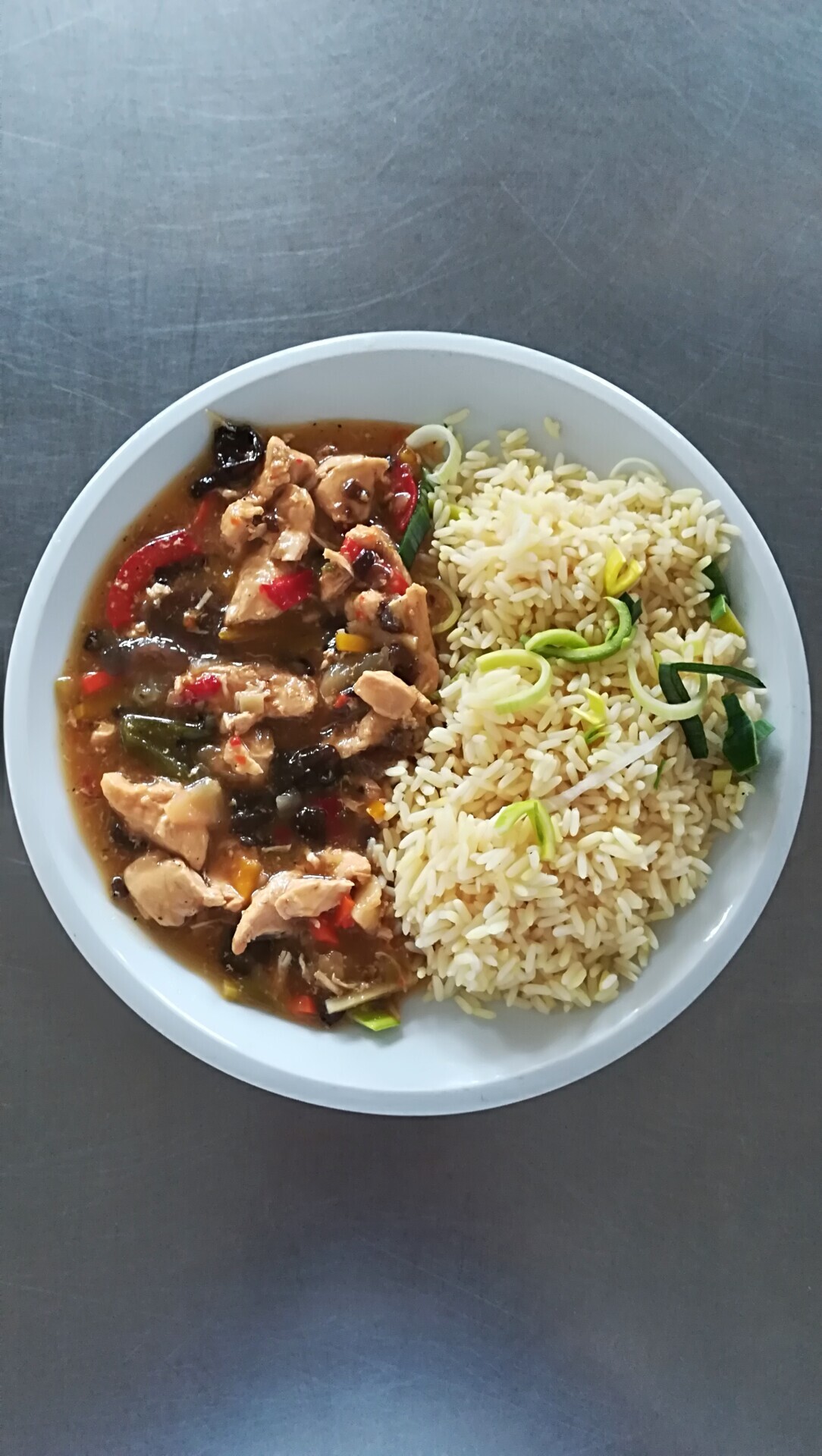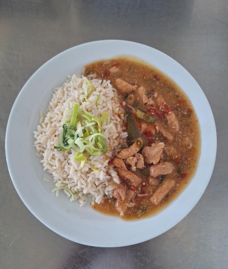 Vepřové nudličky na paprikách, dušená rýže