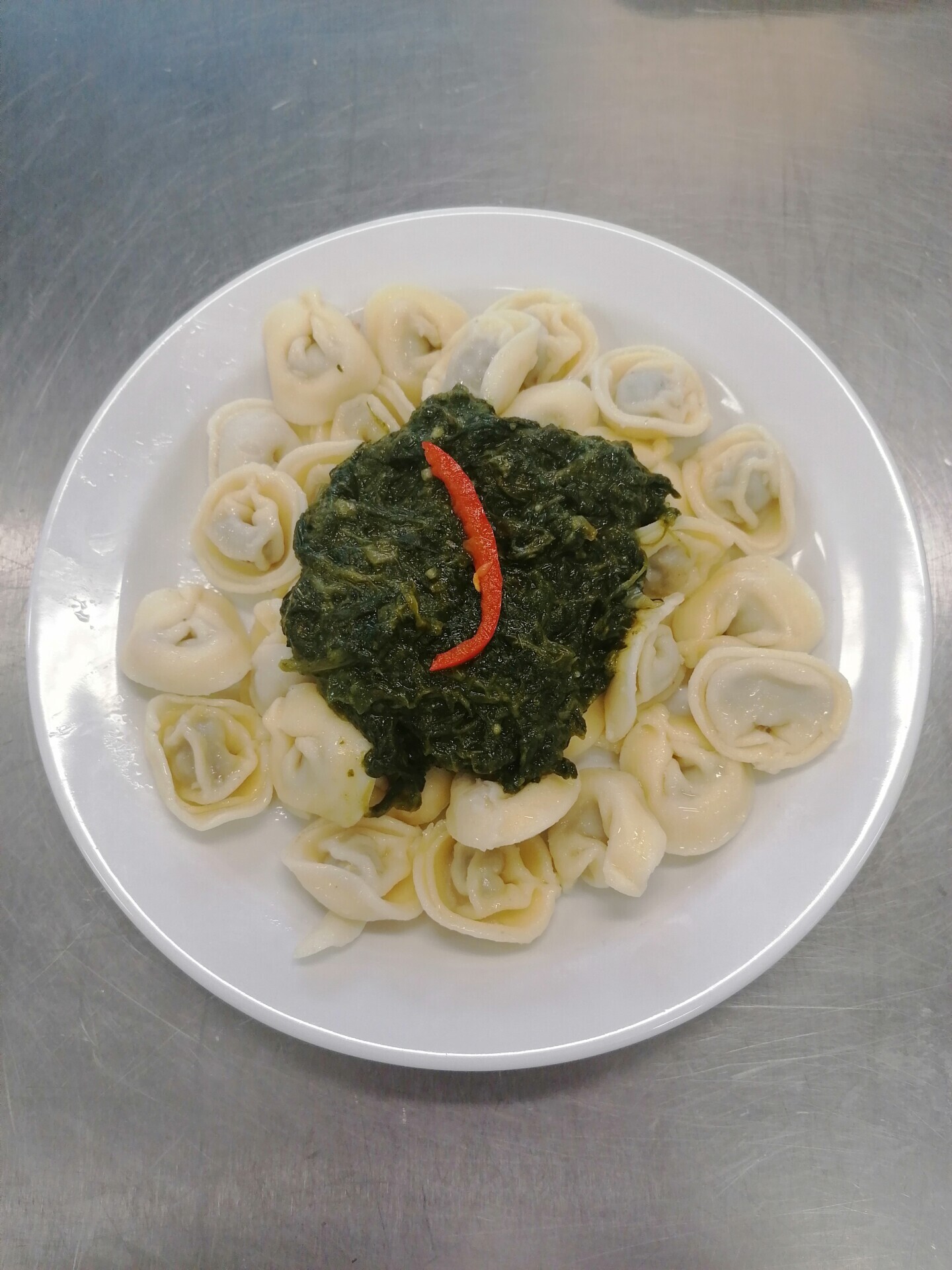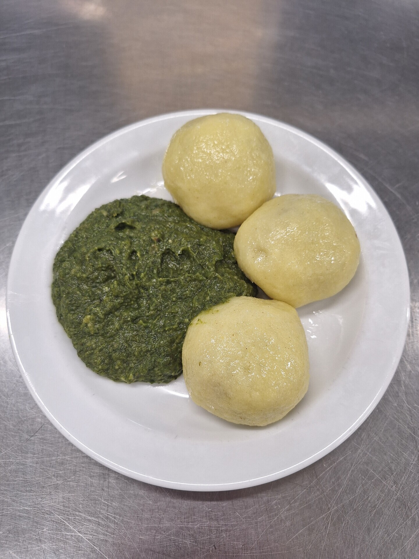 Bramborové knedlíky plněné pohankou (pohanka, estragon, muš. oříšek, petrželka, cibule), špenát