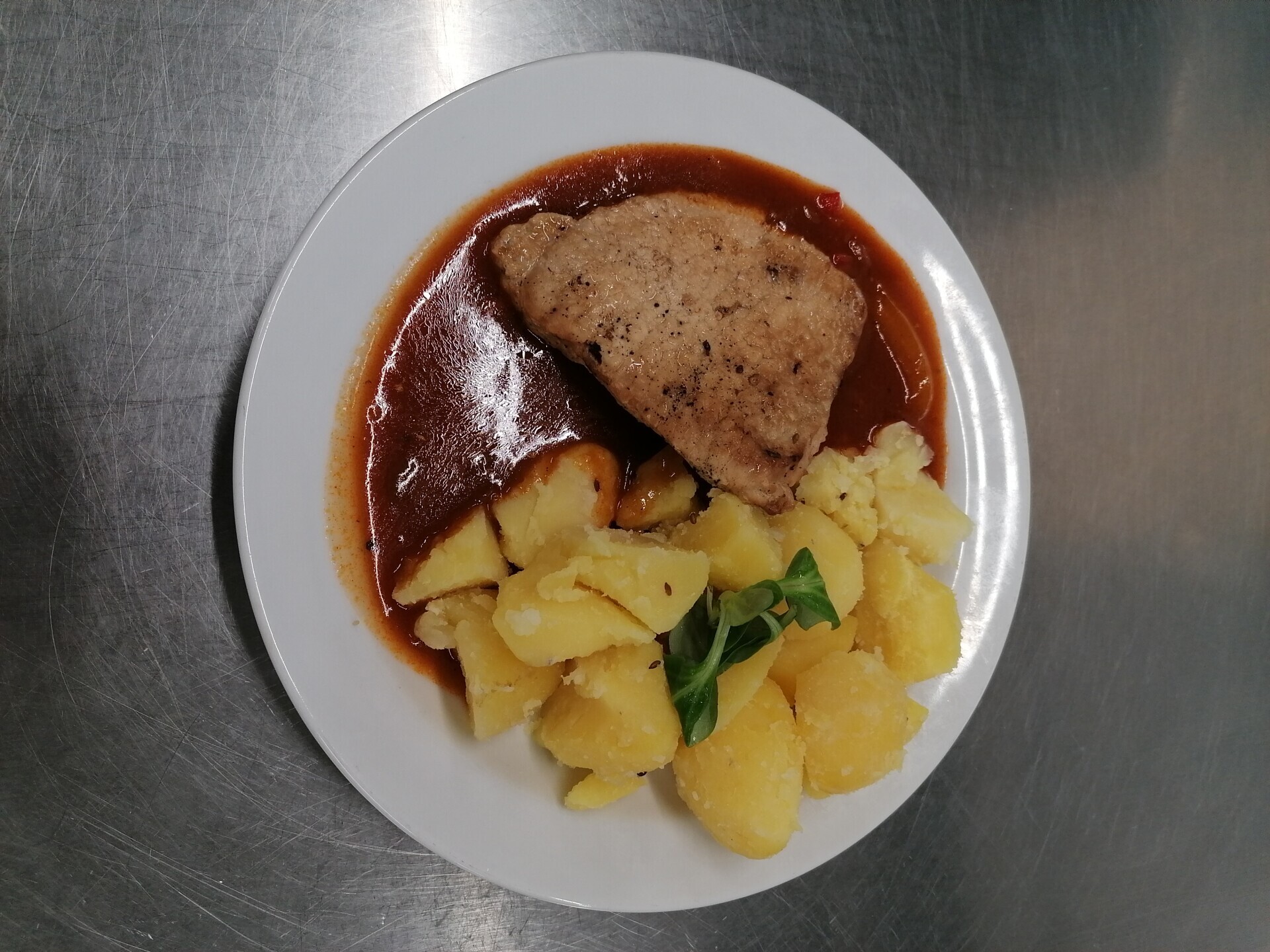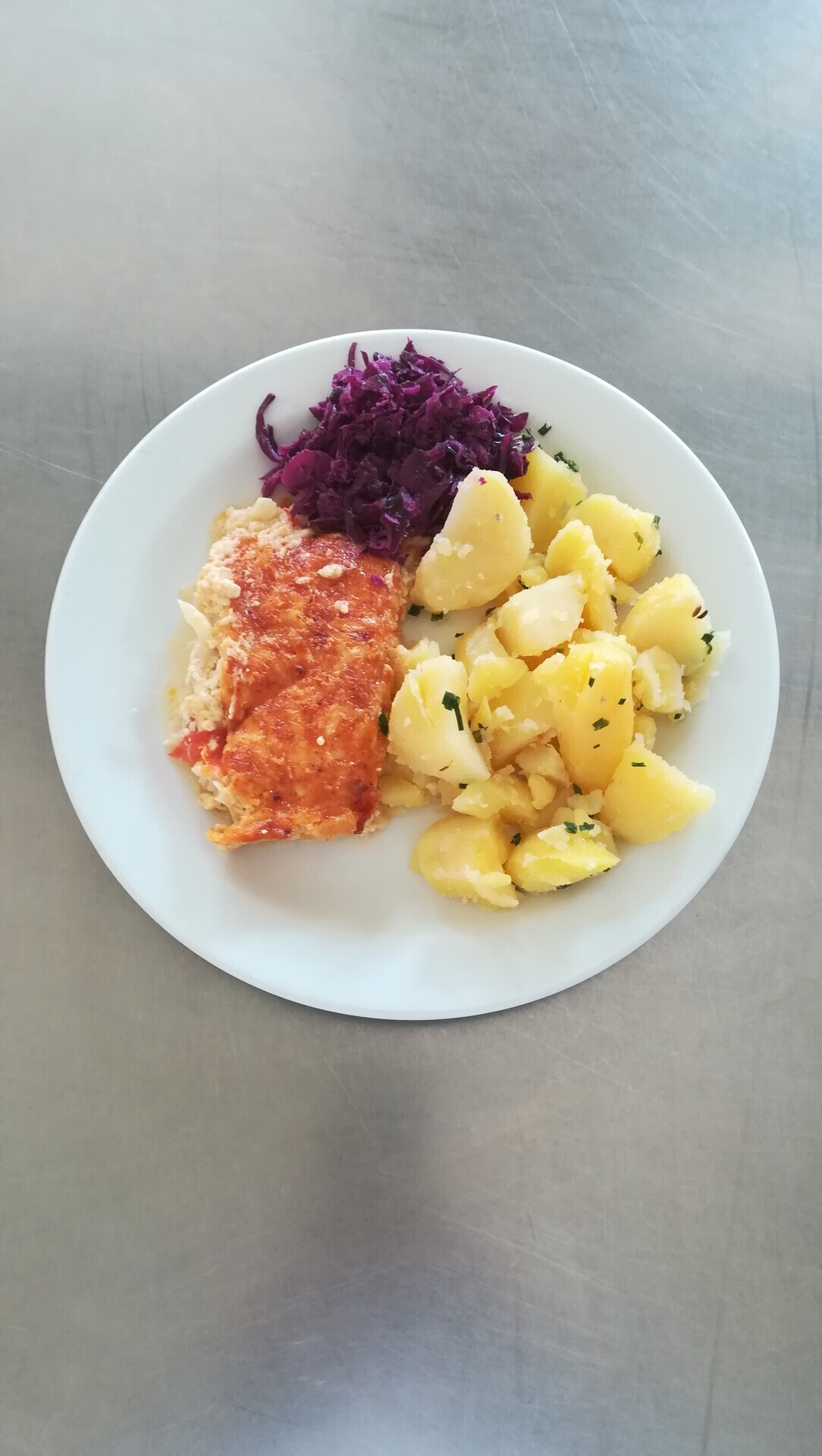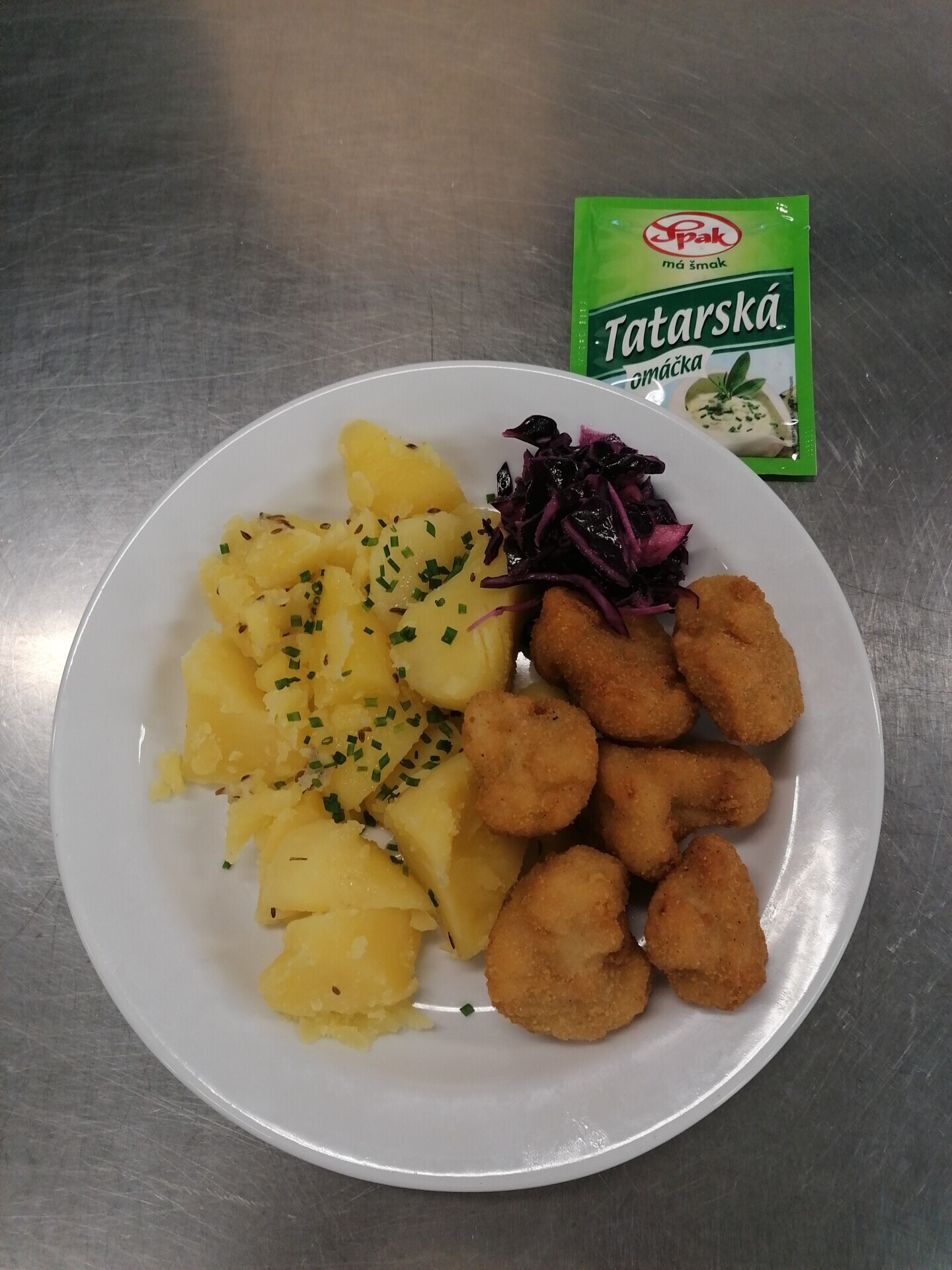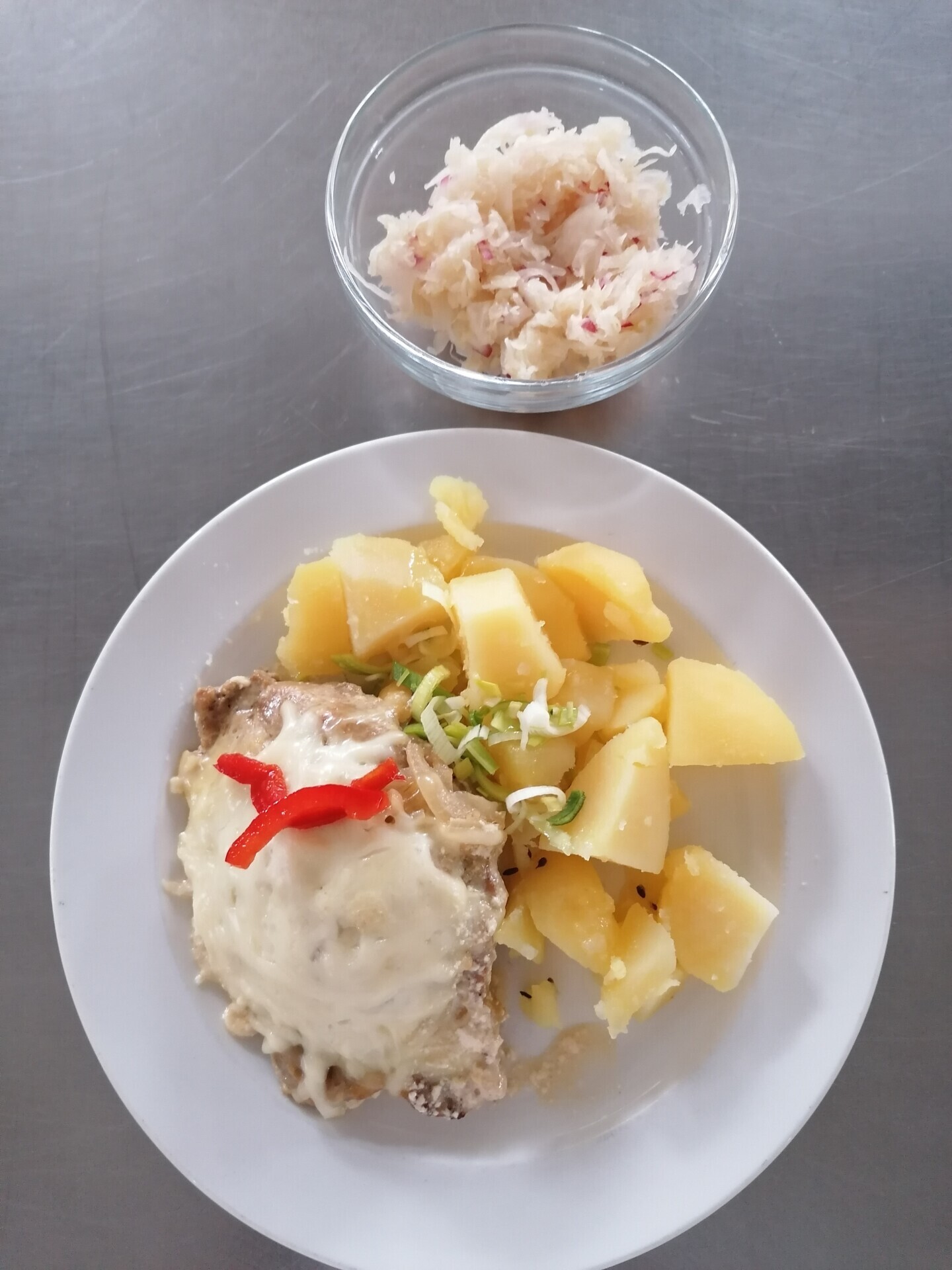 Vepřový plátek v kapustě, vařený brambor