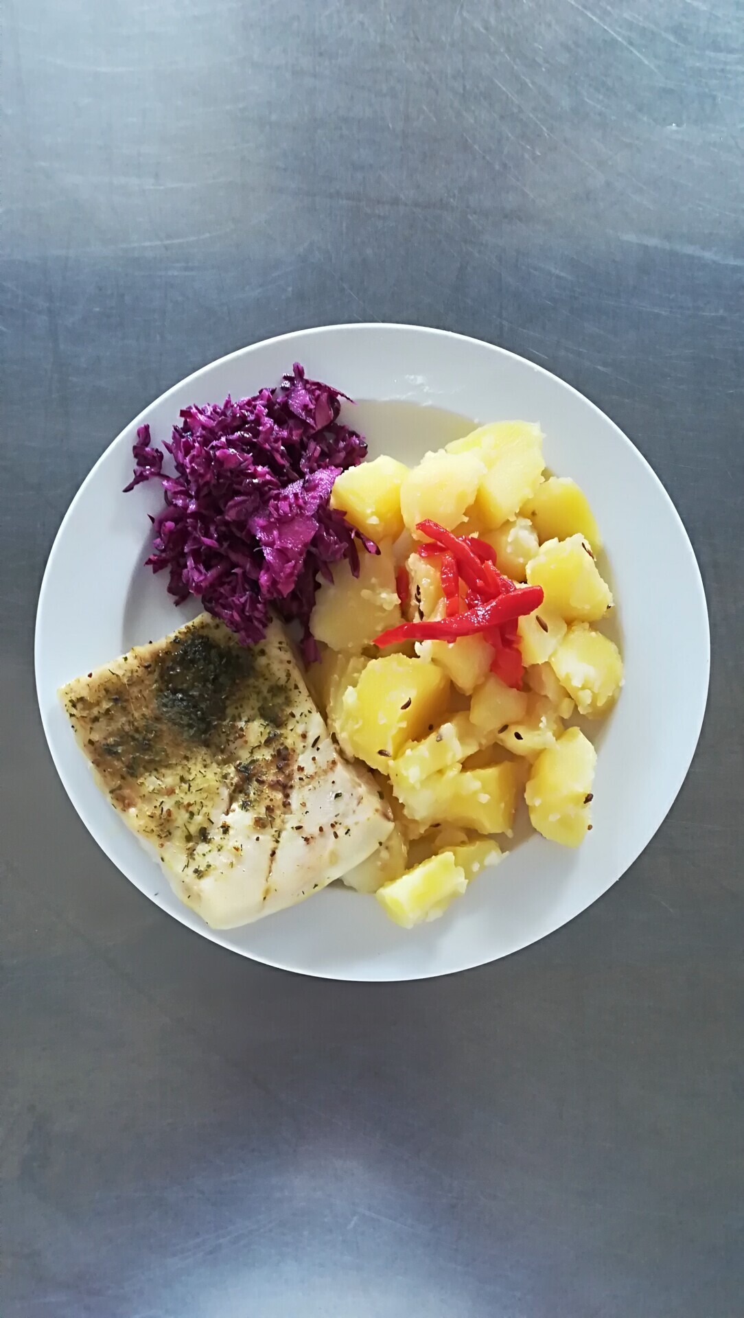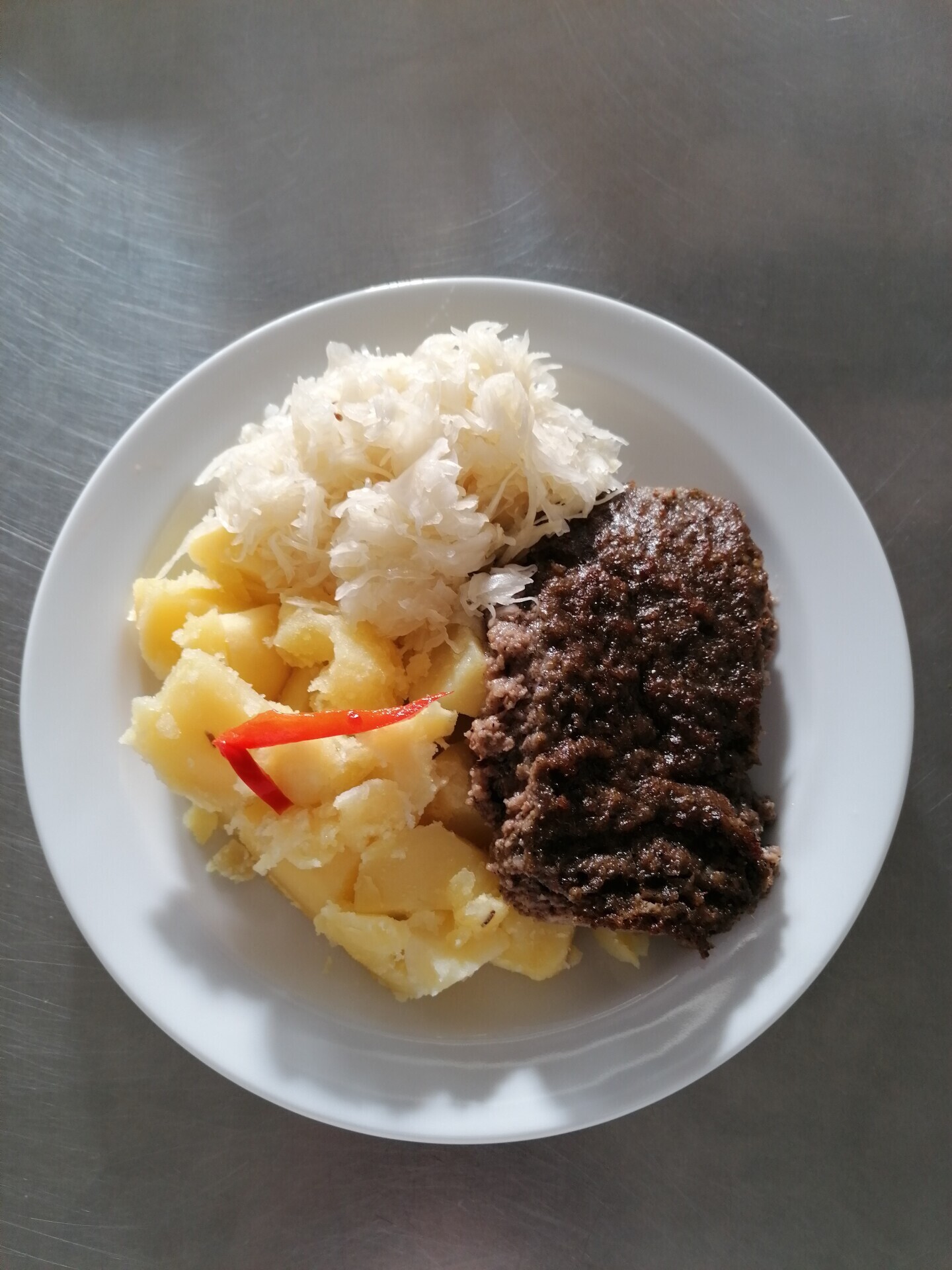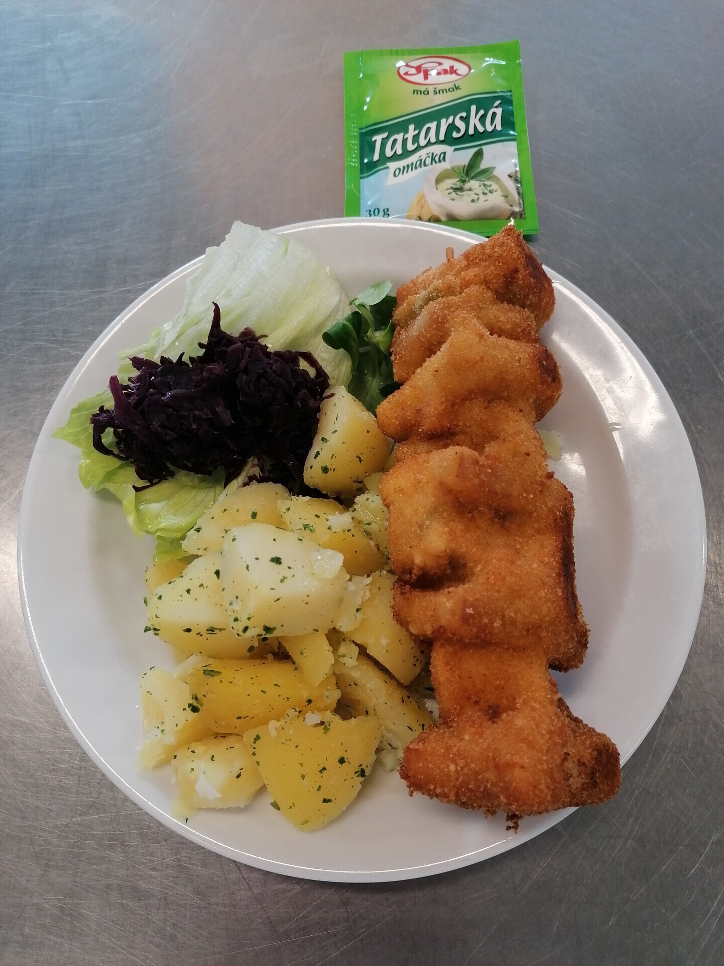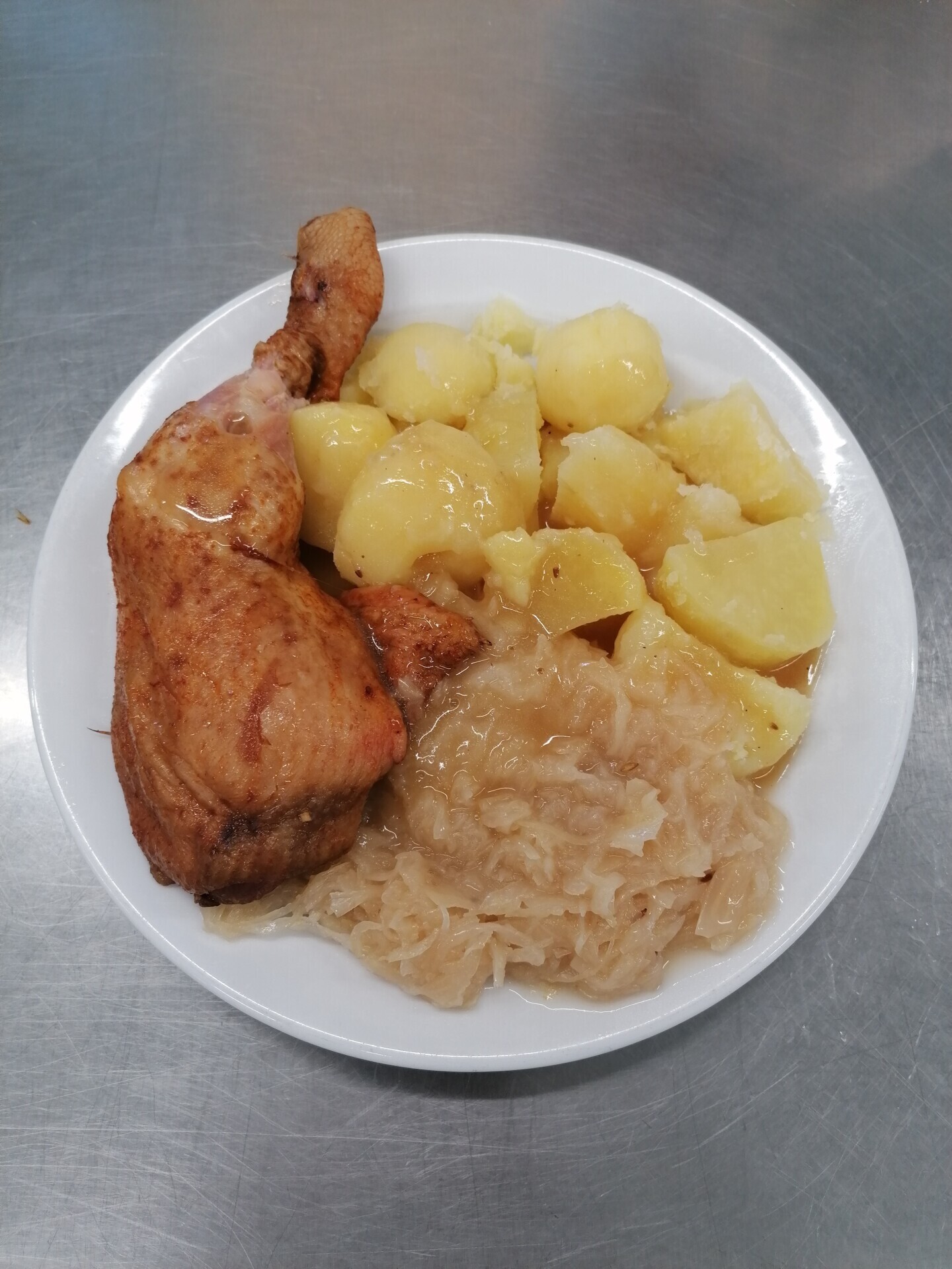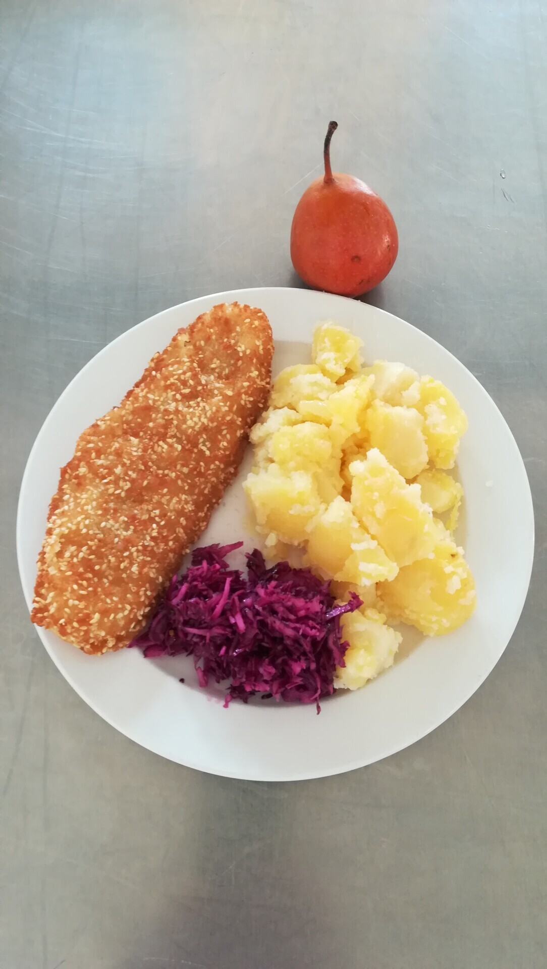 Vepřový plátek v kapustě, vařený brambor