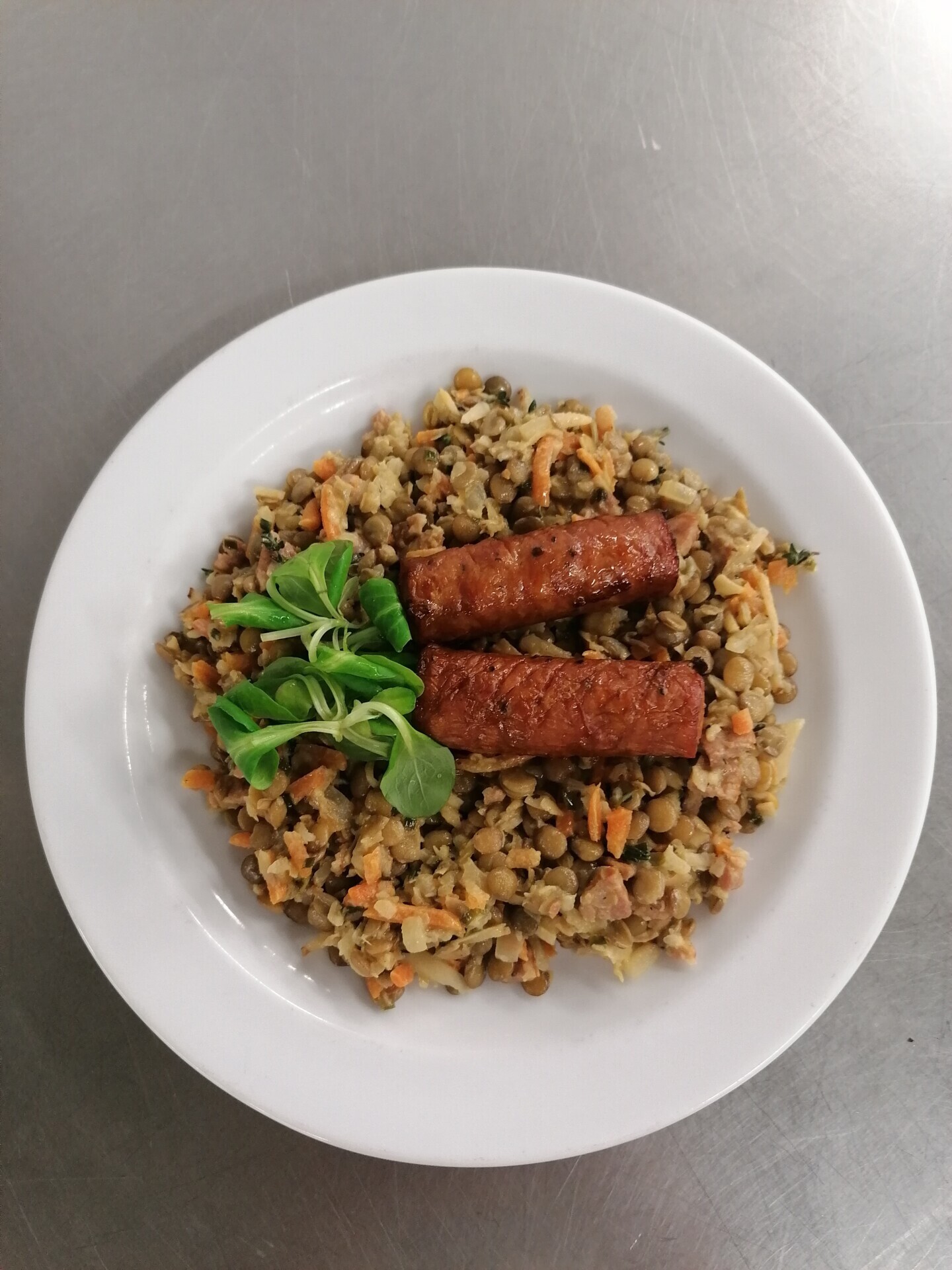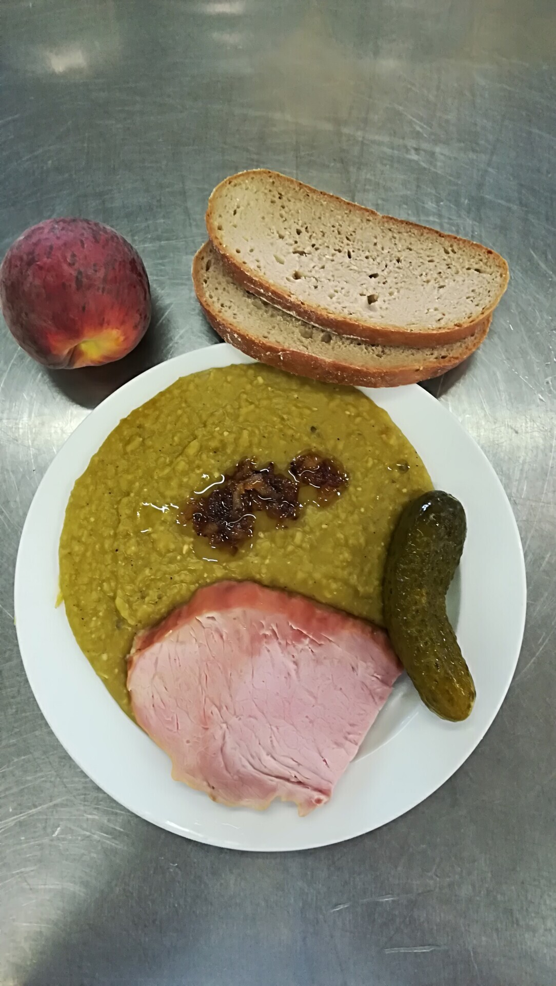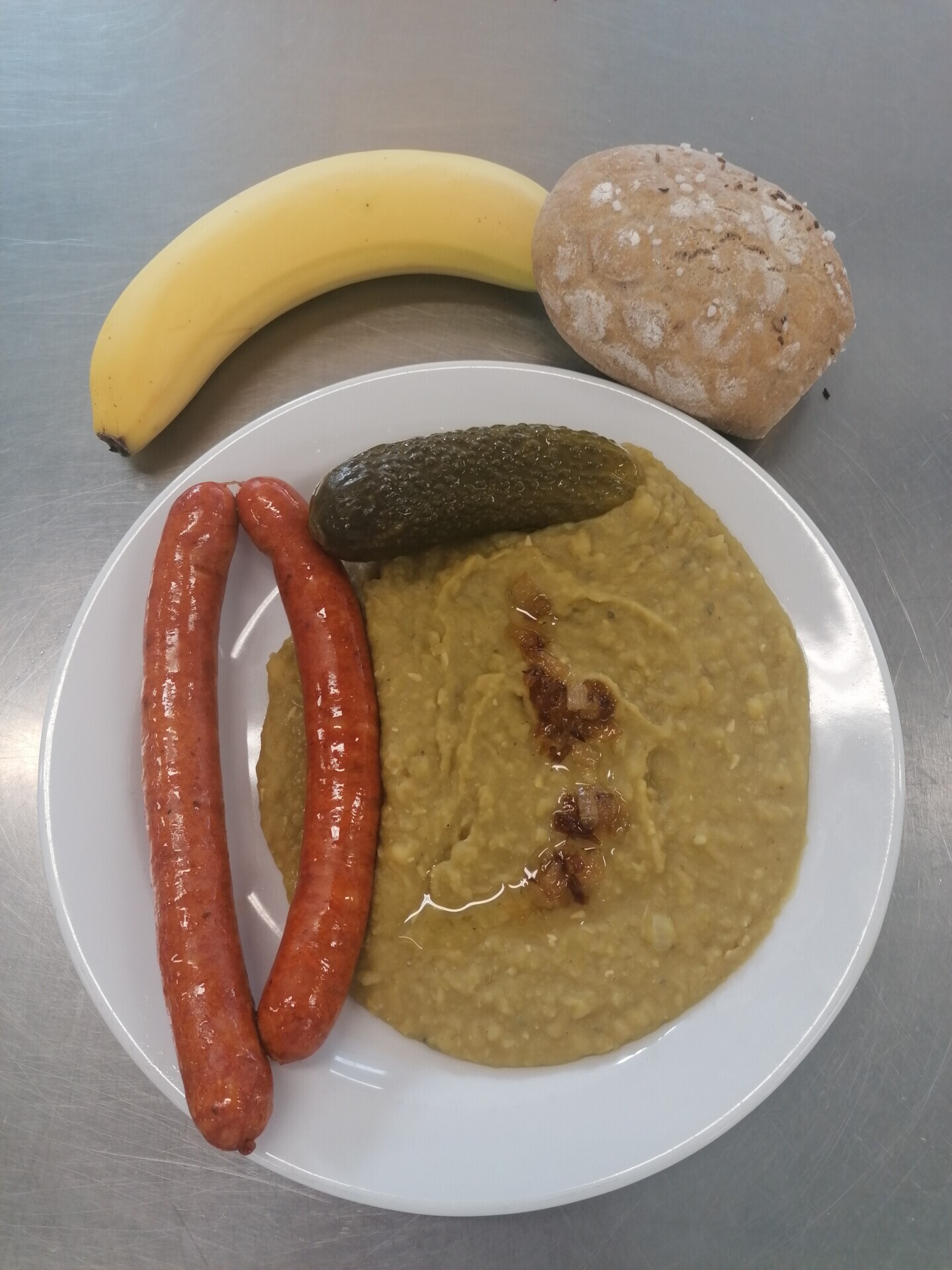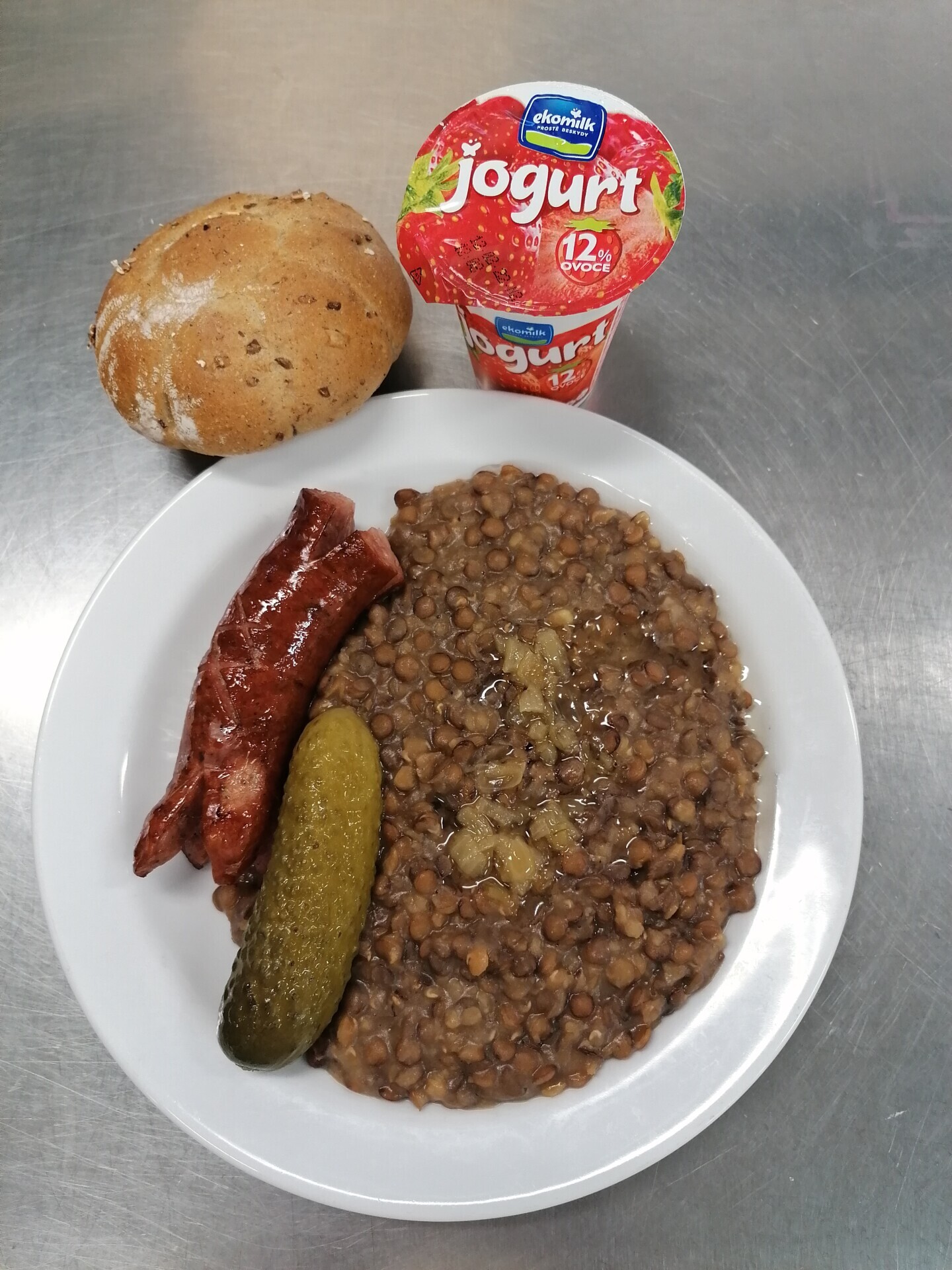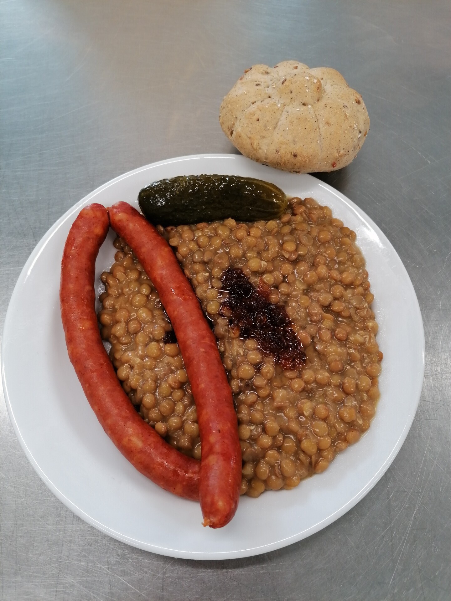 Čočka na kyselo, opečená klobása, smažená cibulka, ster. okurka, pečivo