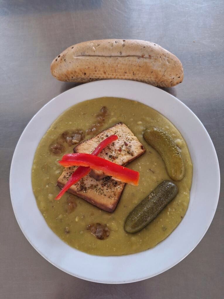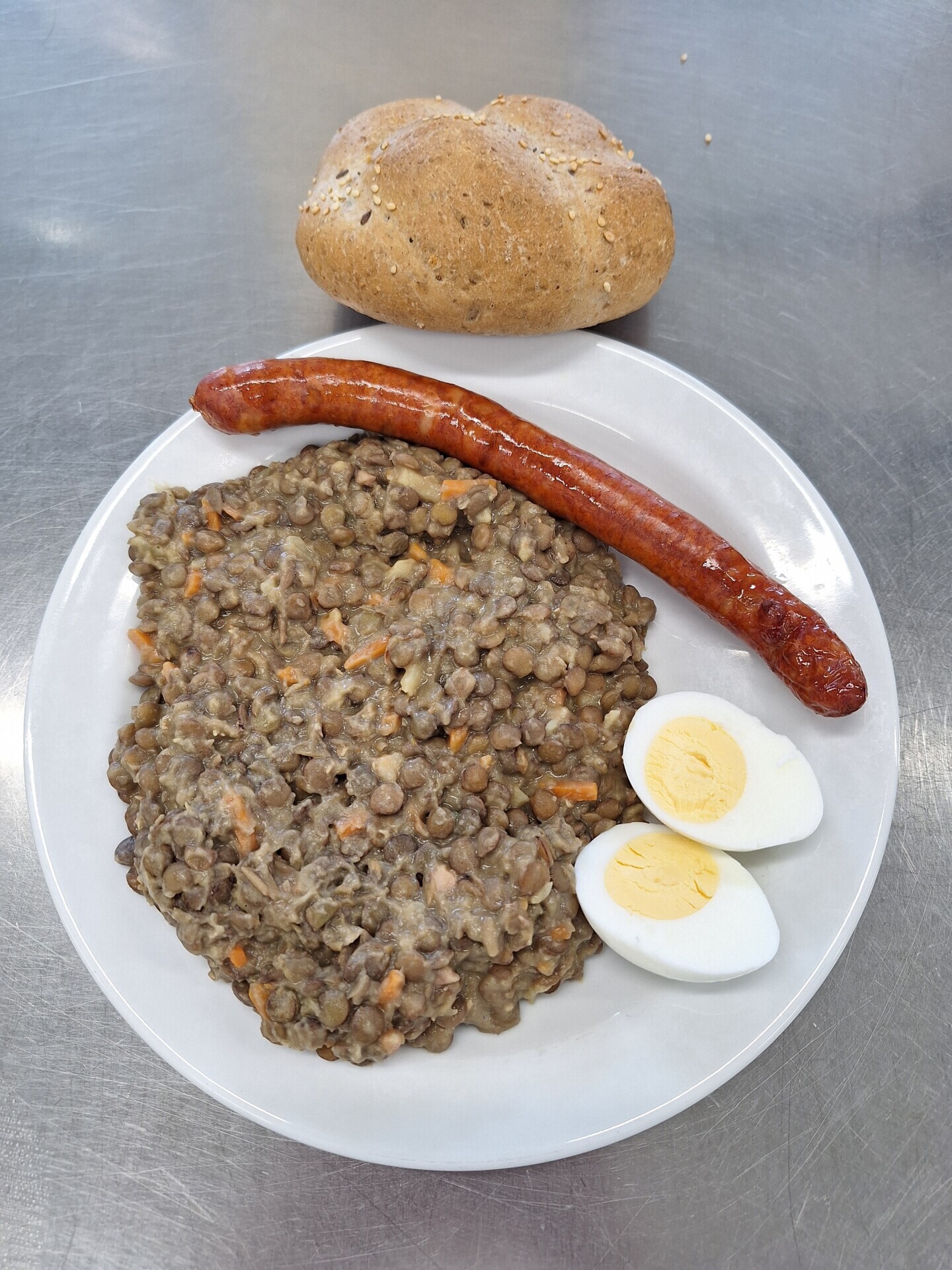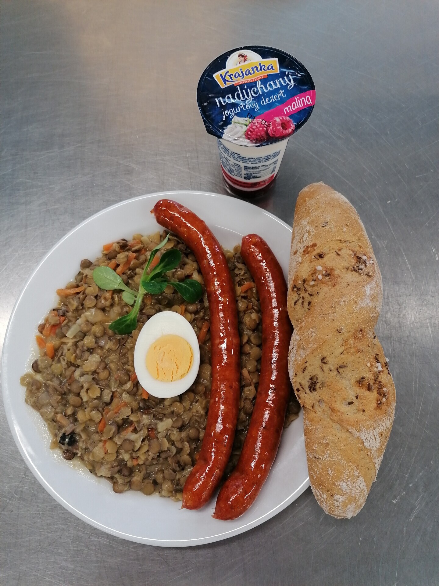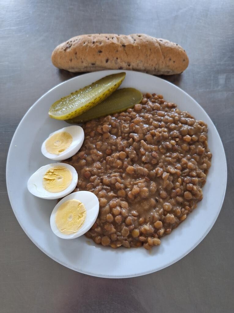 Čočka na kyselo, sázené vejce, sojový rohlík, sterilovaná