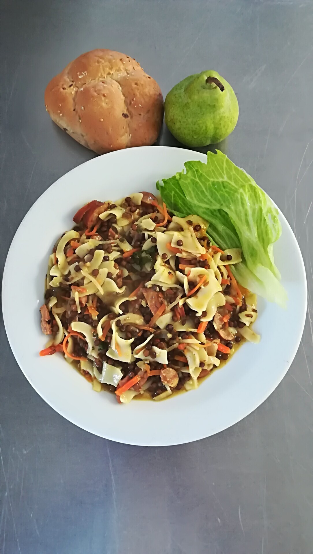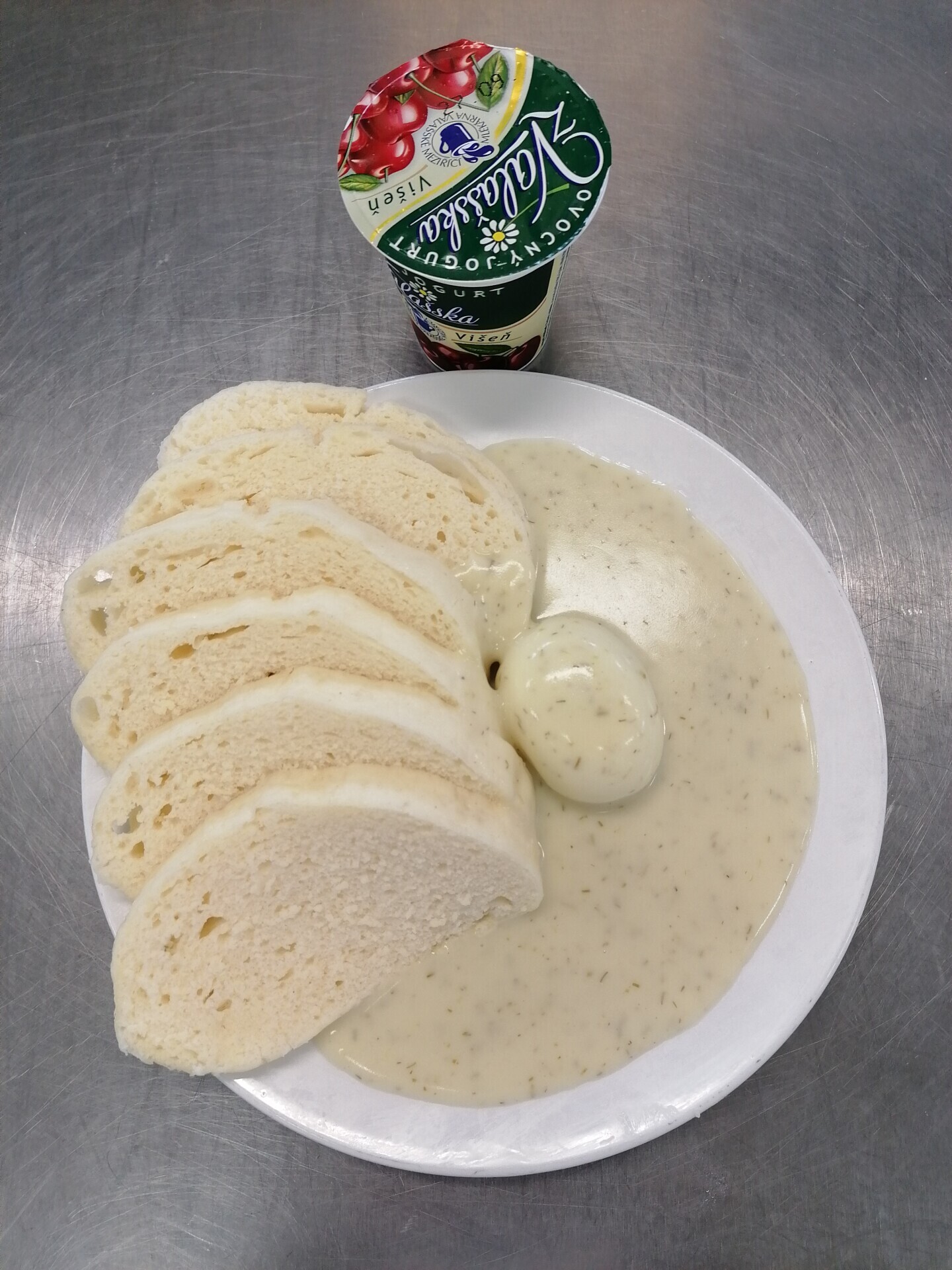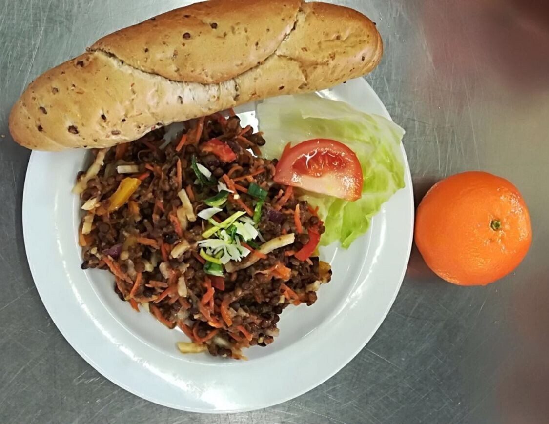 Čočka na kyselo, sázené vejce, sojový rohlík, sterilovaná