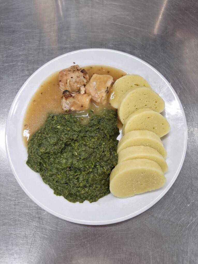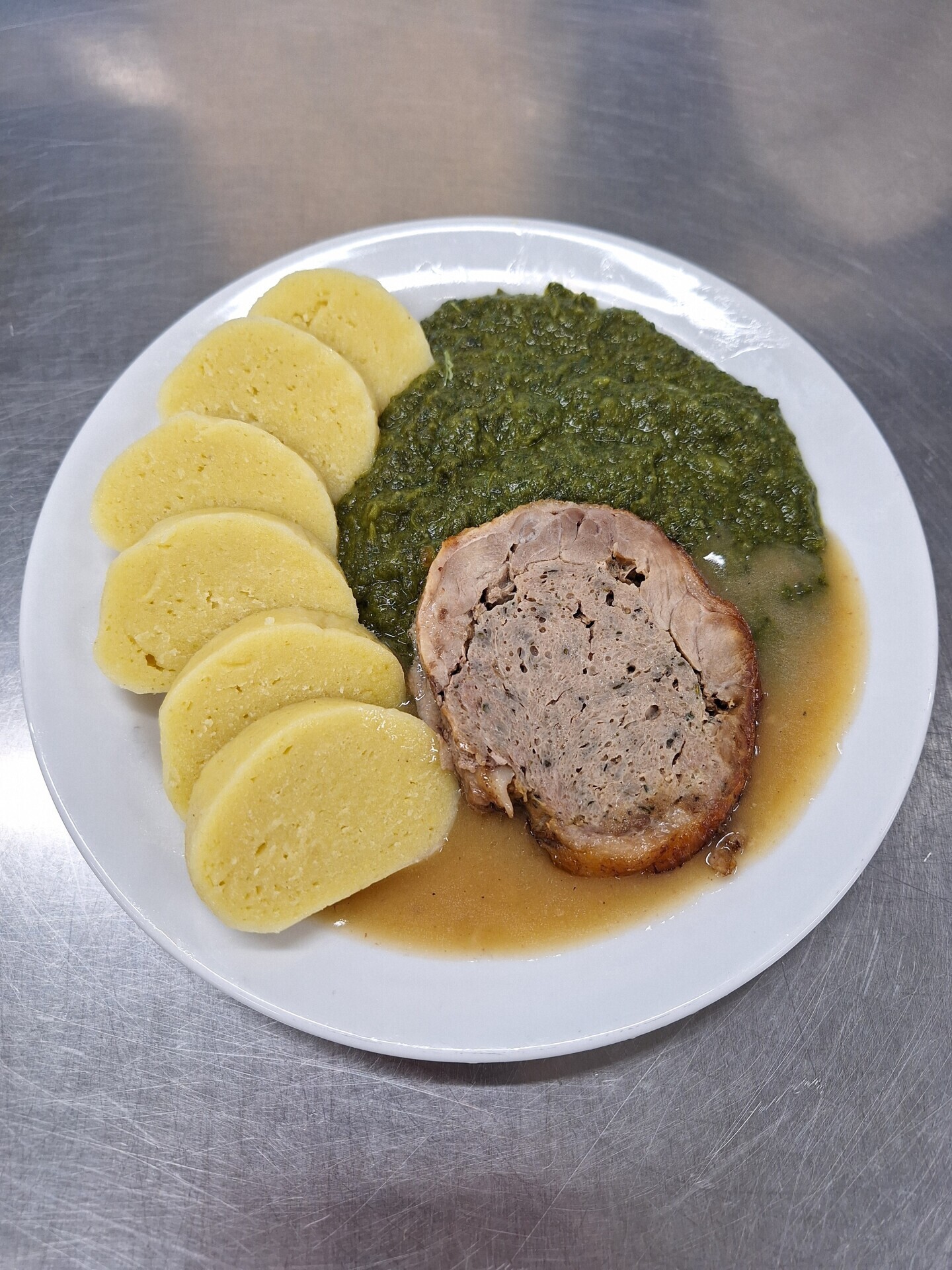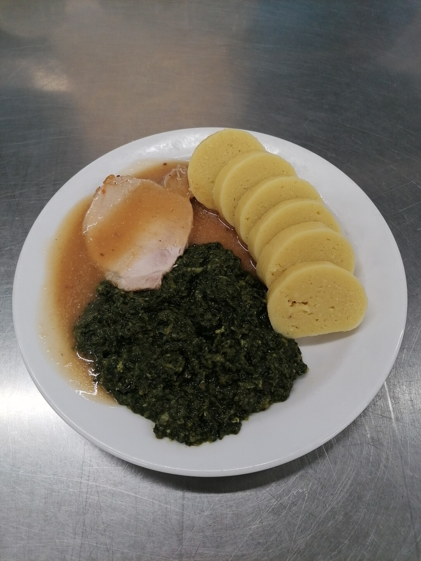 Vepřové výpečky, dušený špenát, bramborový knedlík