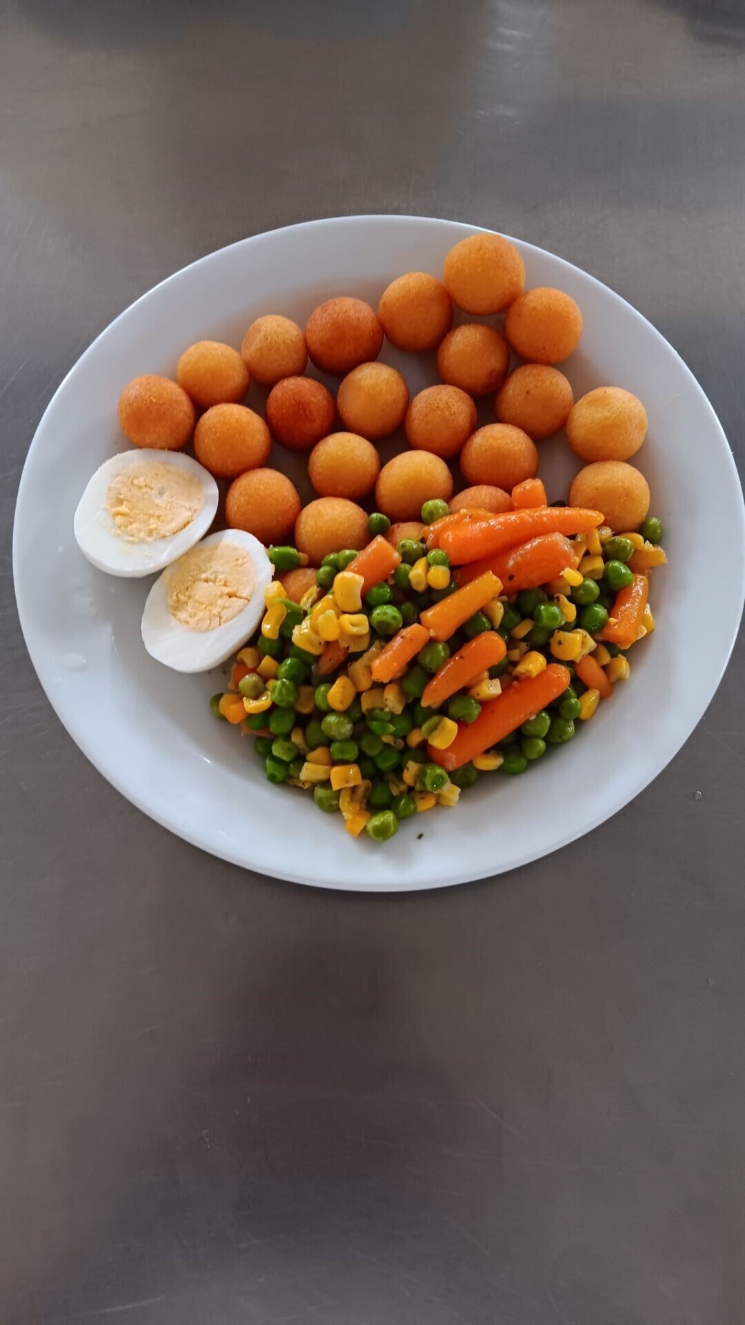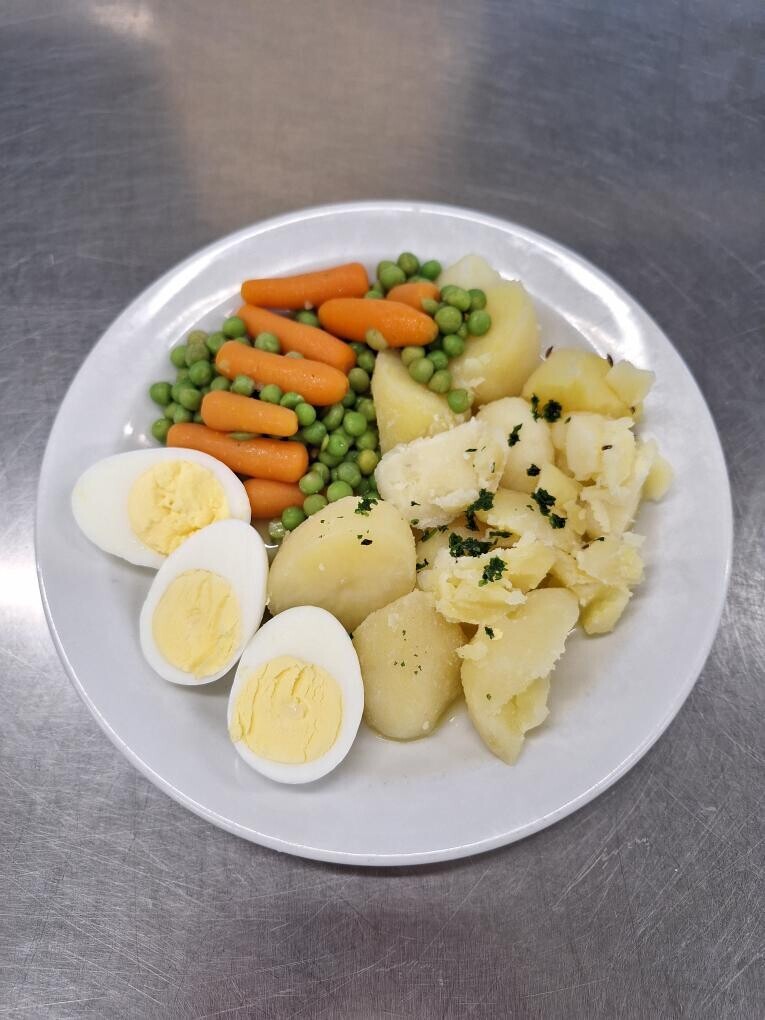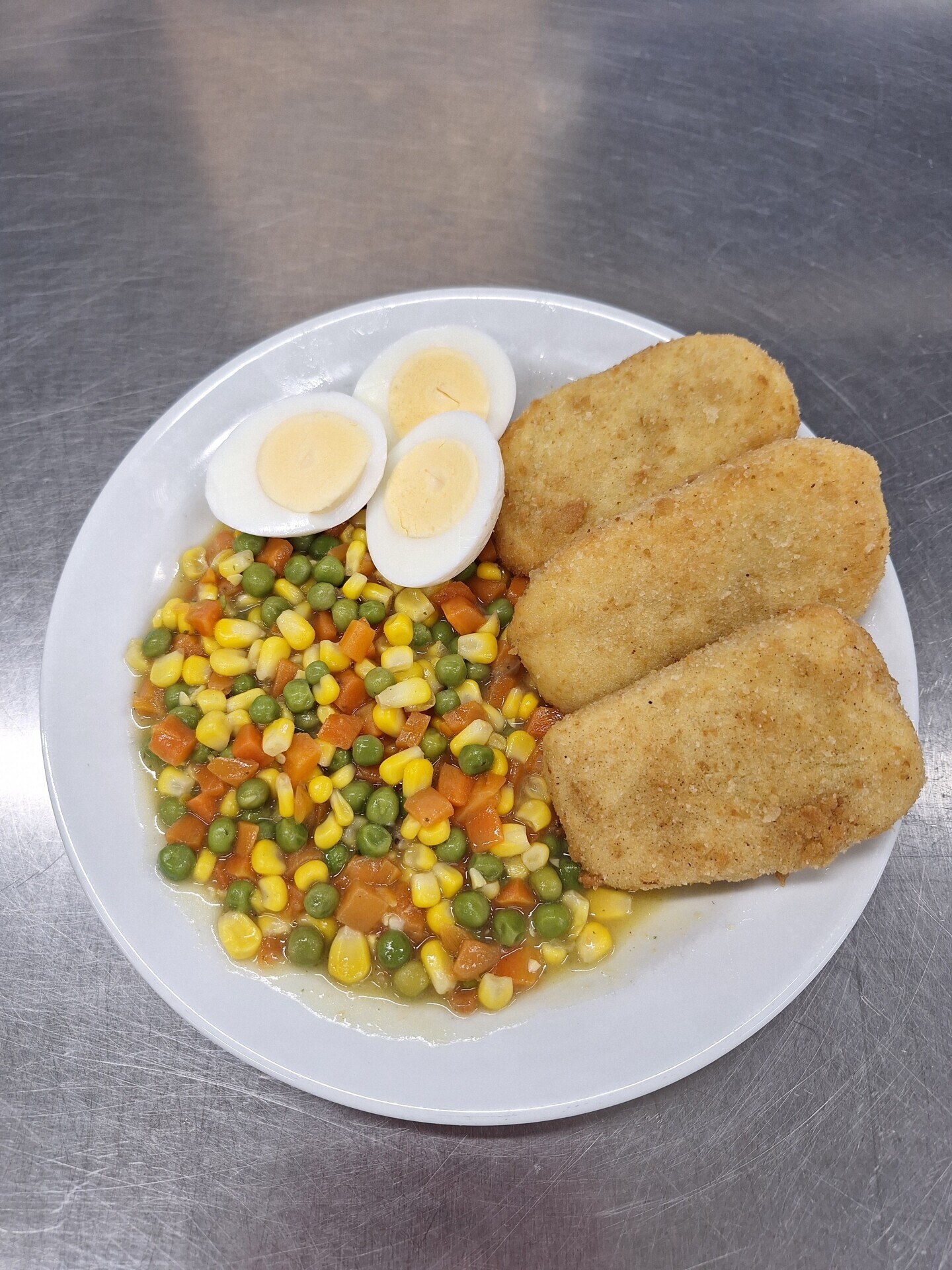 Bramborové krokety, dušená zelenina, vařené vejce