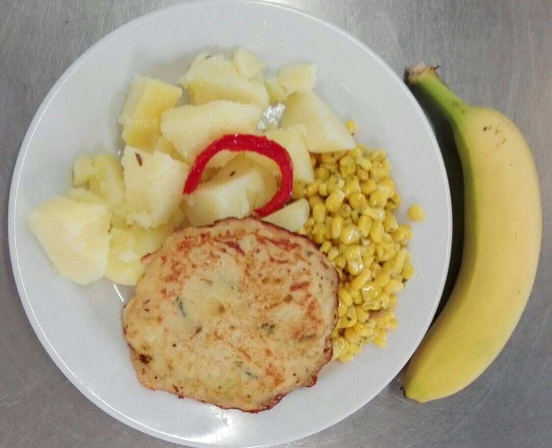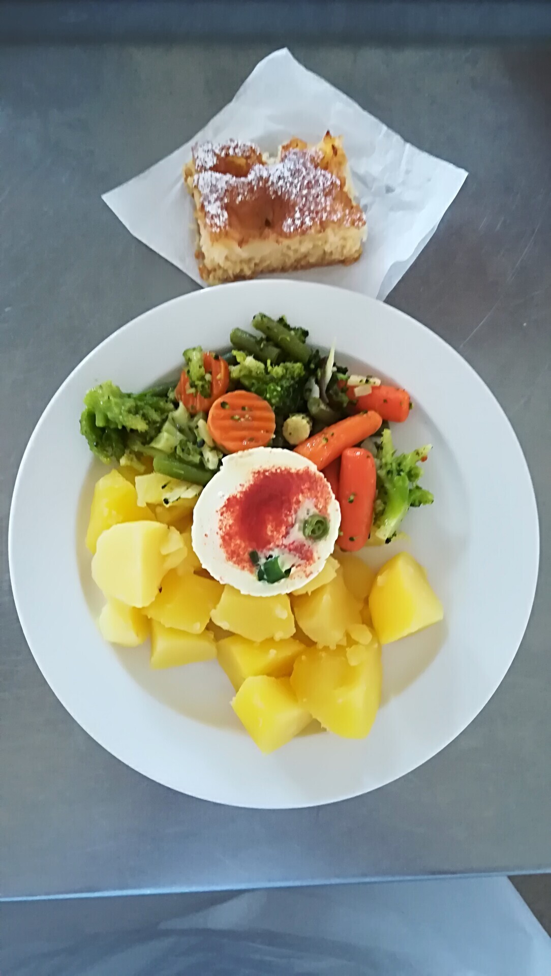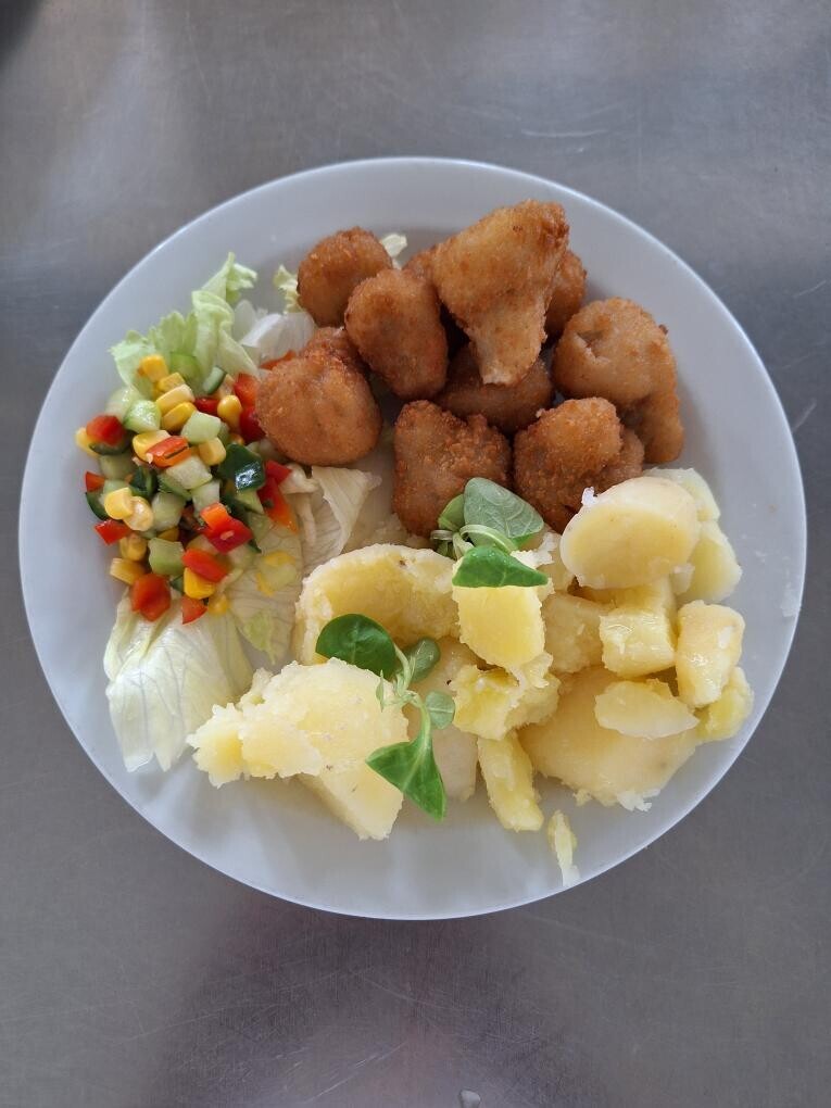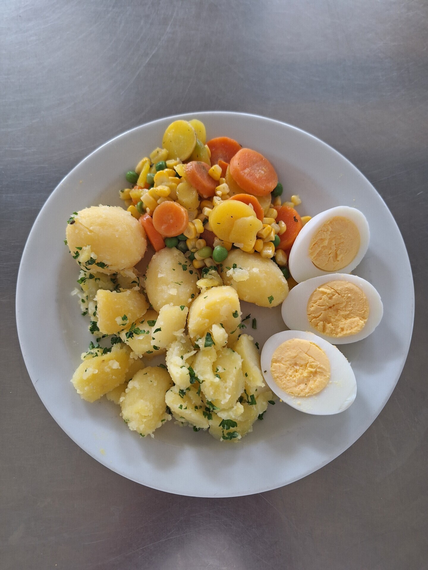 Bramborové krokety, dušená zelenina, vařené vejce