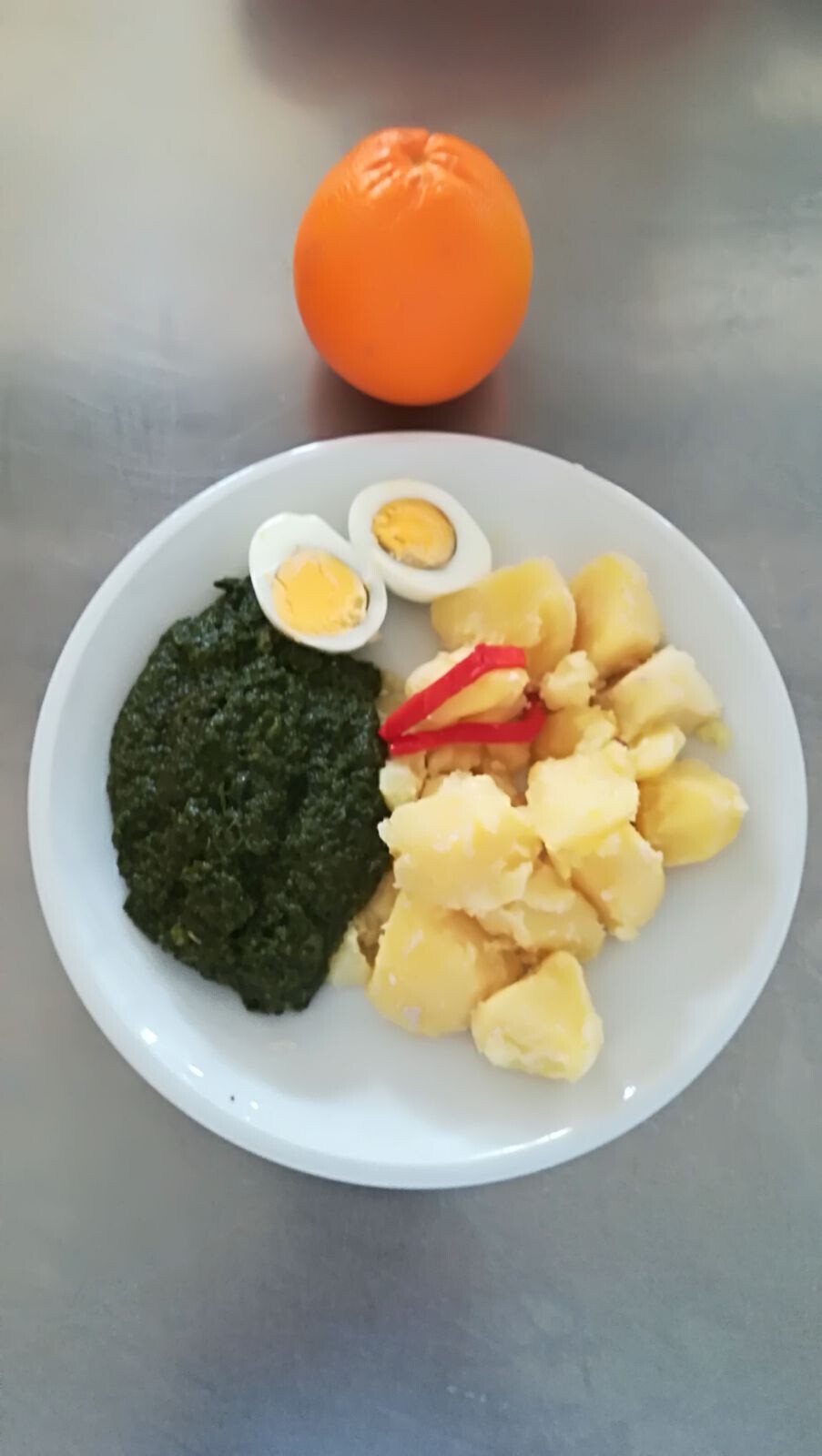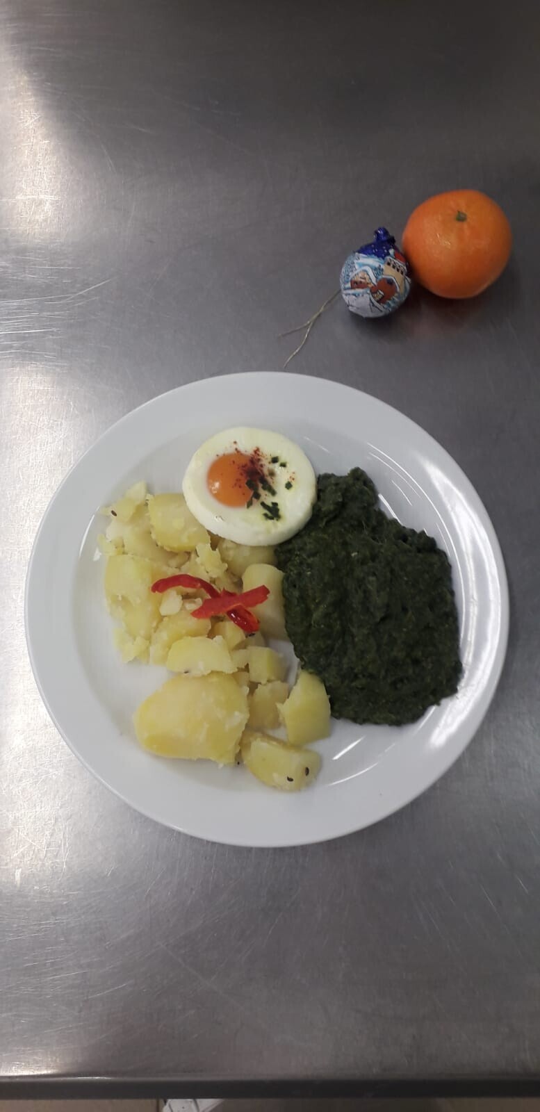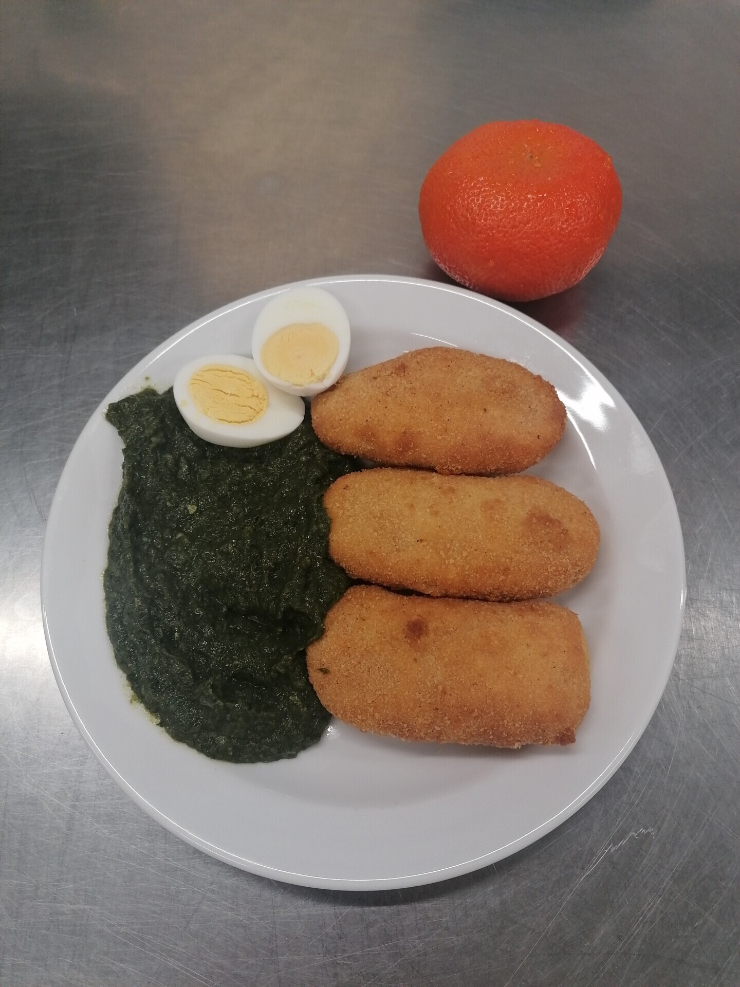 Bramborové krokety, vařené vejce, dušený špenát