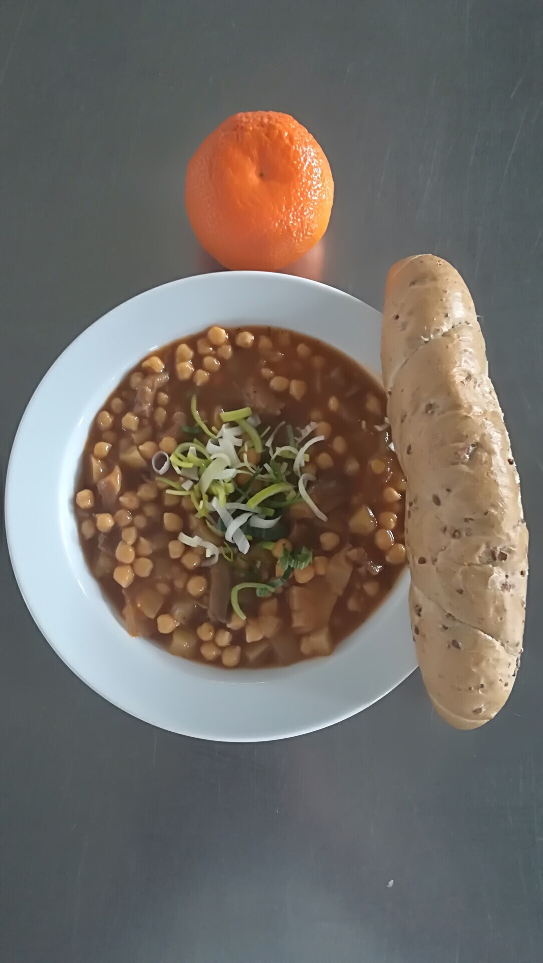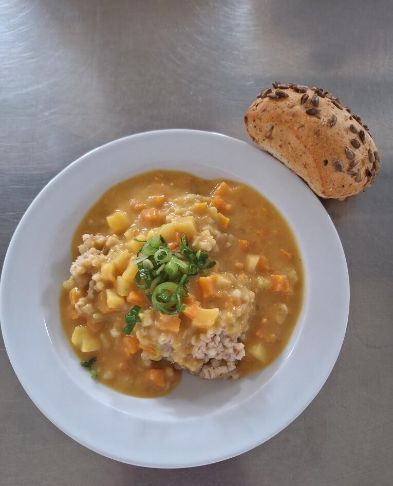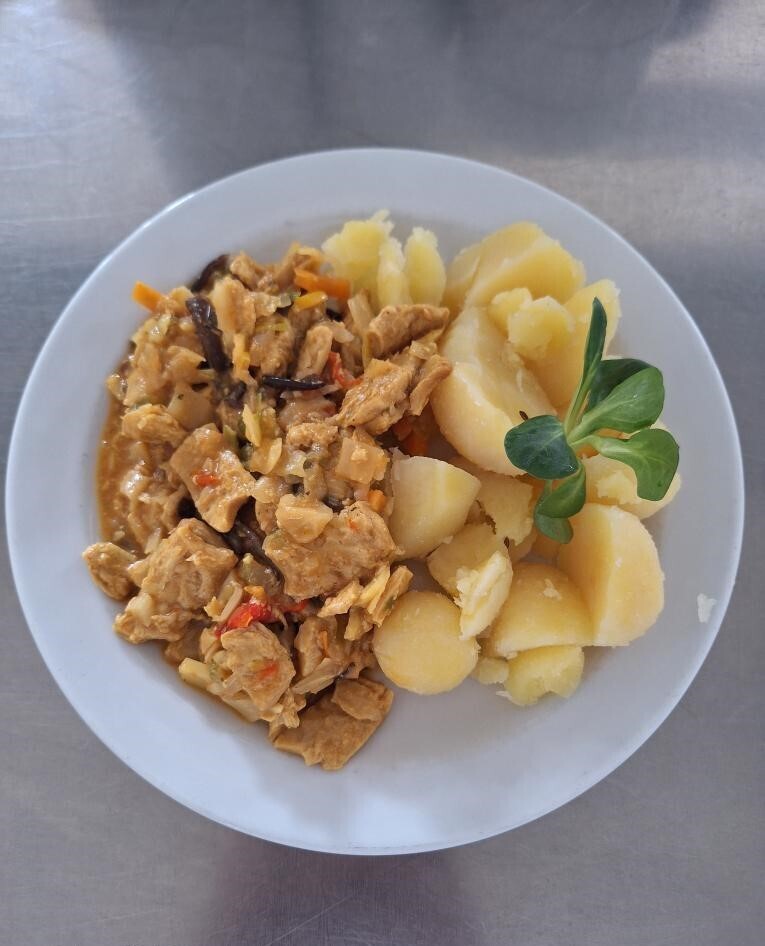 Cizrnový guláš s hlívou ústřičnou, sojový rohlík