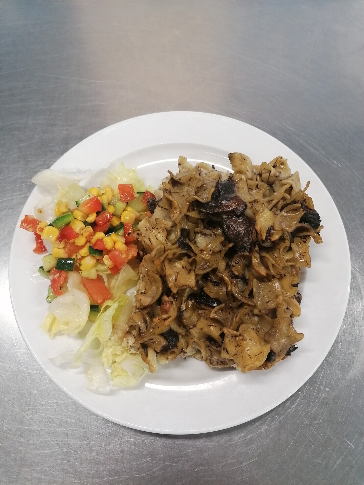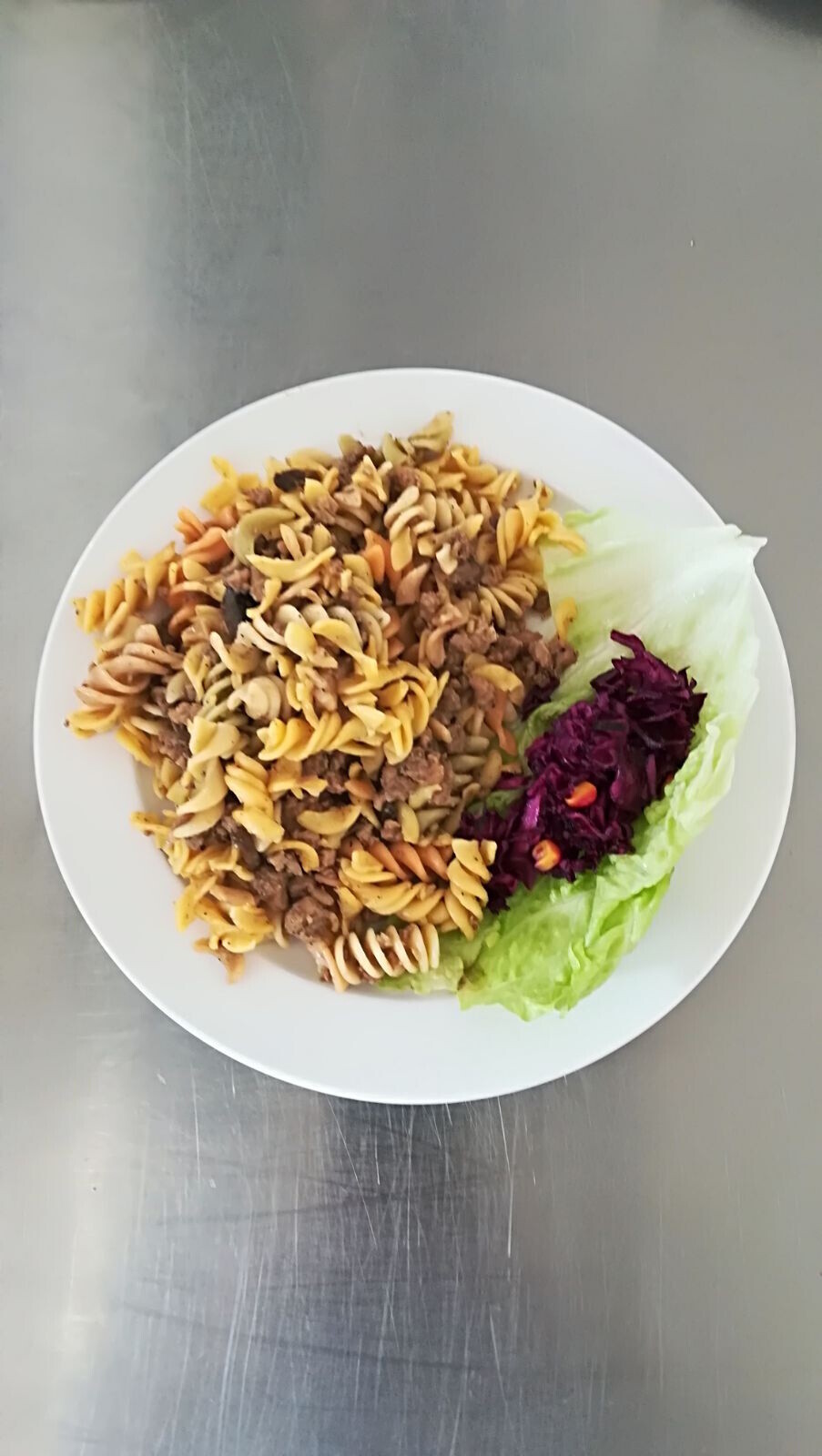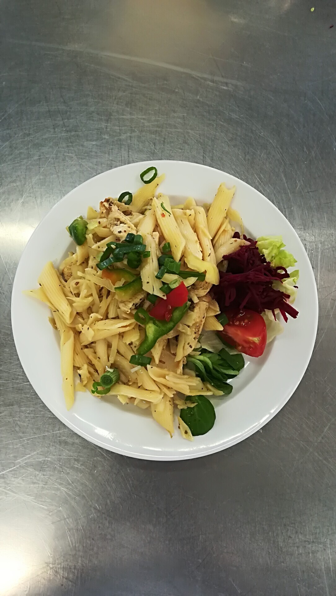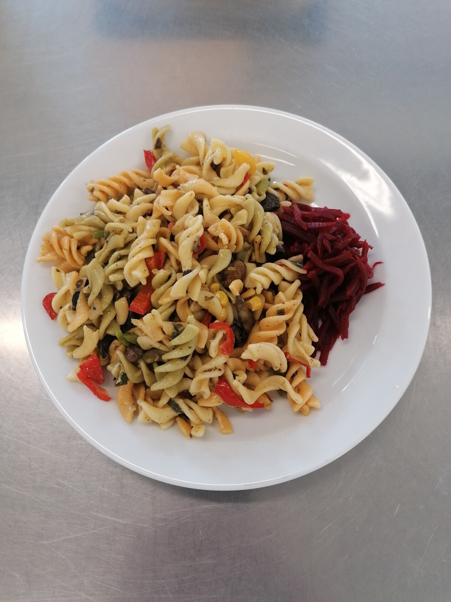 Barevné těstoviny se žampiony a zeleninou (žampiony, paprika, pórek, č. řepa)