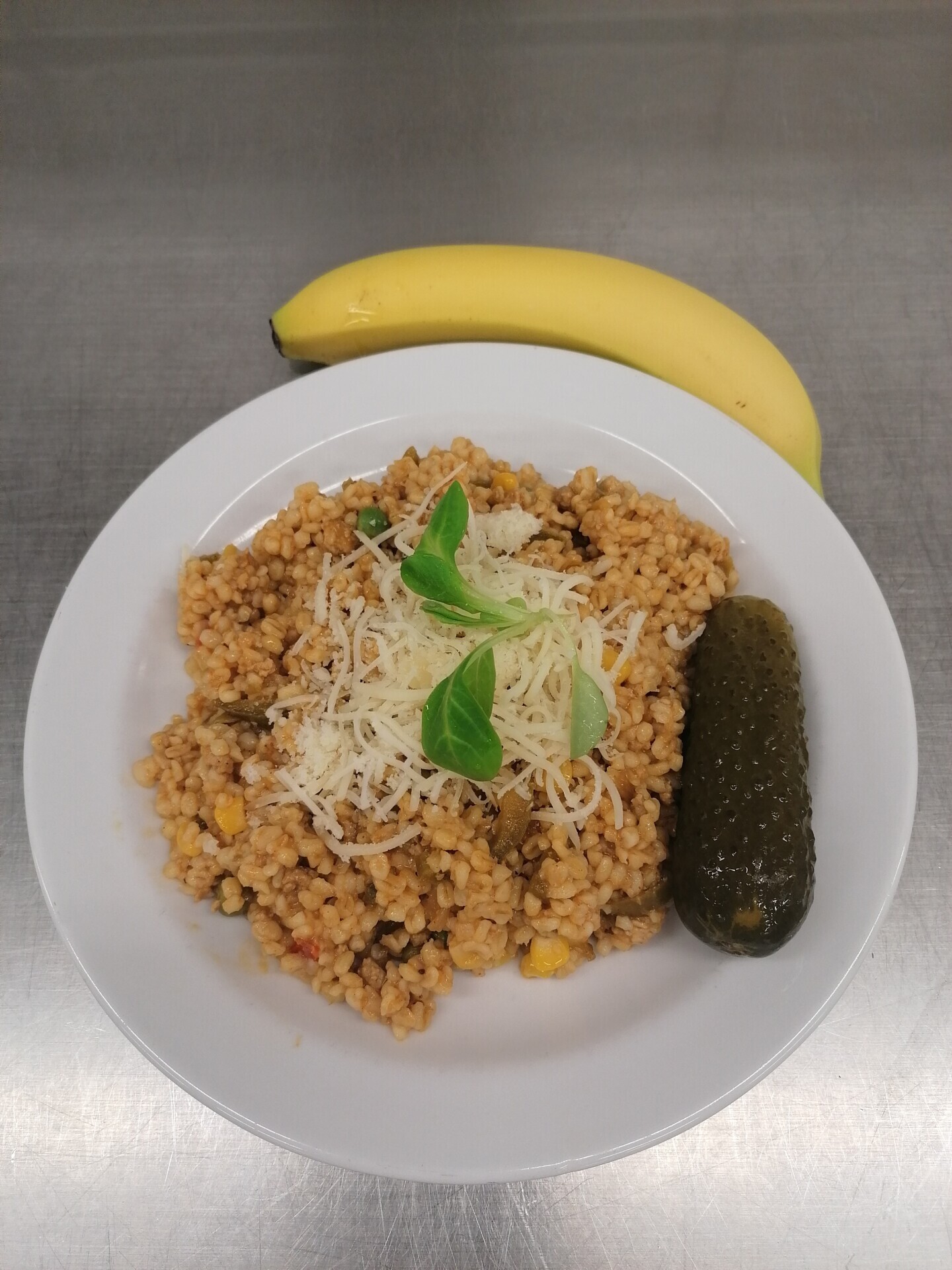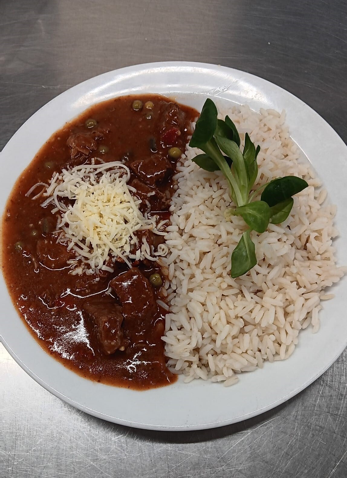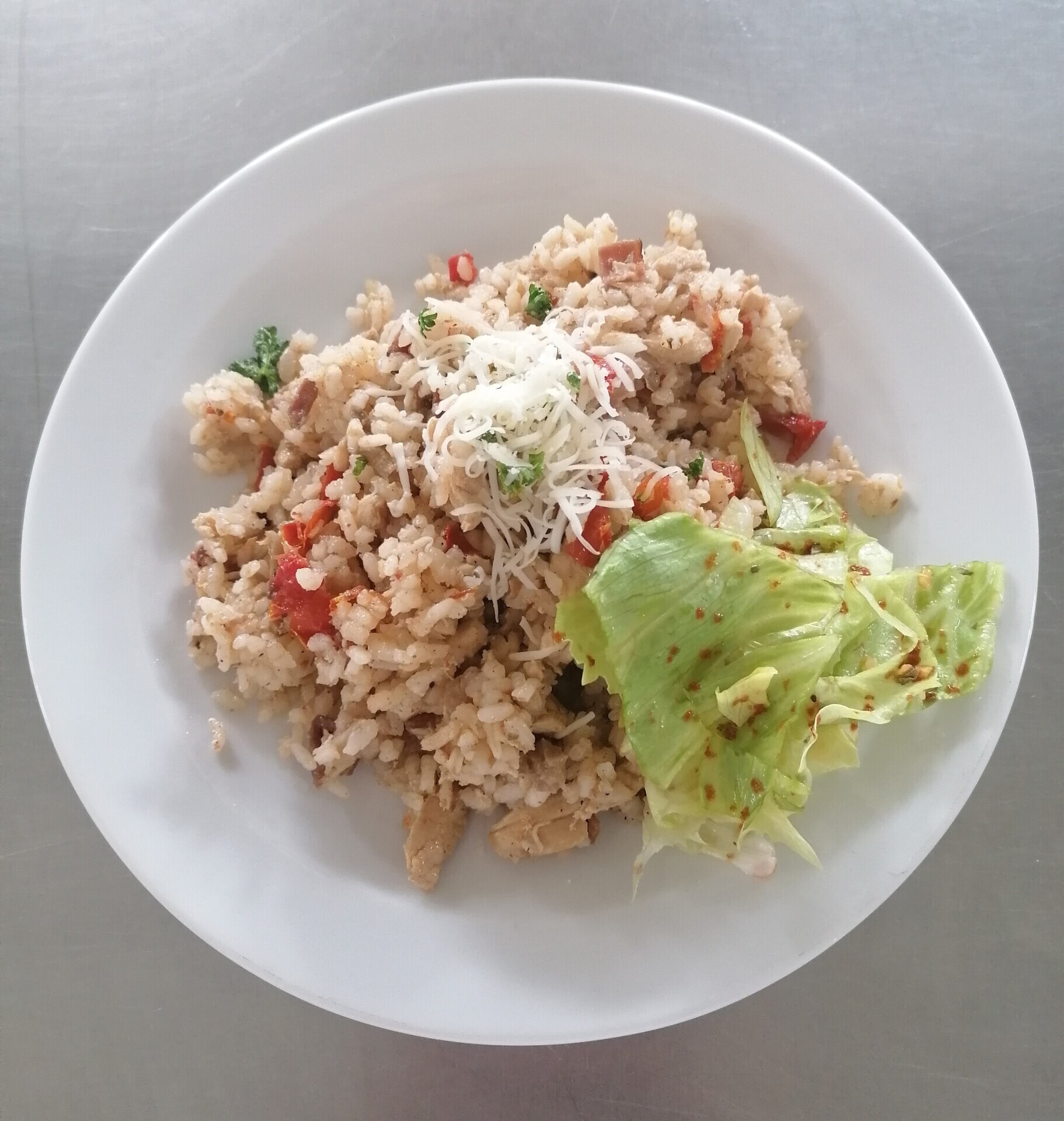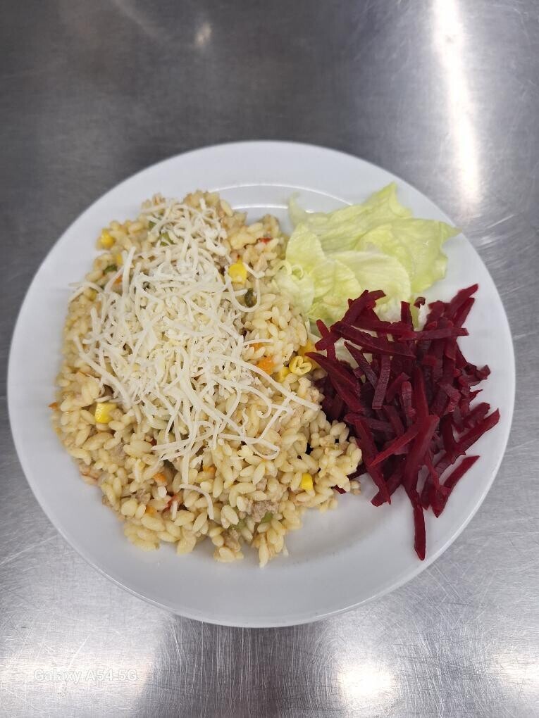Vepřové rizoto, strouhaný sýr, zeleninová přízdoba