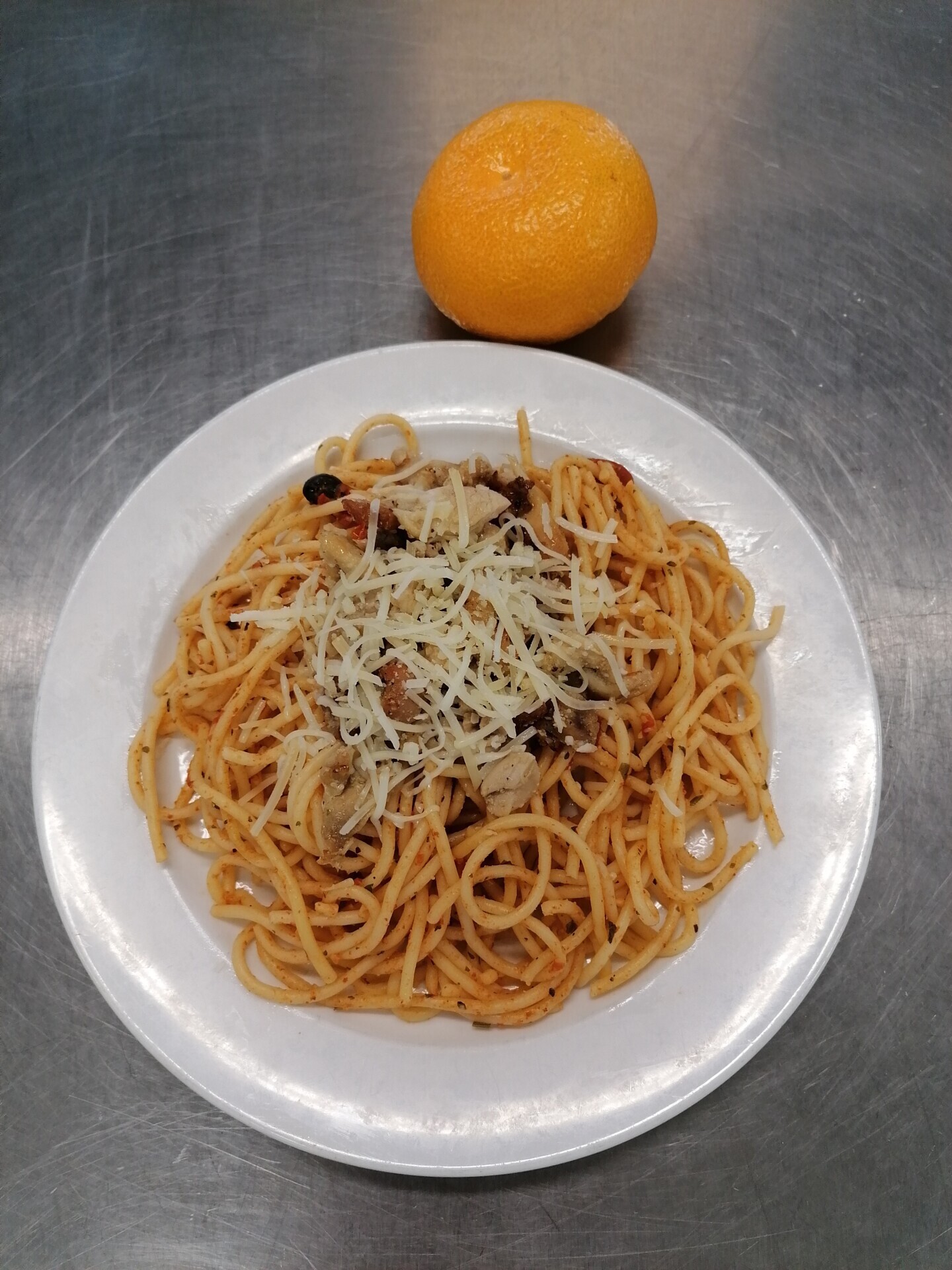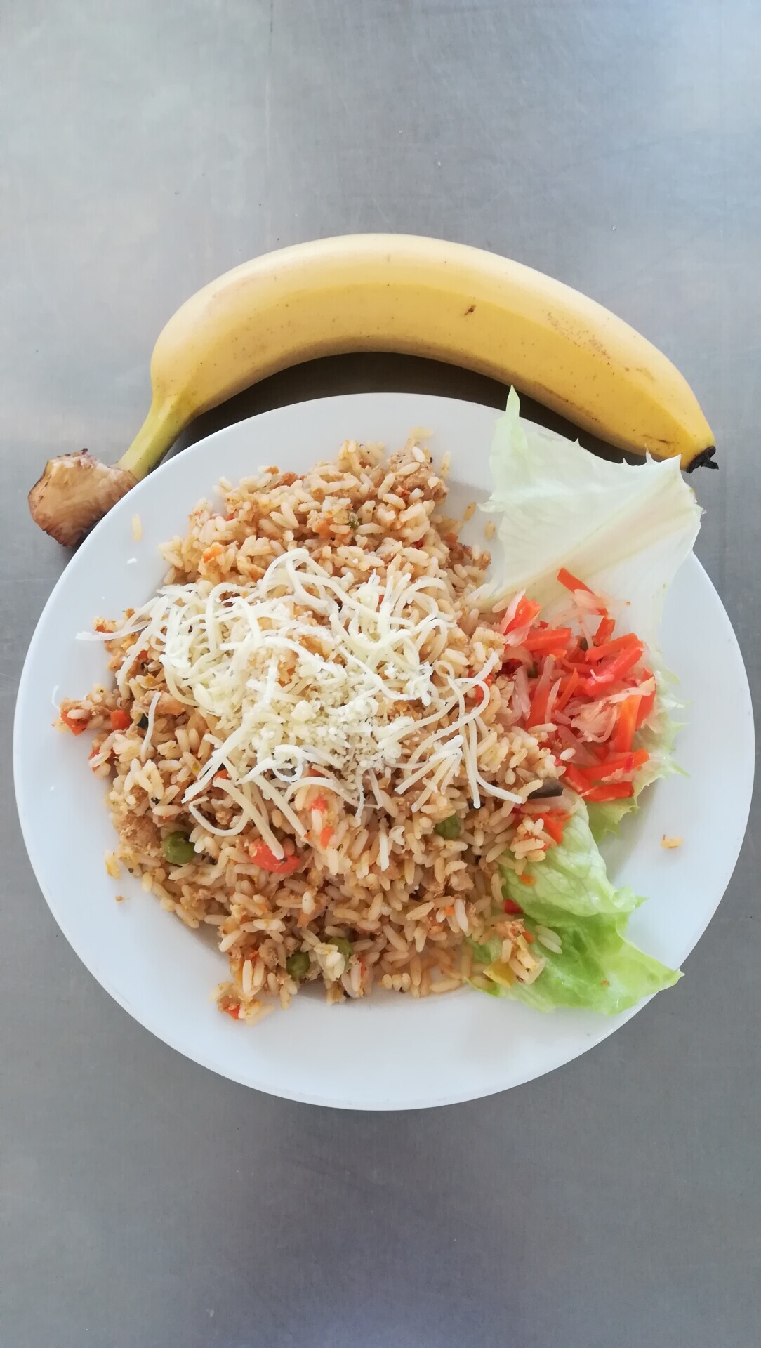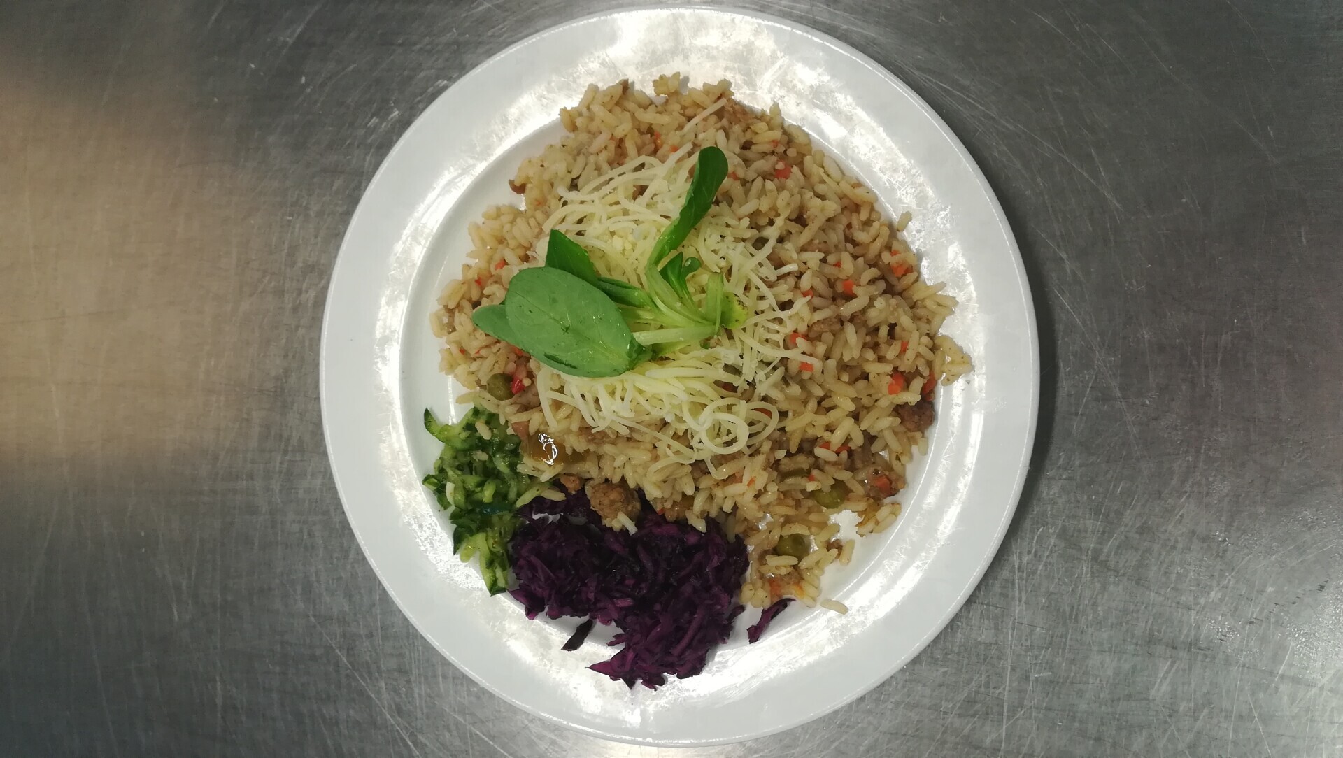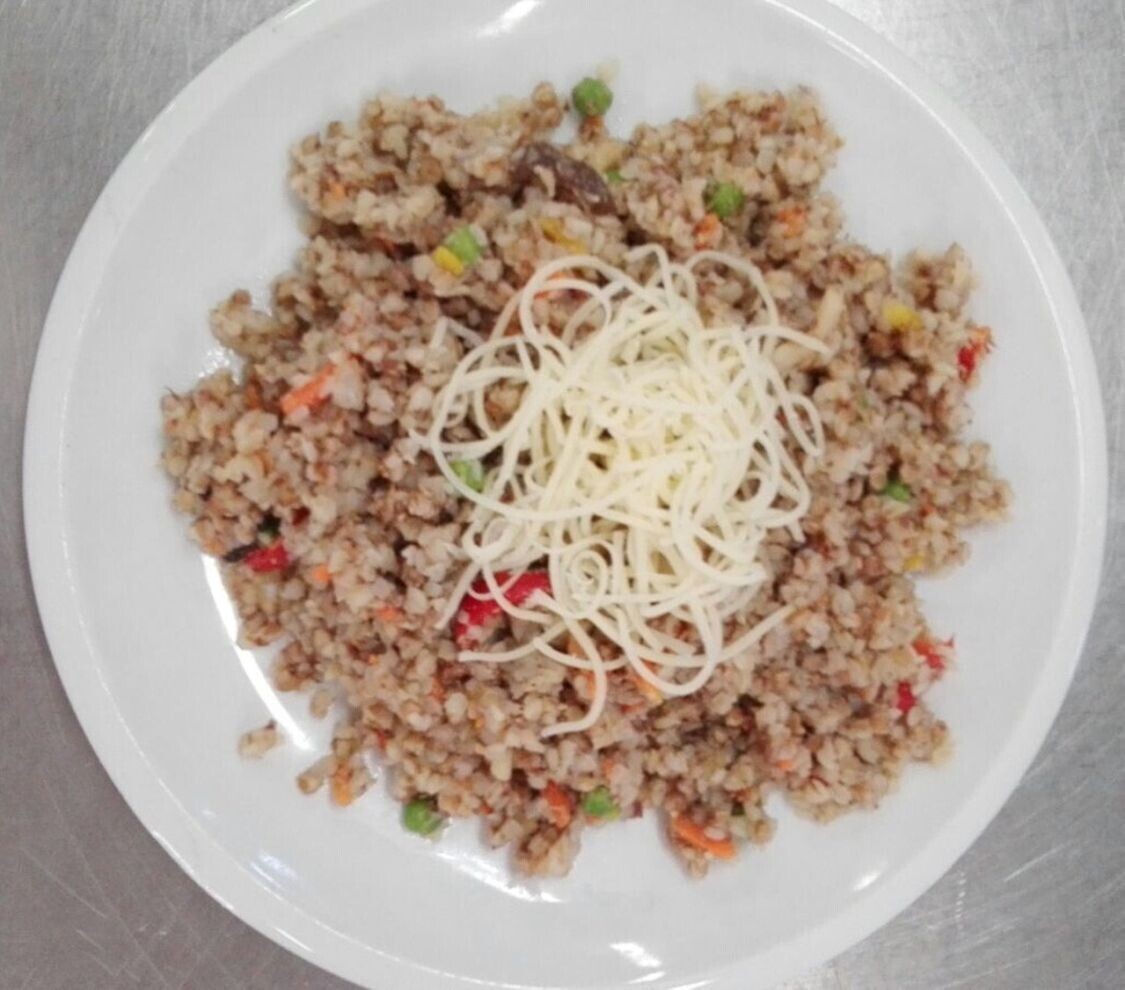 Vepřové rizoto, strouhaný sýr, zeleninová přízdoba