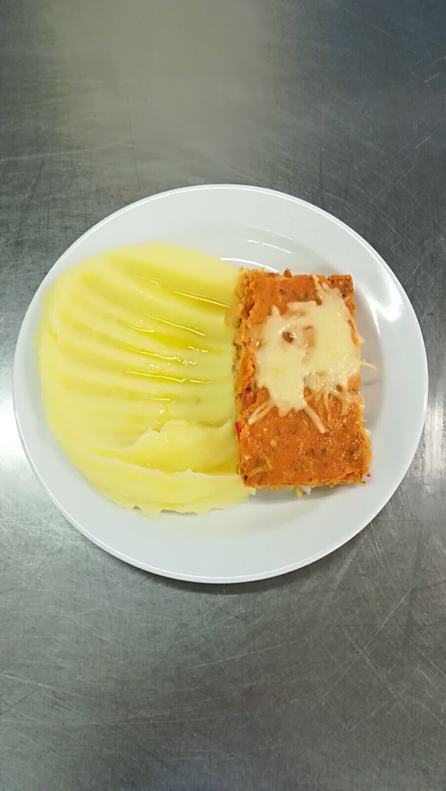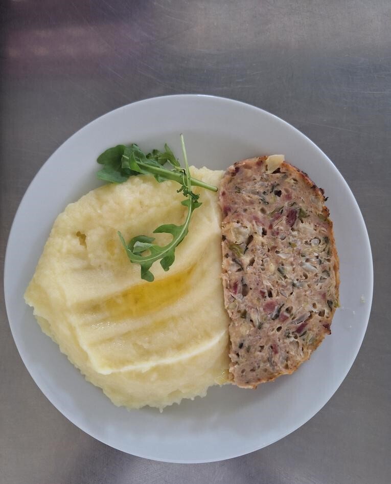 Zahradnická sekaná se sójou (vepř. a hov. maso, soj. gran., hrášek, mrkev, paprika), brambor. kaše