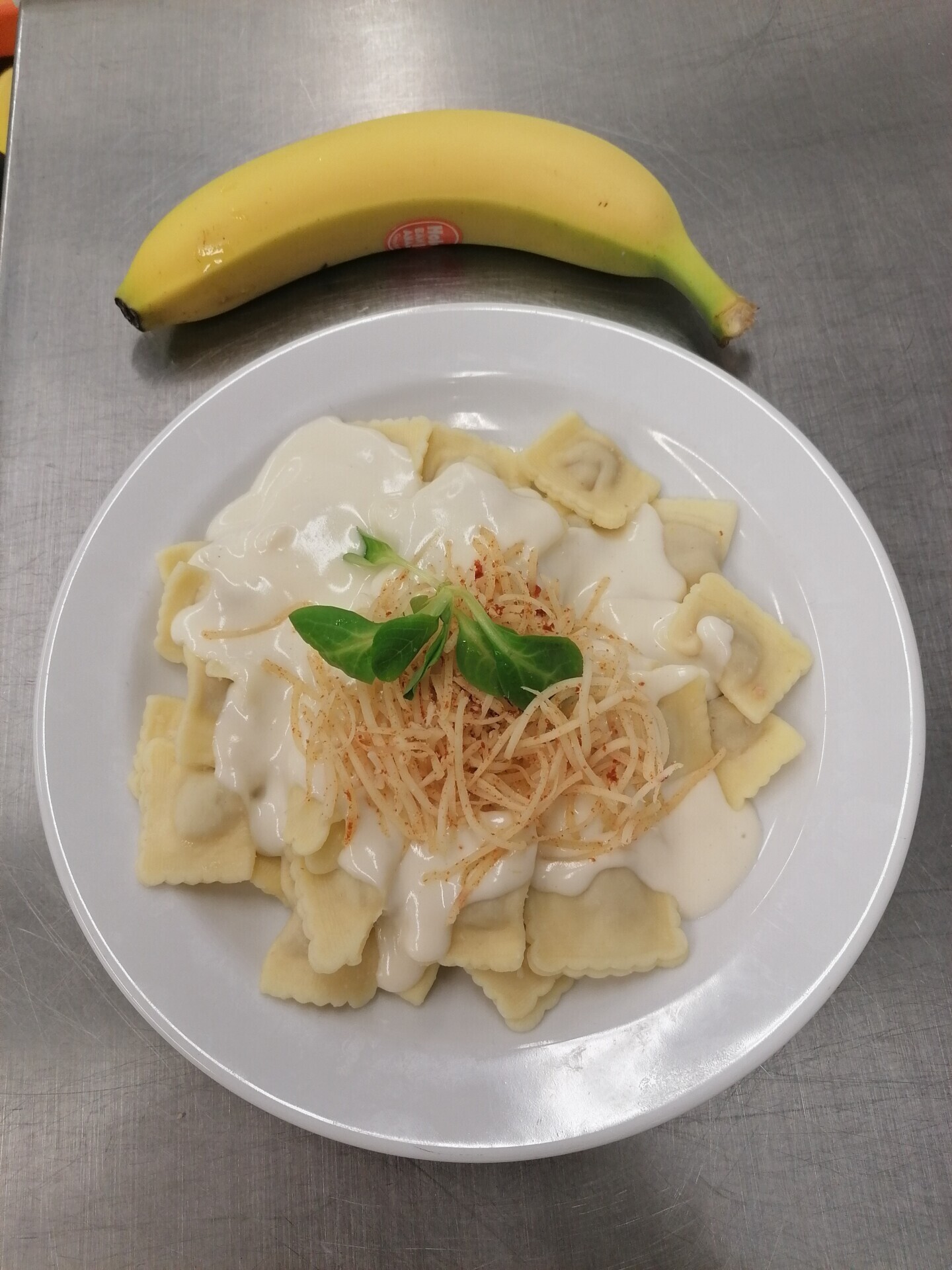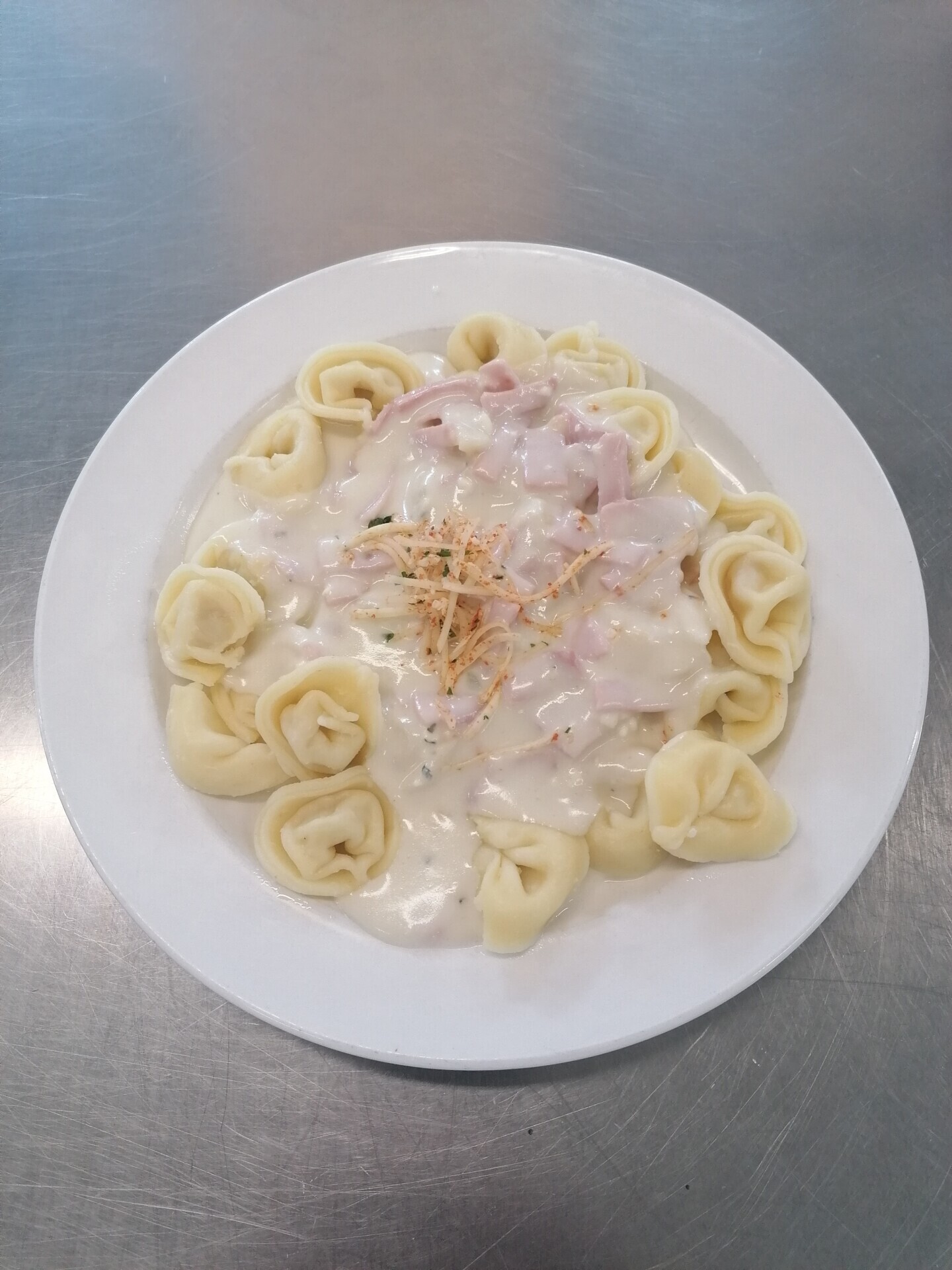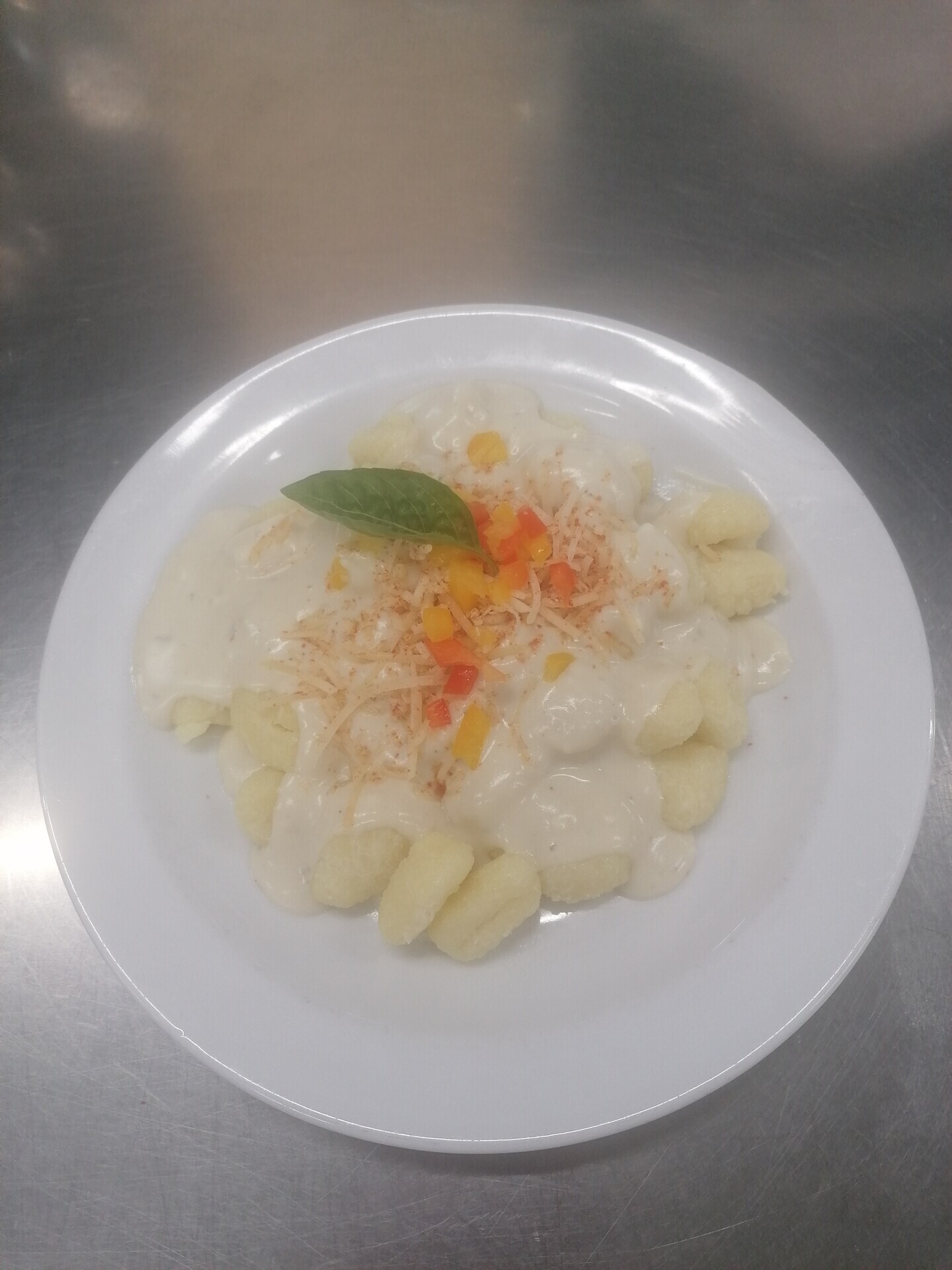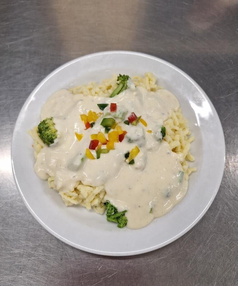 Bramborové noky, sýrová omáčka se šunkou