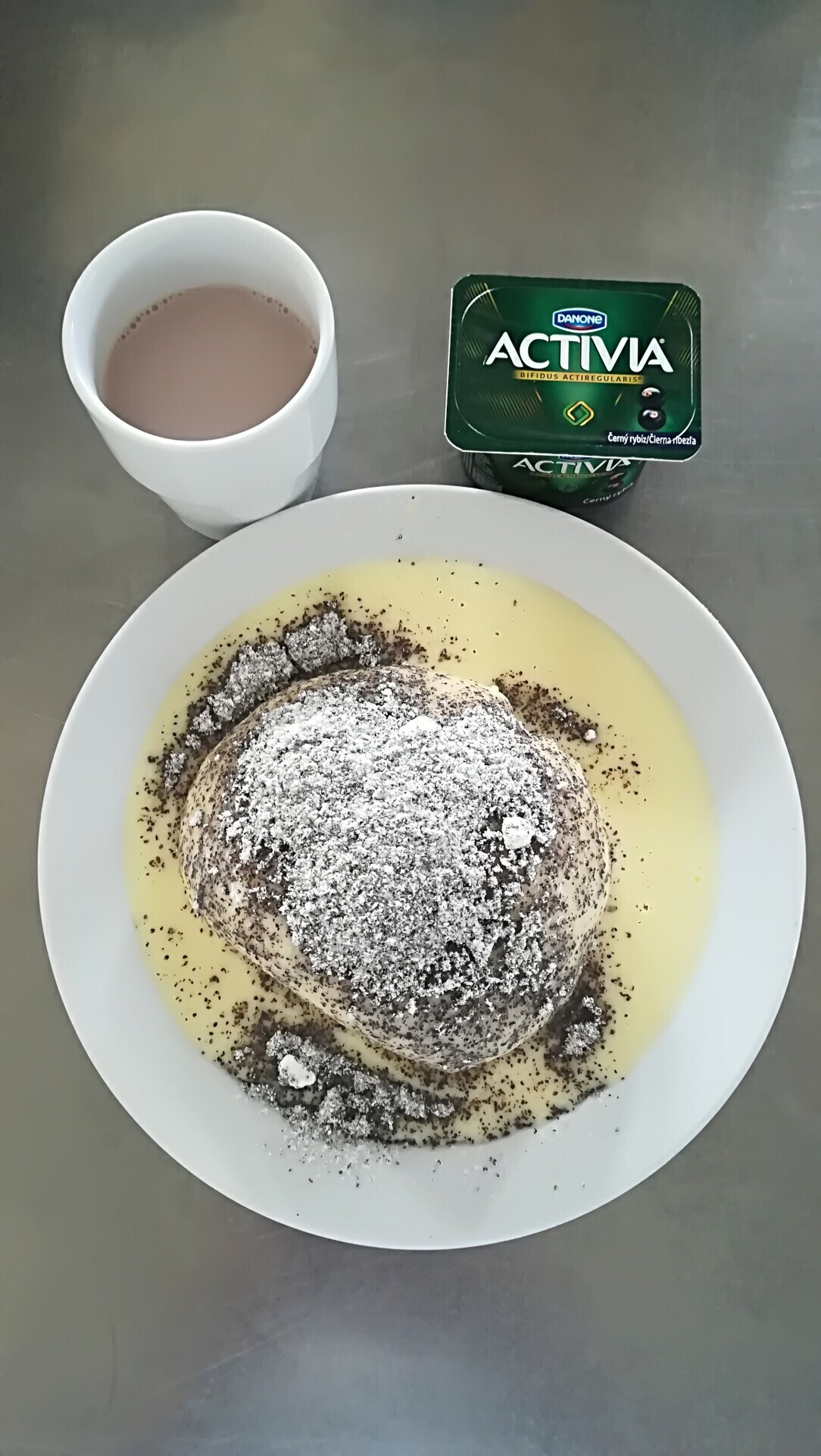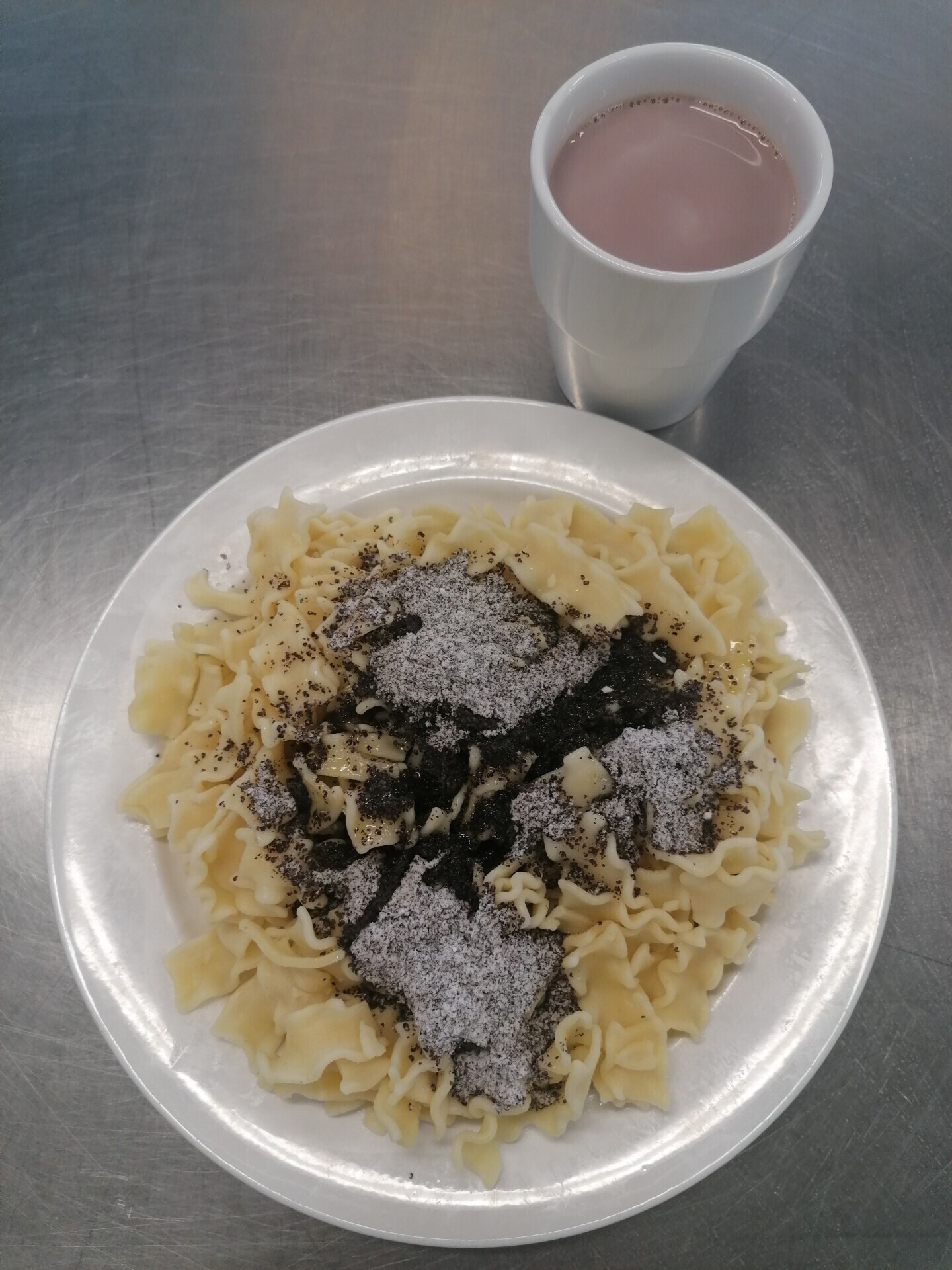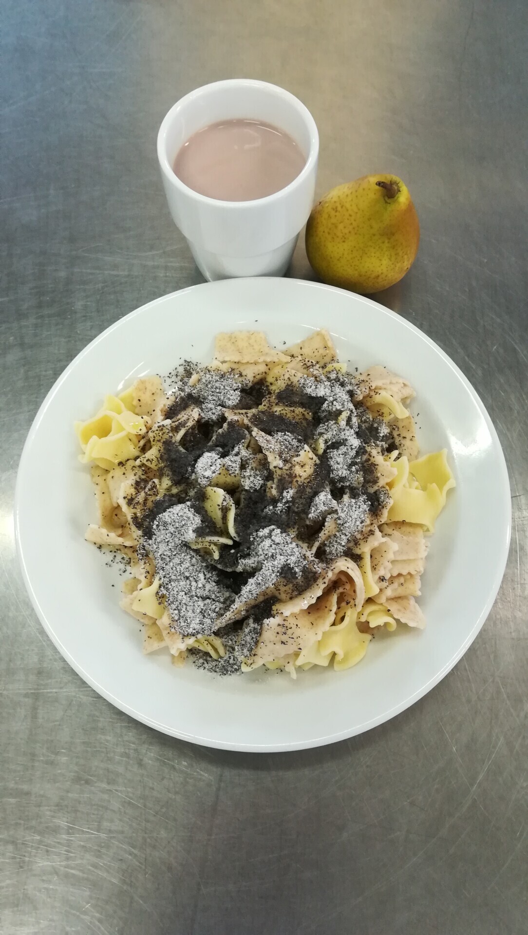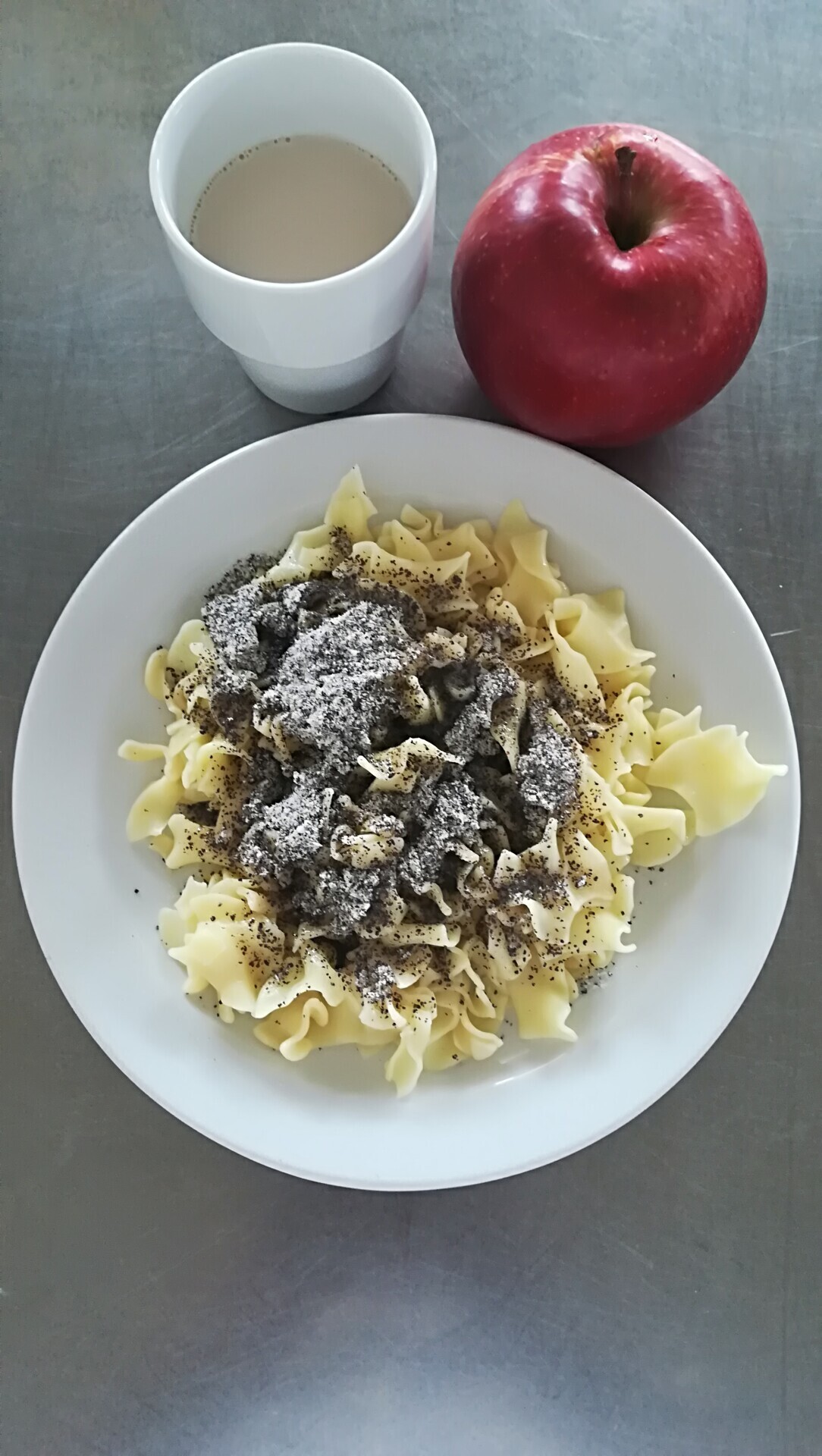 Duo nudle s mákem, maštěné máslem, ovoce, ochucené mléko