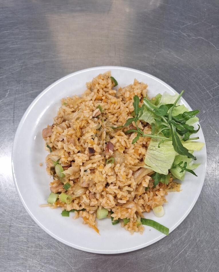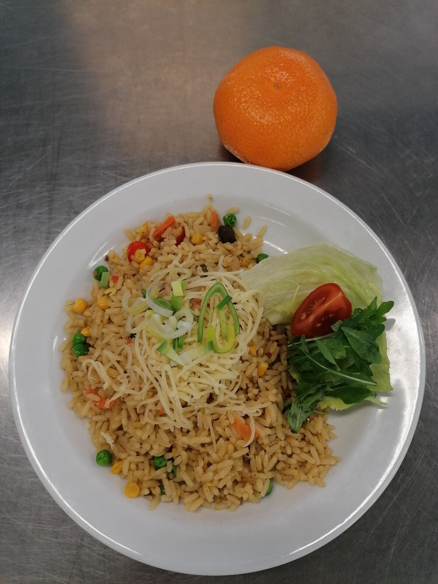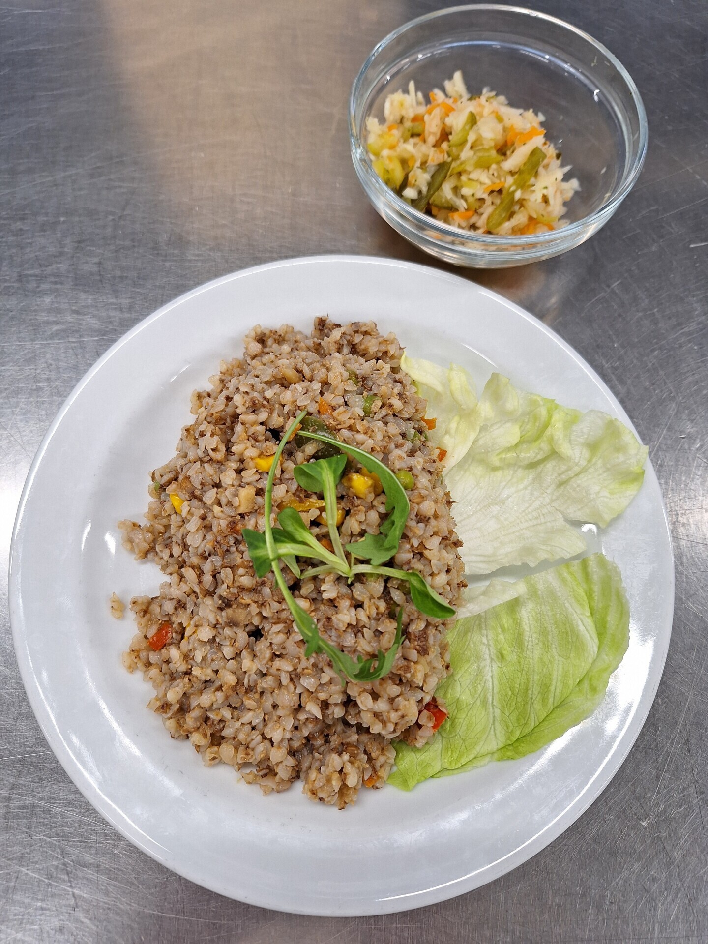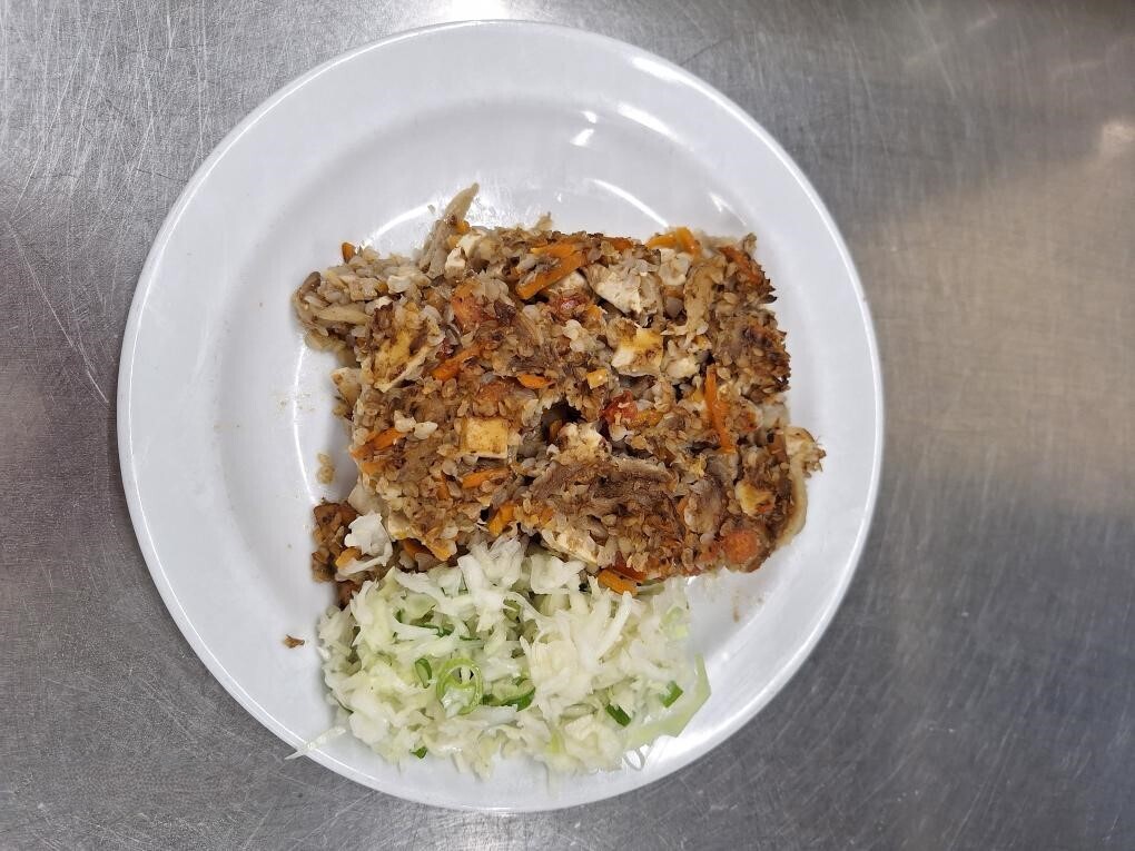 Zeleninová rýže (rýže, zelí, paprika, cibule, houby, mrkev, česnek, sójové klíčky), zel. přízdoba