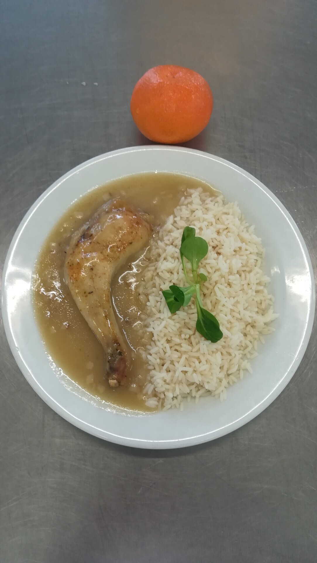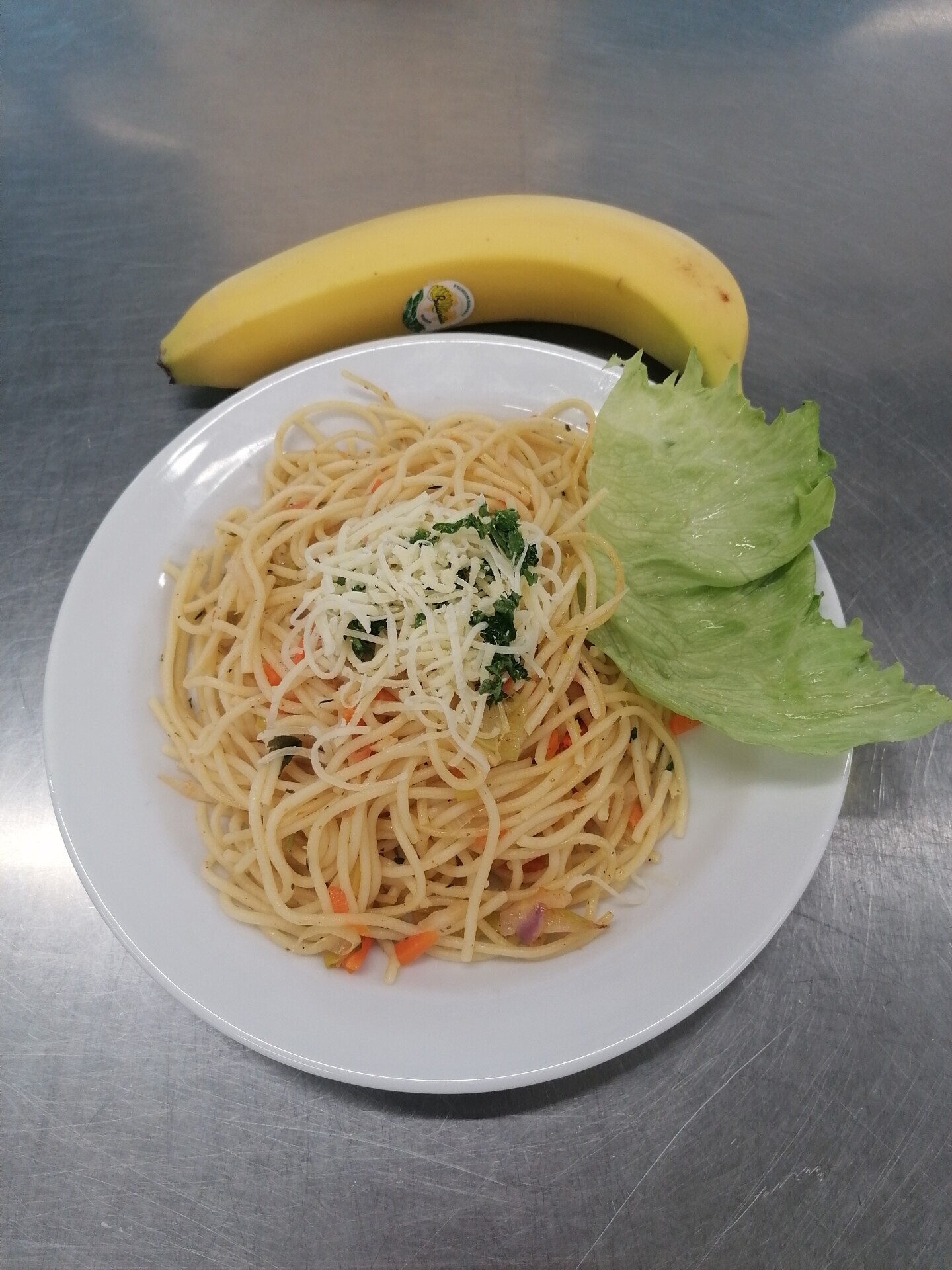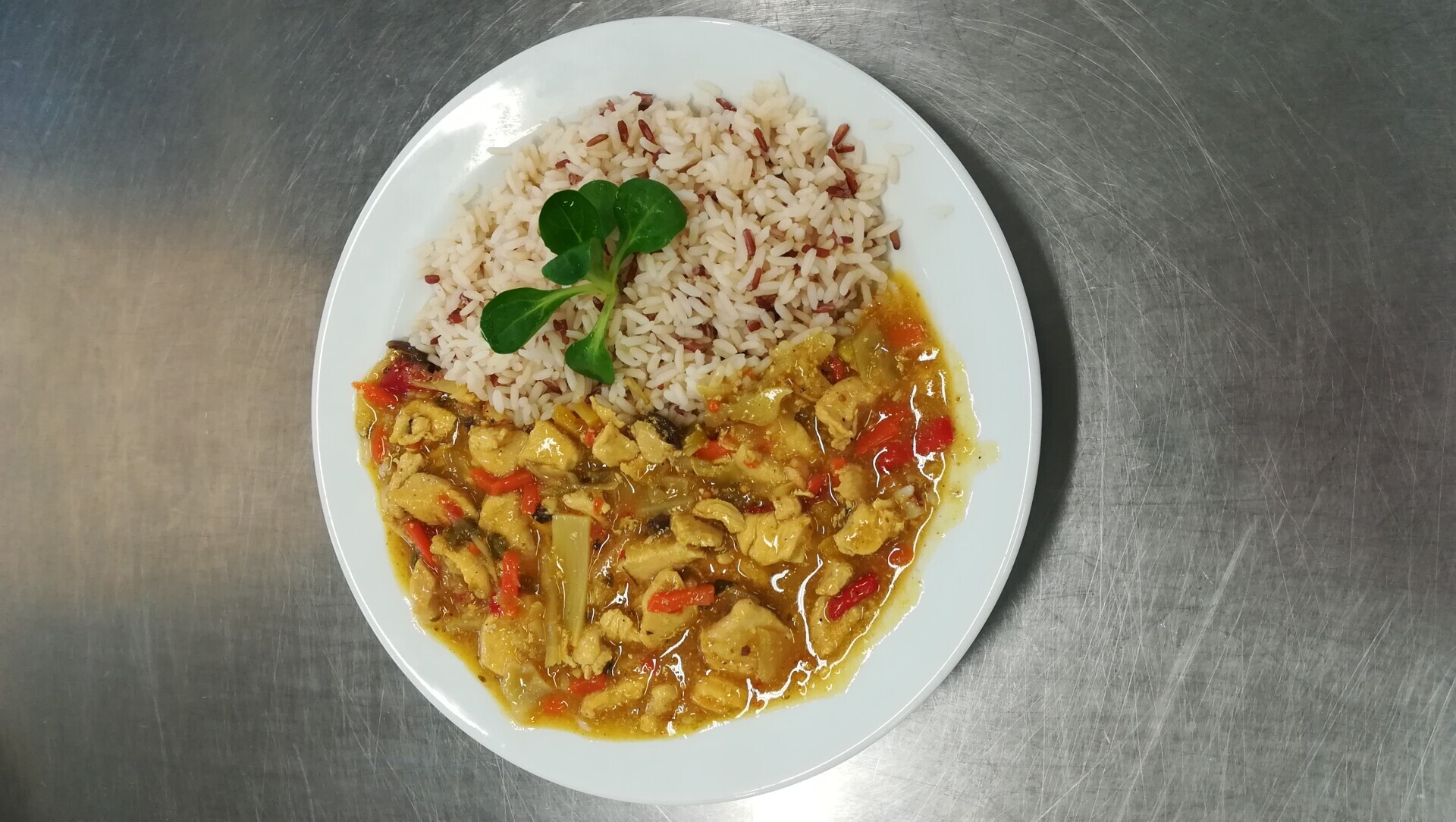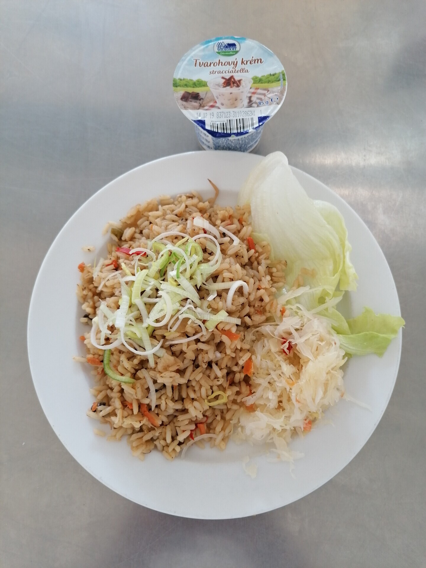 Zeleninová rýže (rýže, zelí, paprika, cibule, houby, mrkev, česnek, sójové klíčky), zel. přízdoba