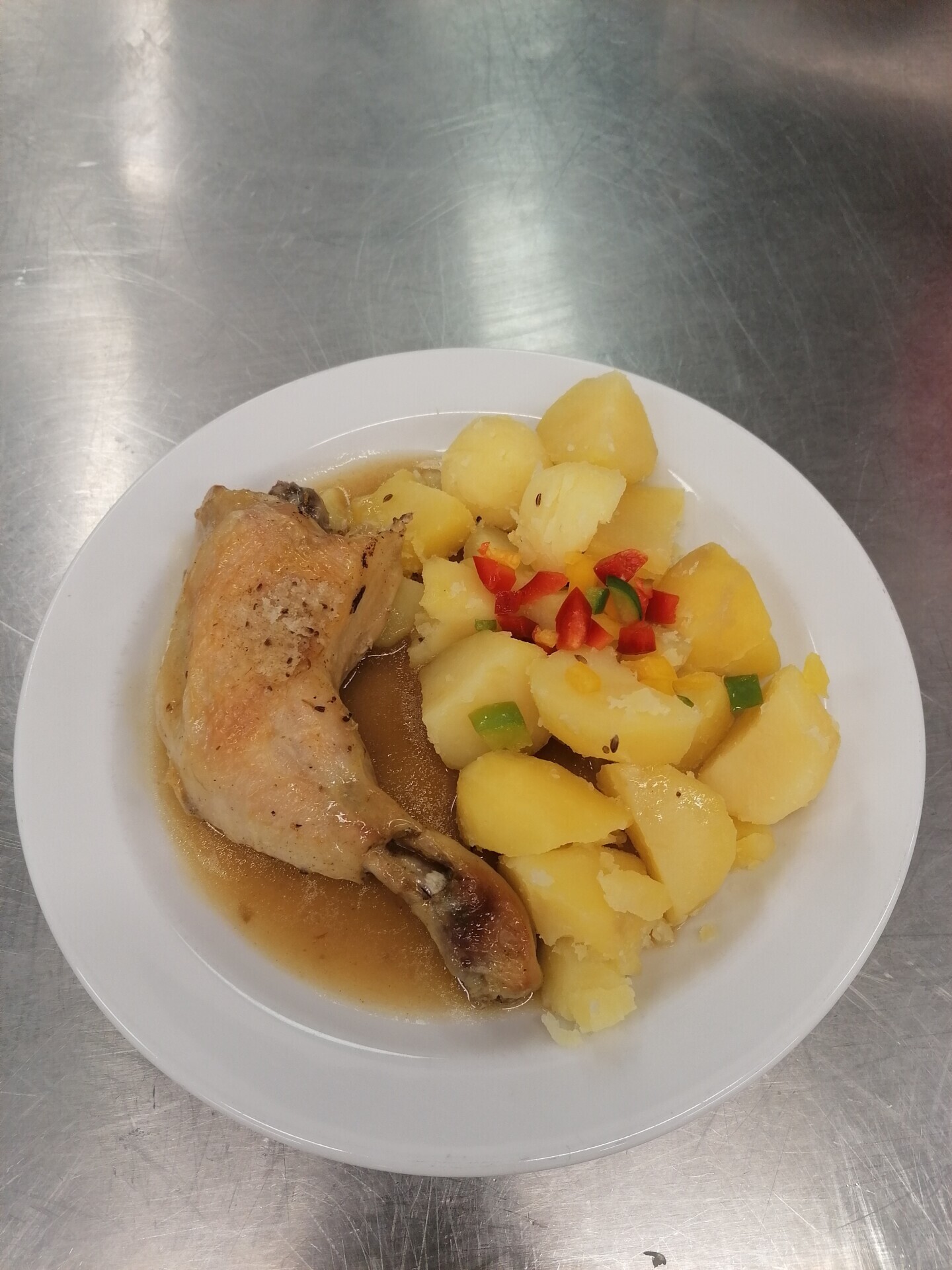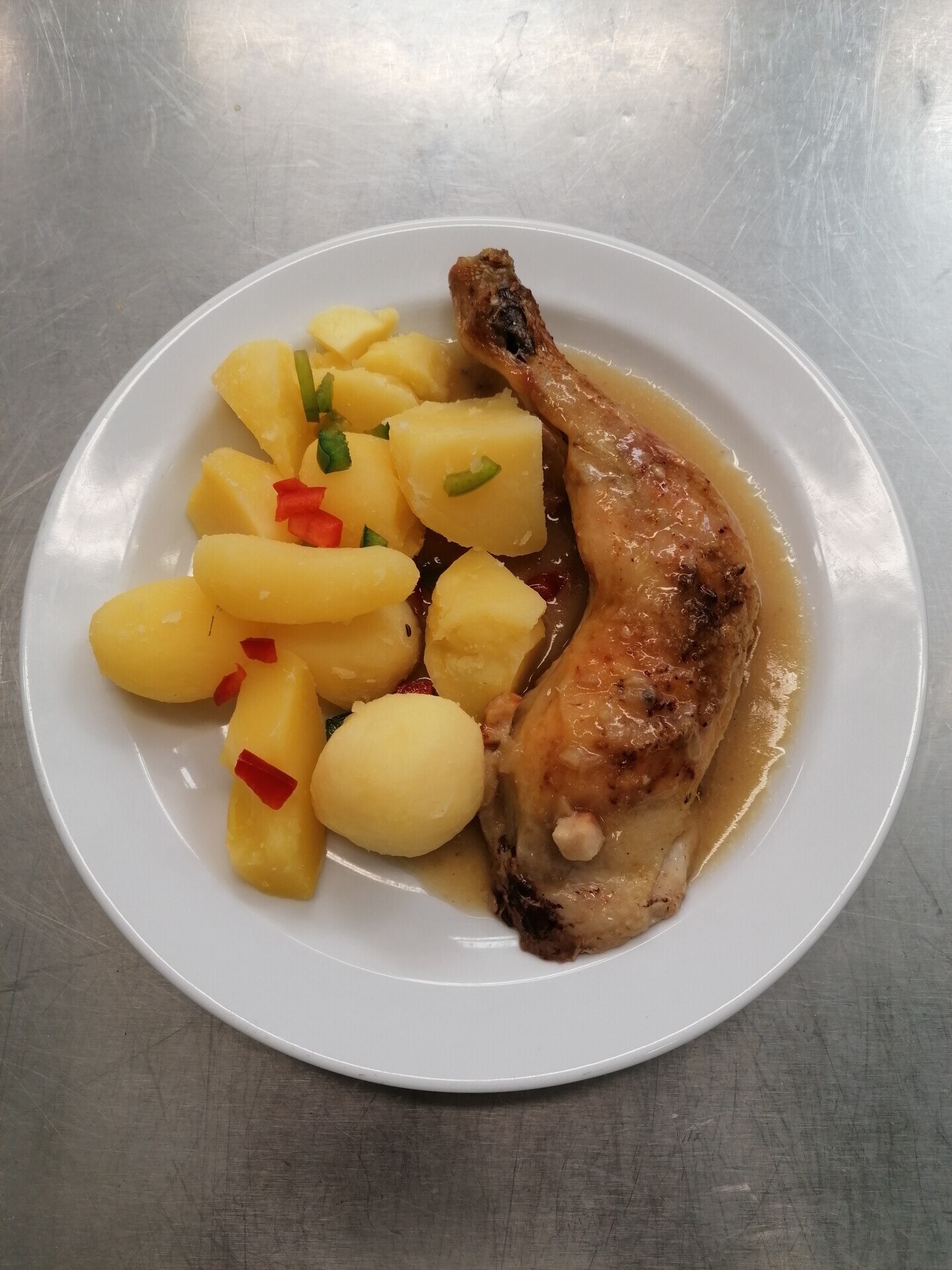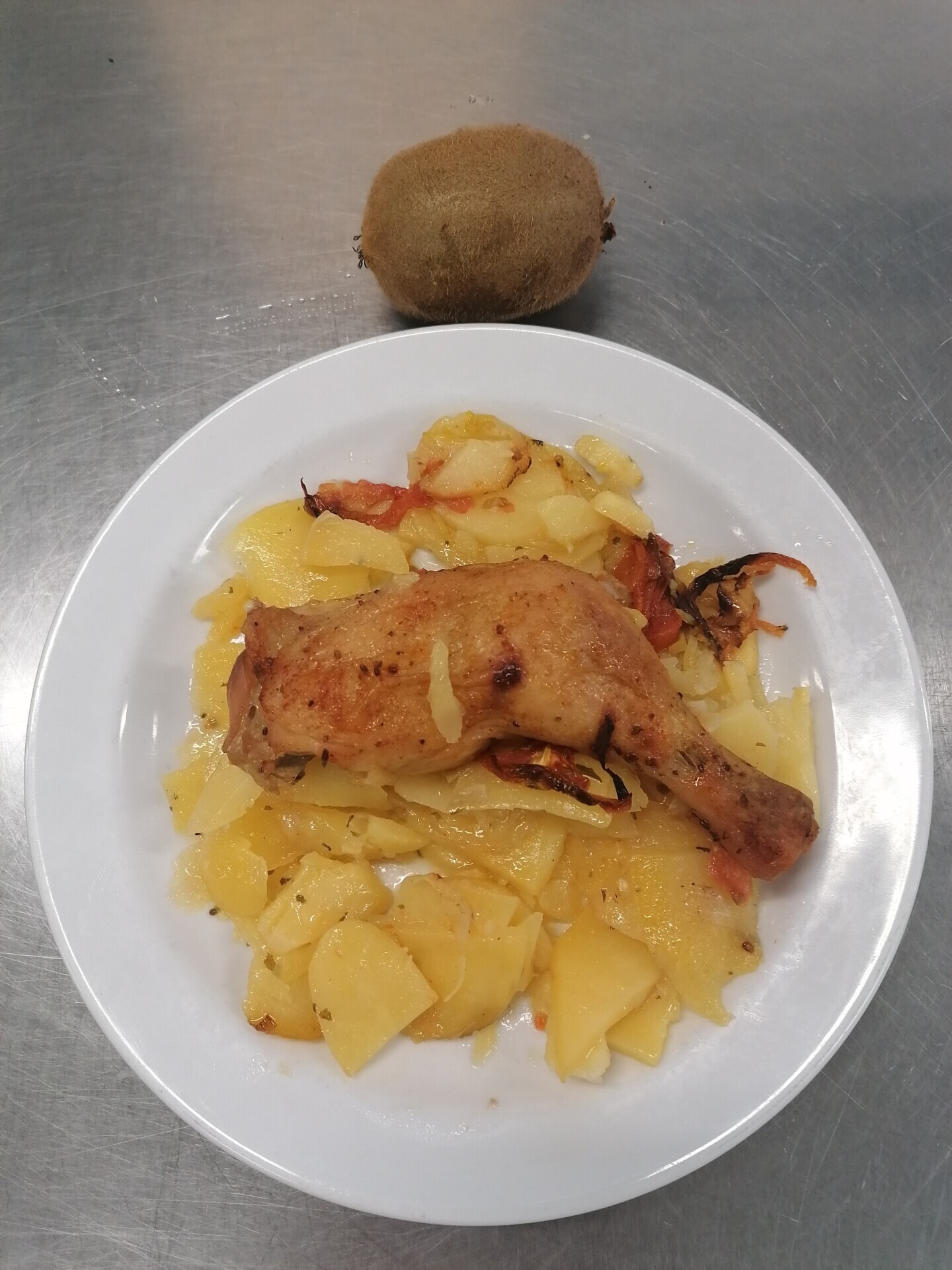 Zapečené brambory s rajčaty a kuřecím stehnem
