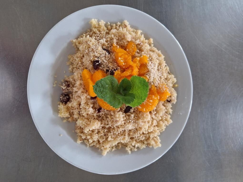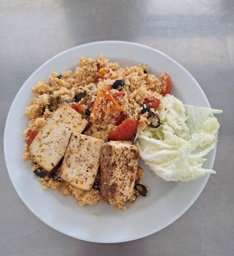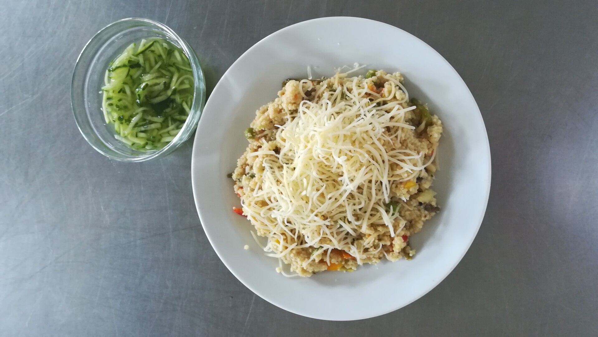 Zeleninové kuskusové rizoto se sýrem, okurkový salát