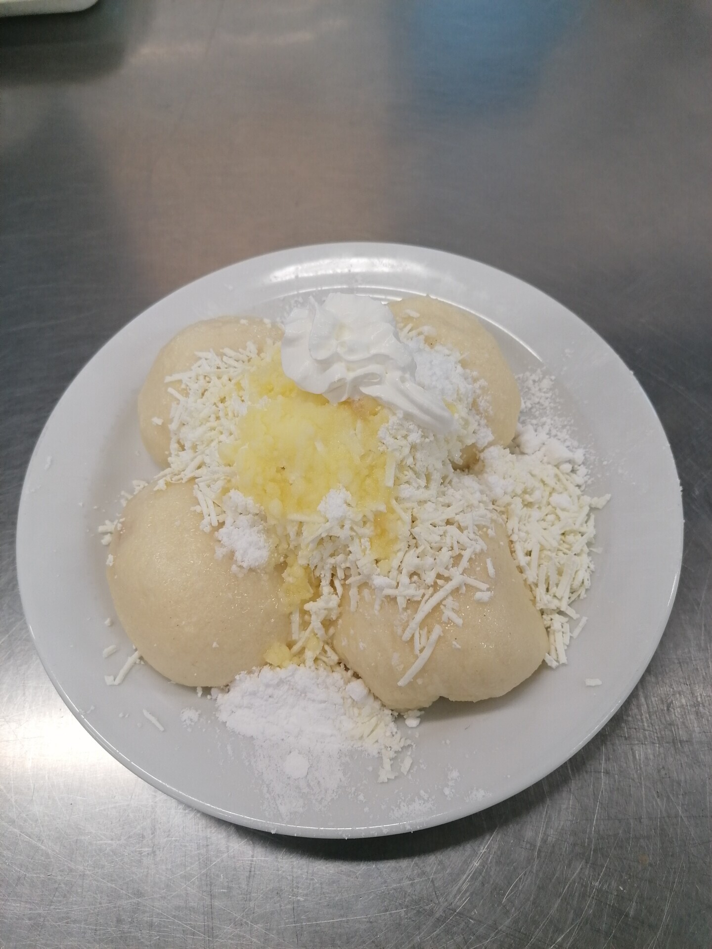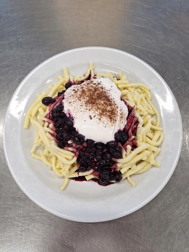 Alpský knedlík (kynutý knedlík plněný povidly, vanilkové šodo, makový posyp)