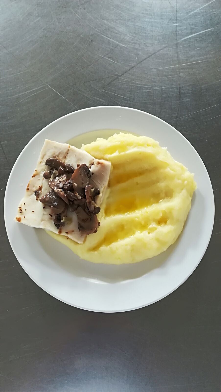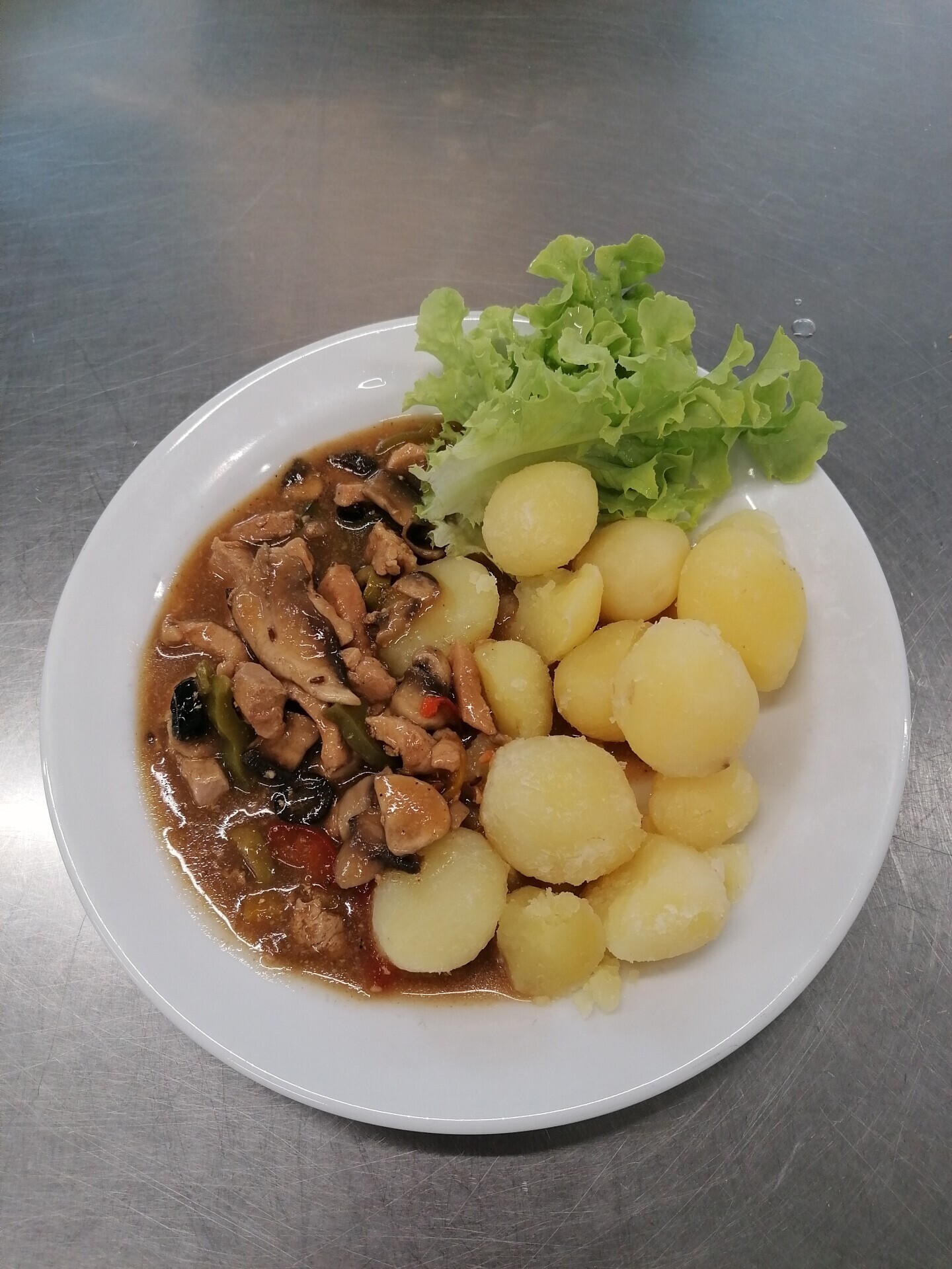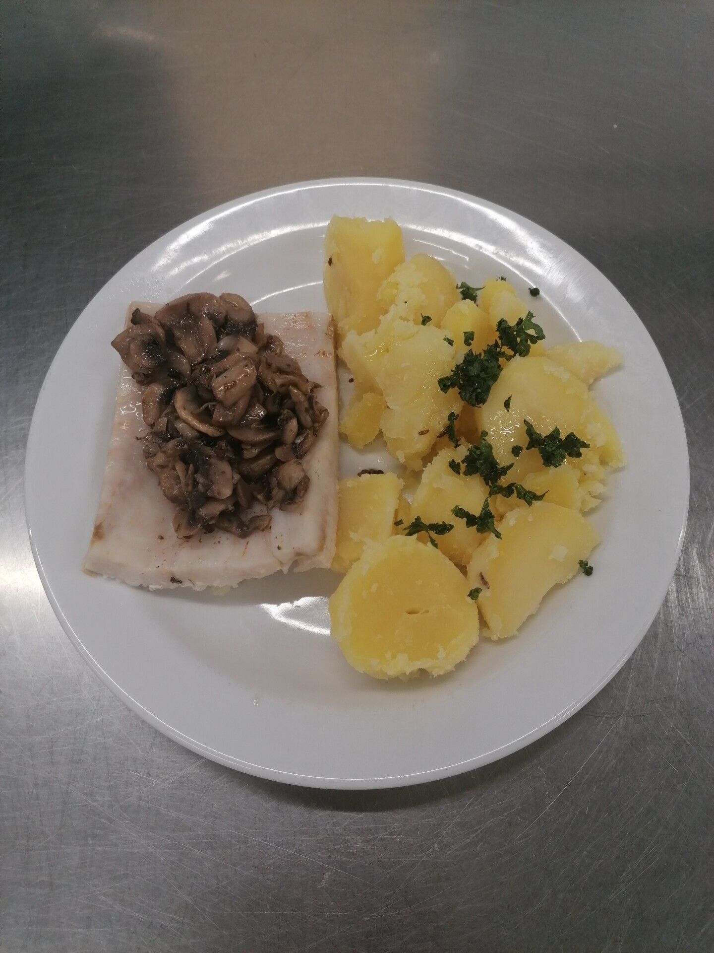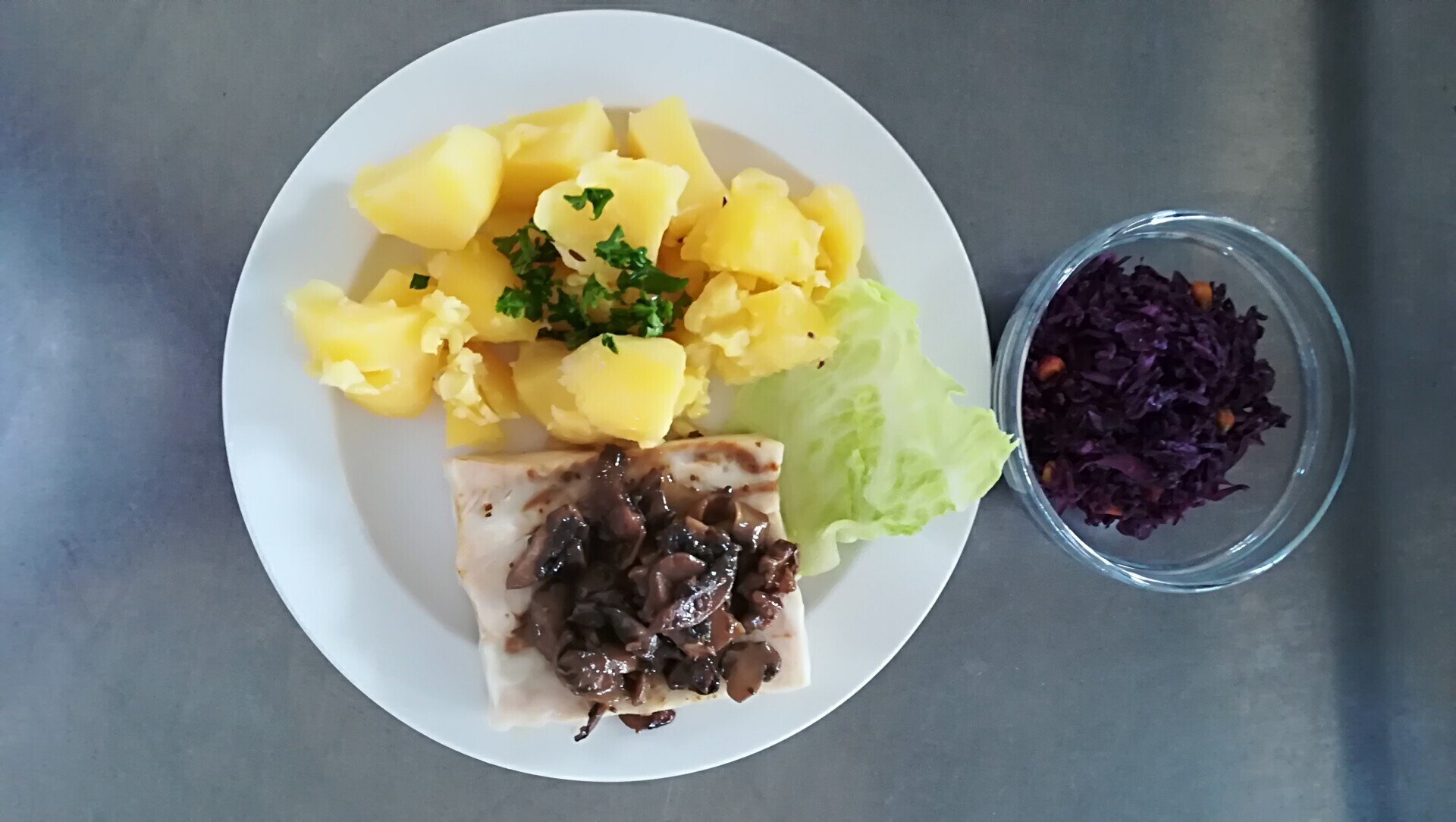 Vepřový plátek na houbách, vařený brambor