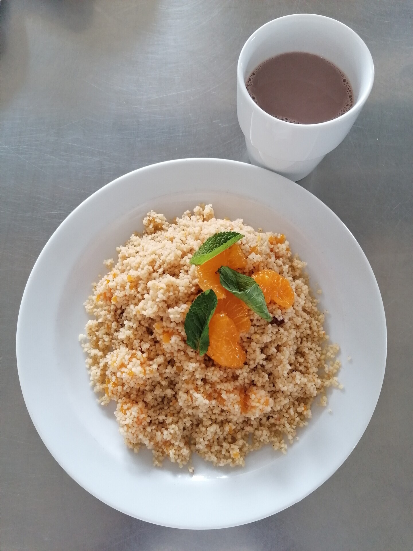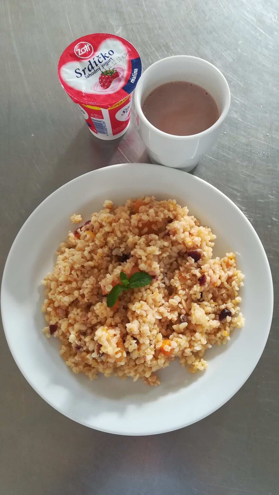 Bulgur s ovocem a medem (brusinky, dýně, rozinky, mandle), ochucené mléko
