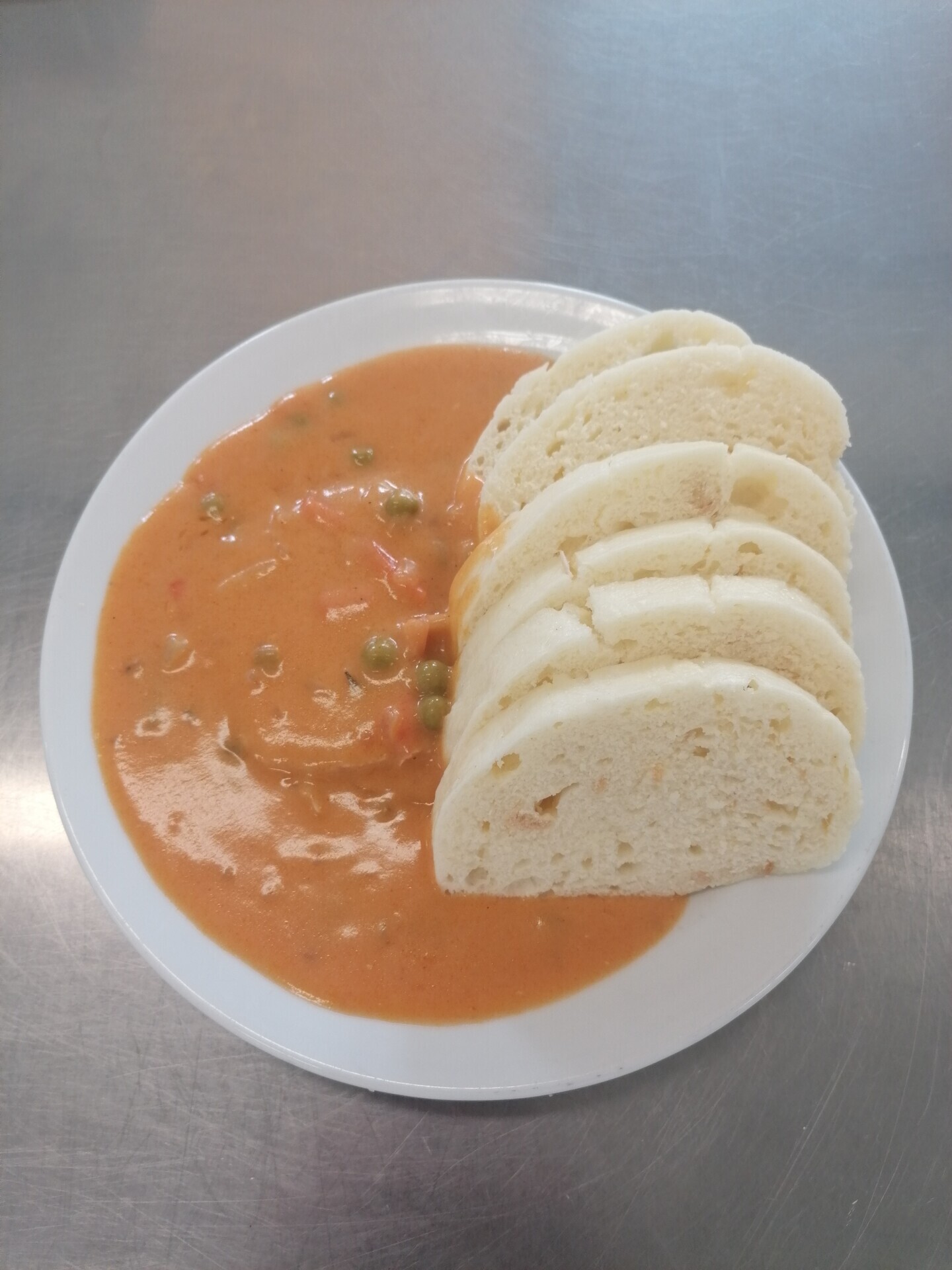 Zbojnický guláš (hrášek, houby, rajčata, klobása, paprika), bramborový knedlík