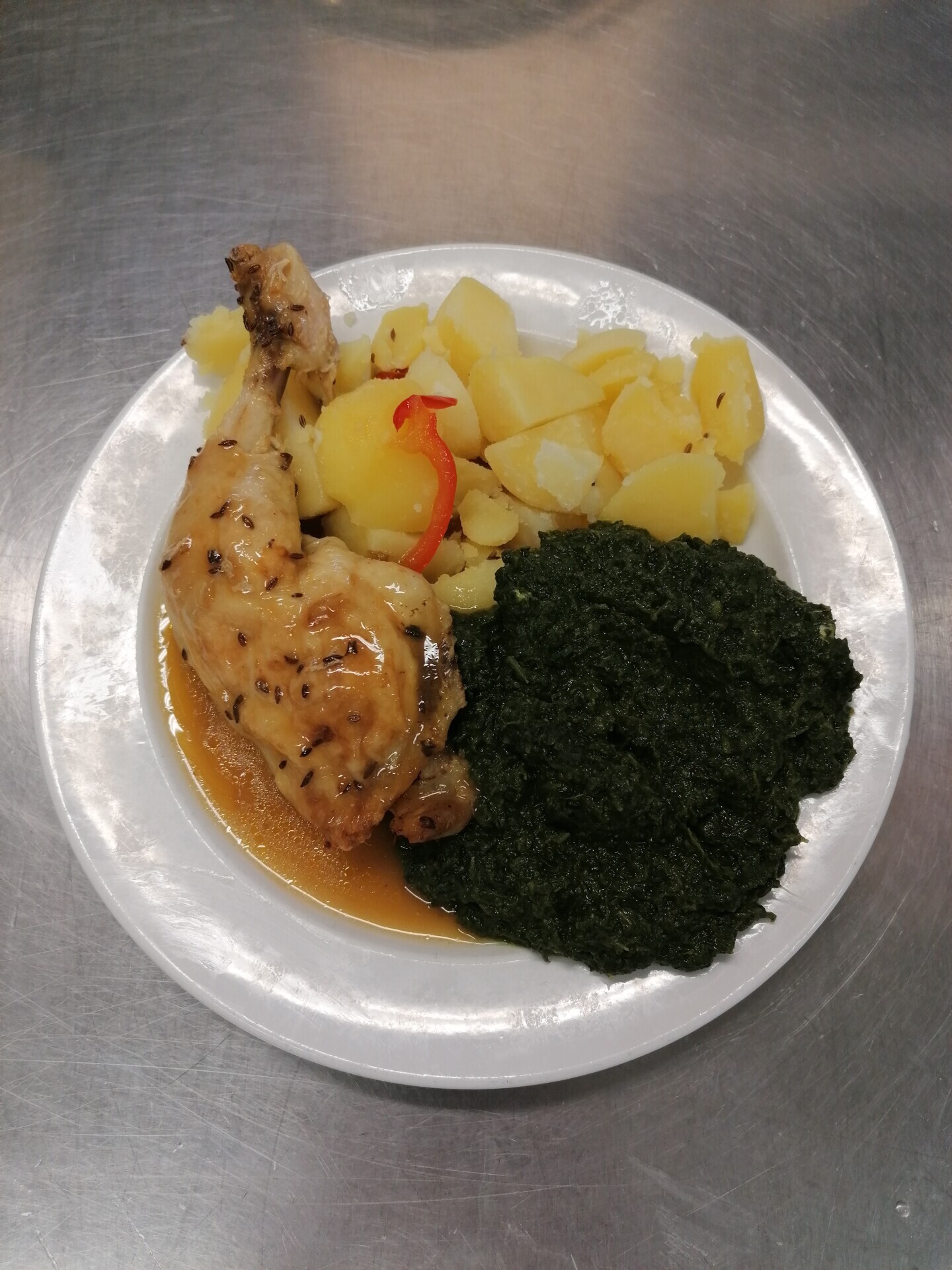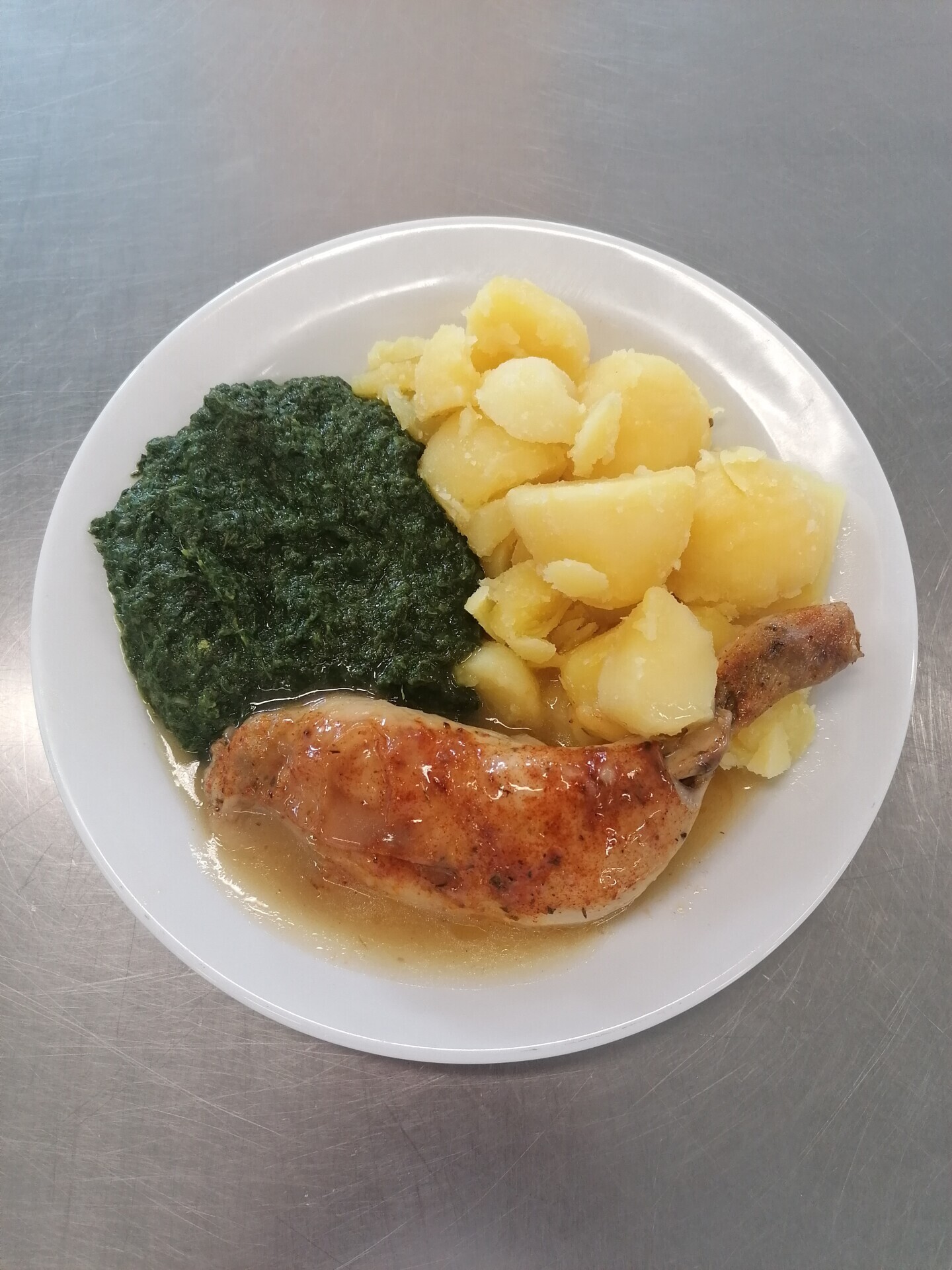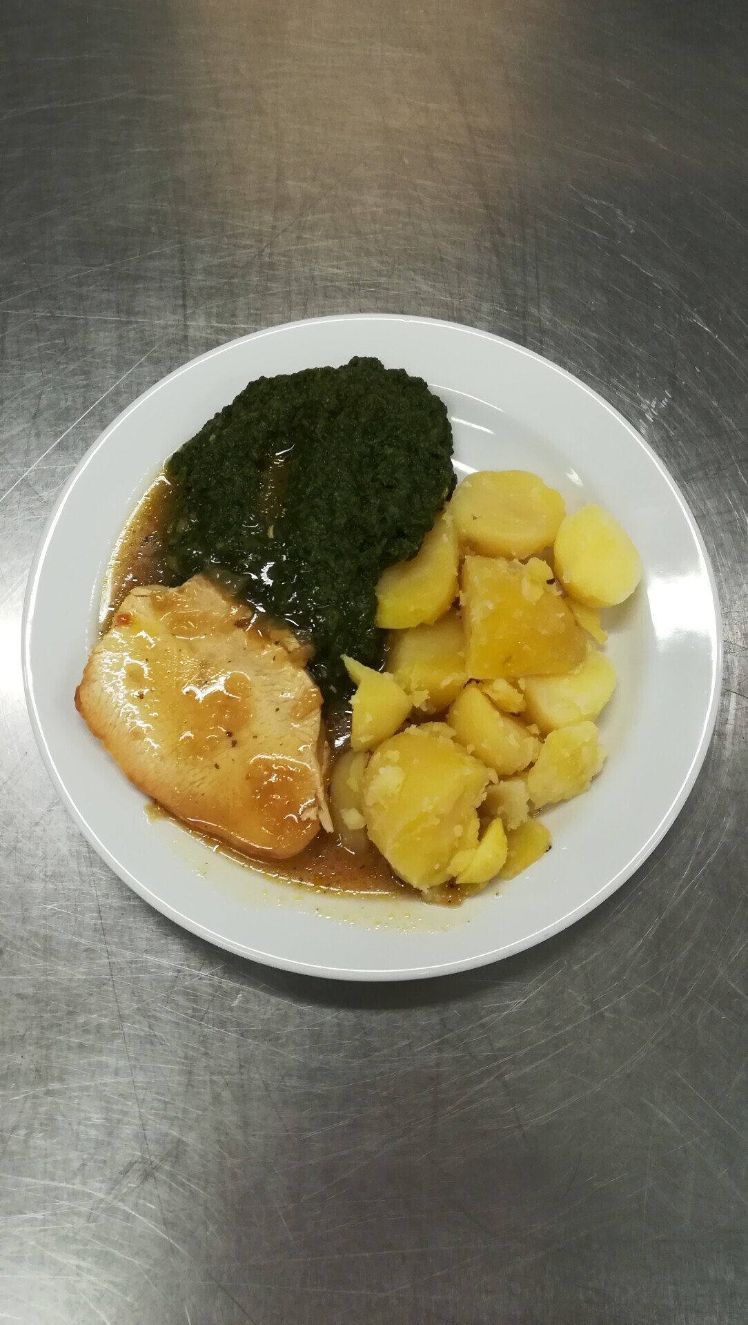 Bramborové krokety se šunkou, dušený špenát