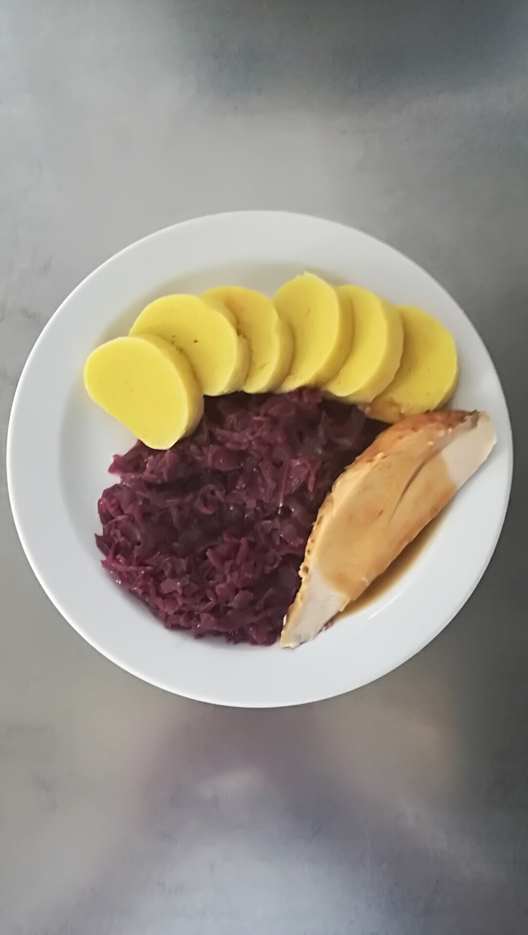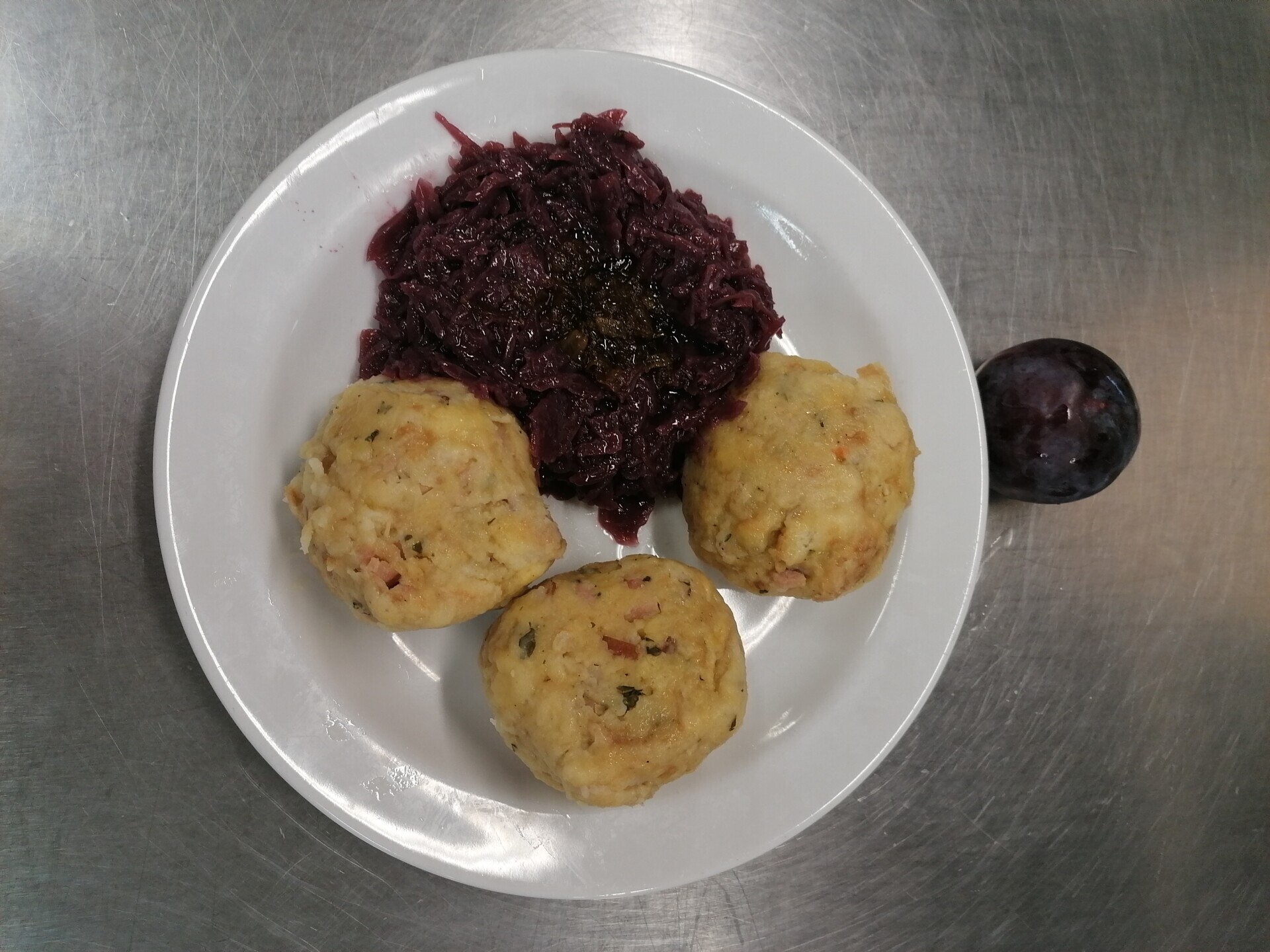 Bramborové knedlíky plněné uzeným masem s pohankou, dušené červené zelí