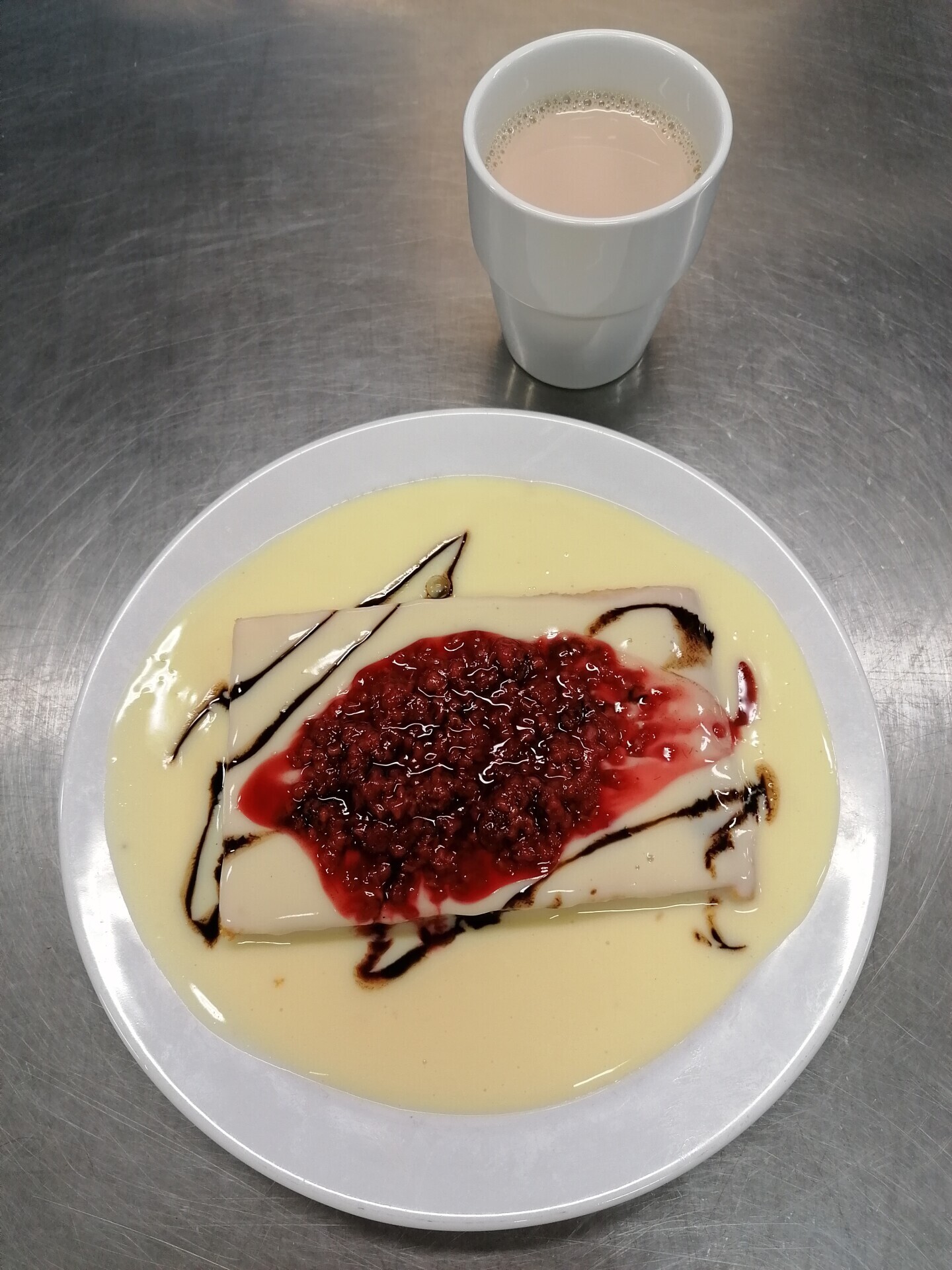 Bublanina s vanilkovým krémem, malinový přeliv, ochucené mléko