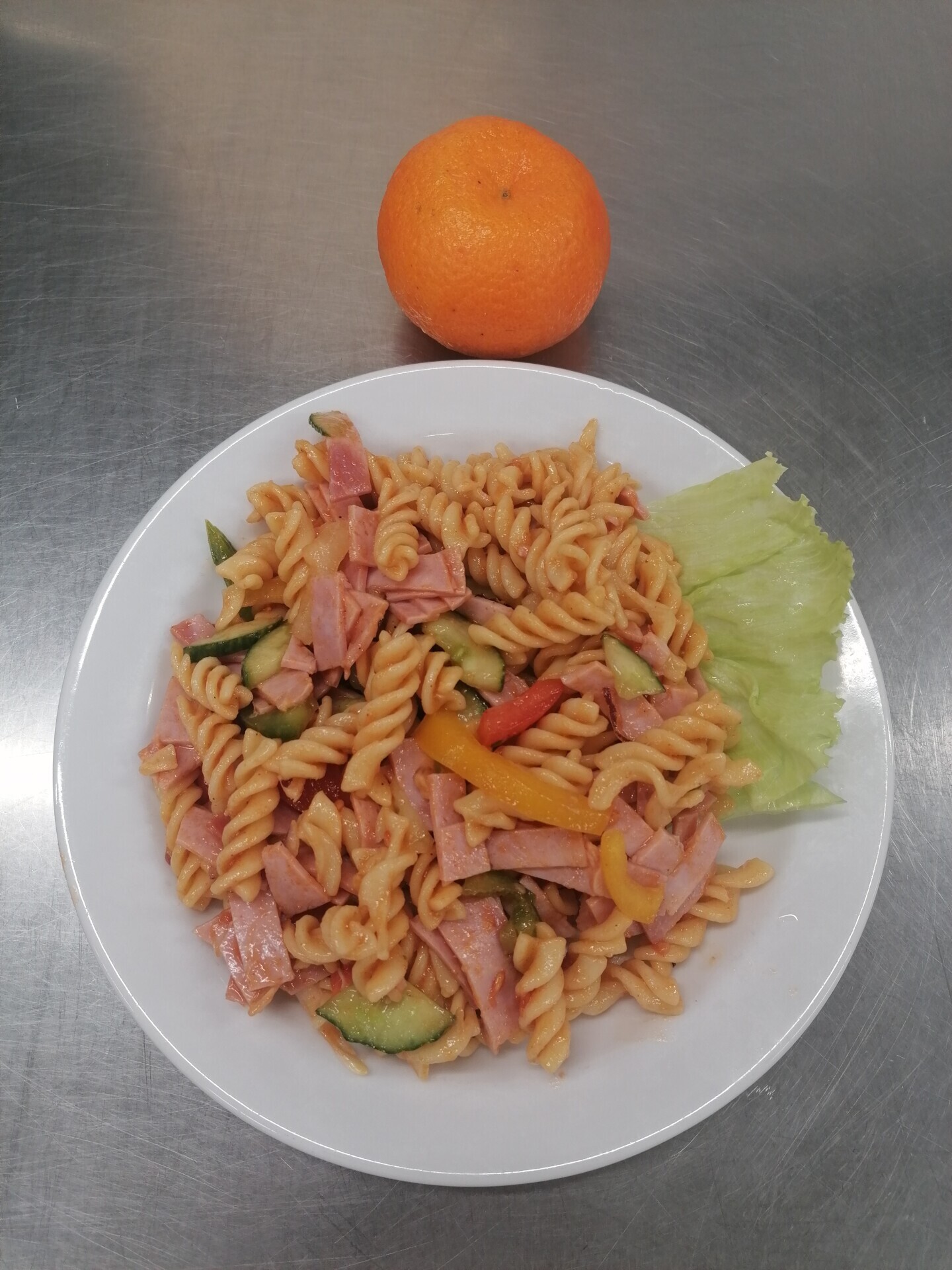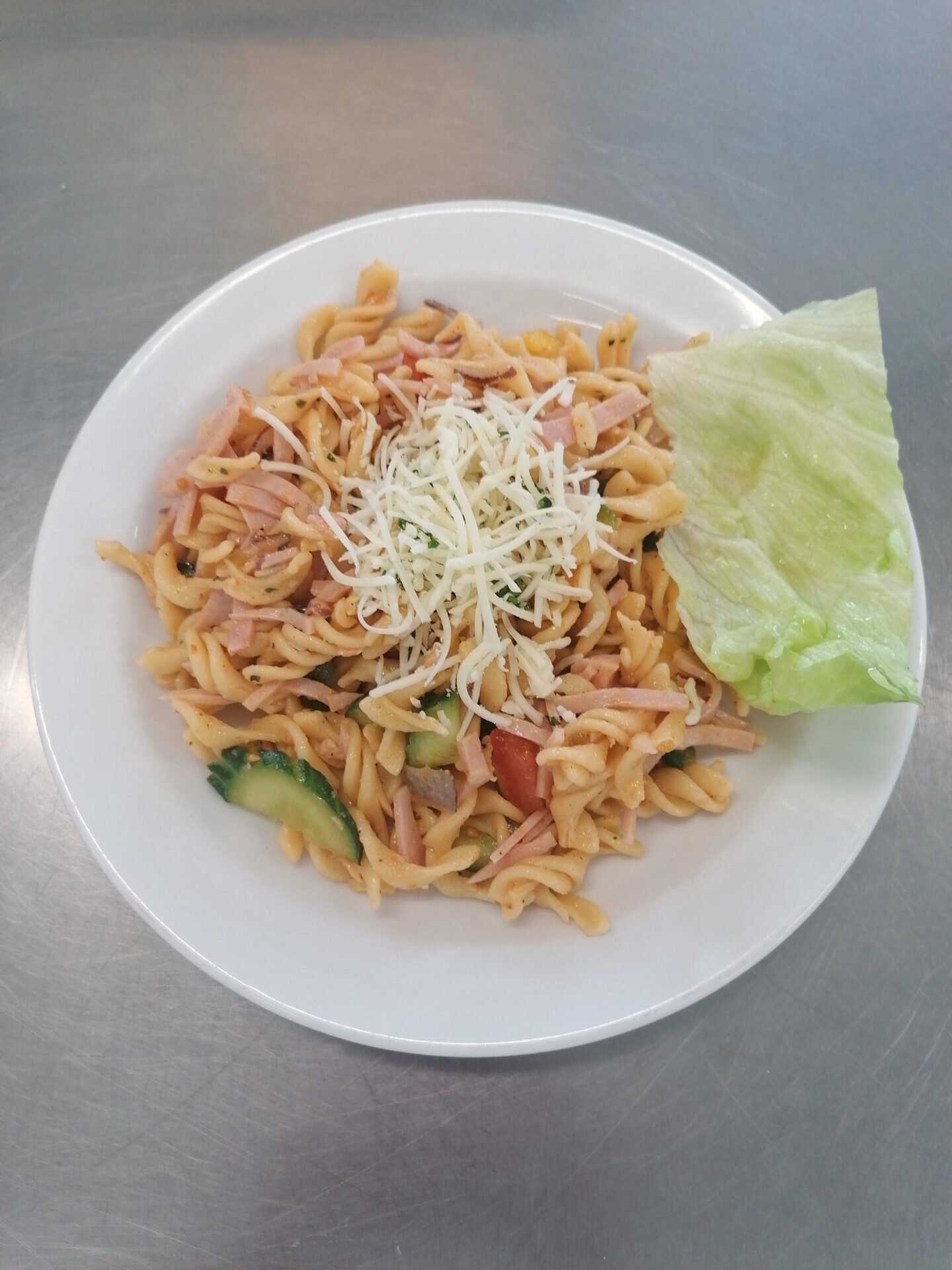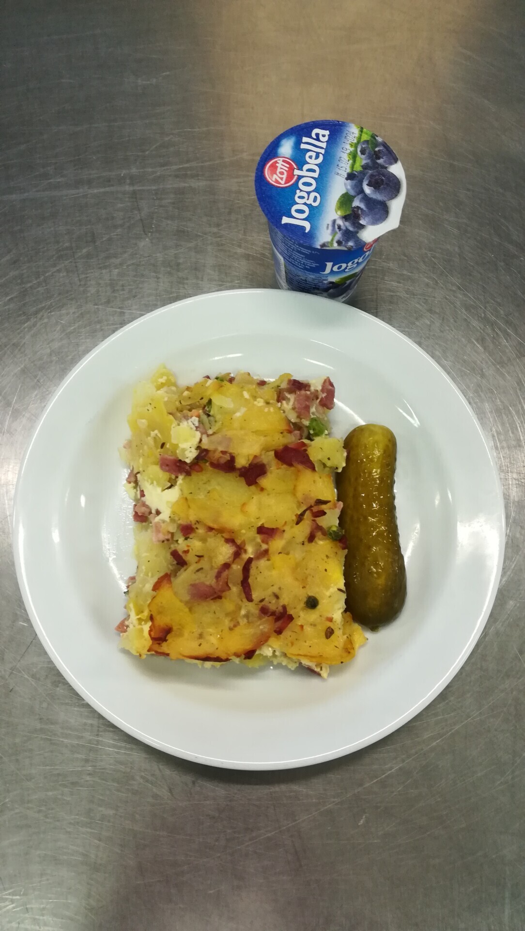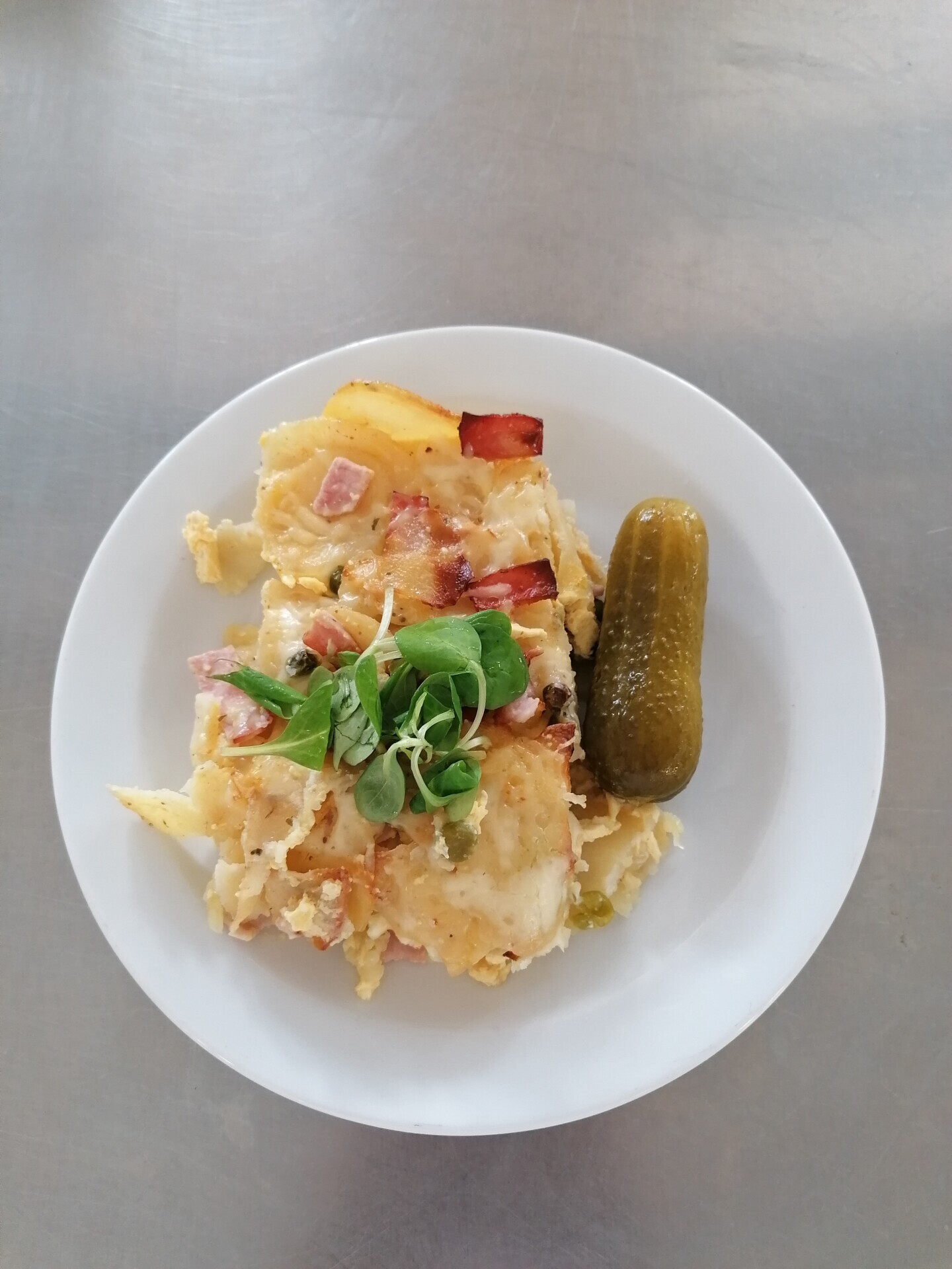 Zapečené těstoviny s uzeným masem, sterilovaná okurka