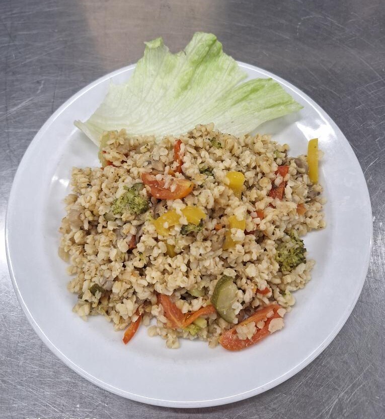 Bulgur s hlívou ústřičnou, brokolicí, paprikou, cuketou a rajčaty