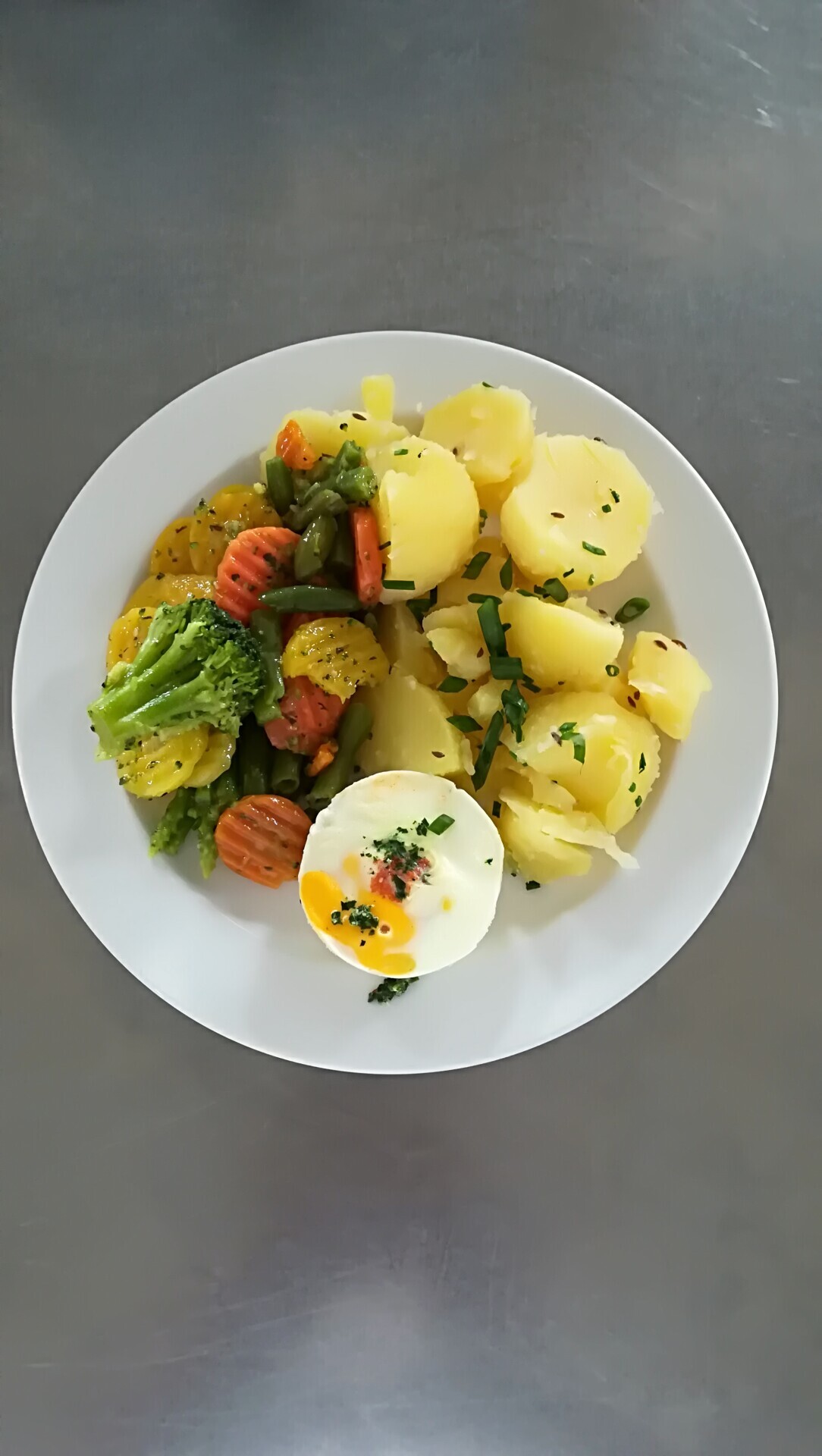 Dušená Baby mrkev s hráškem na másle, vařené vejce, vařený brambor