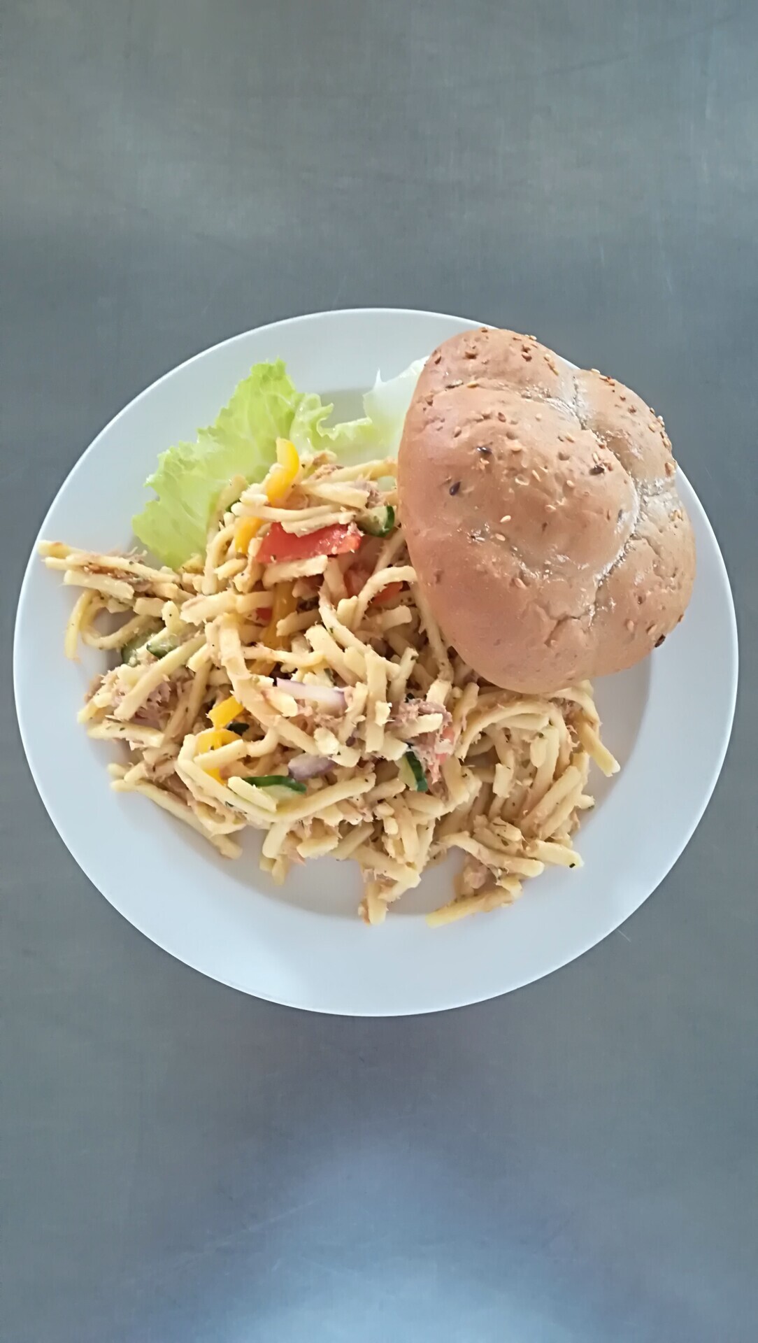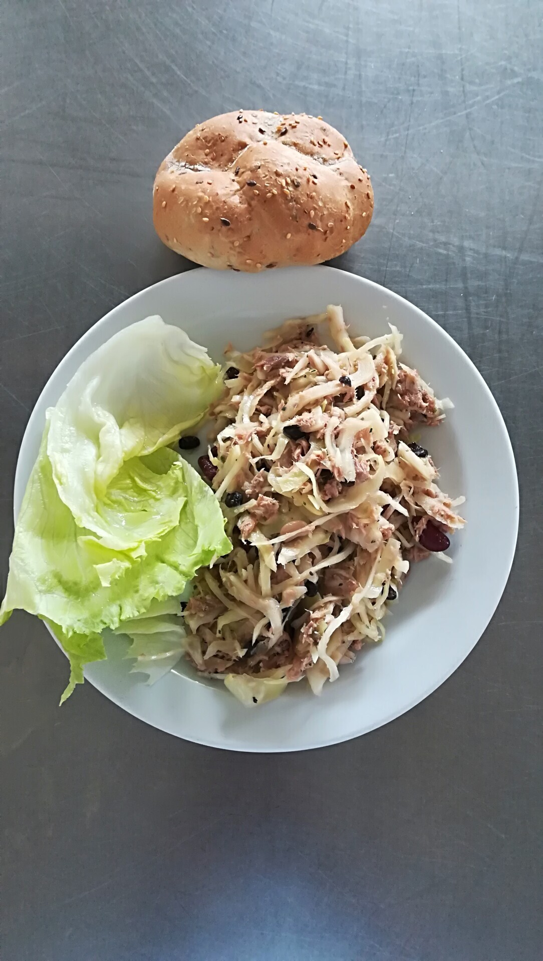 Zelný salát s červenou fazolí, tuňákem a zázvor.emulzí, cereální houska